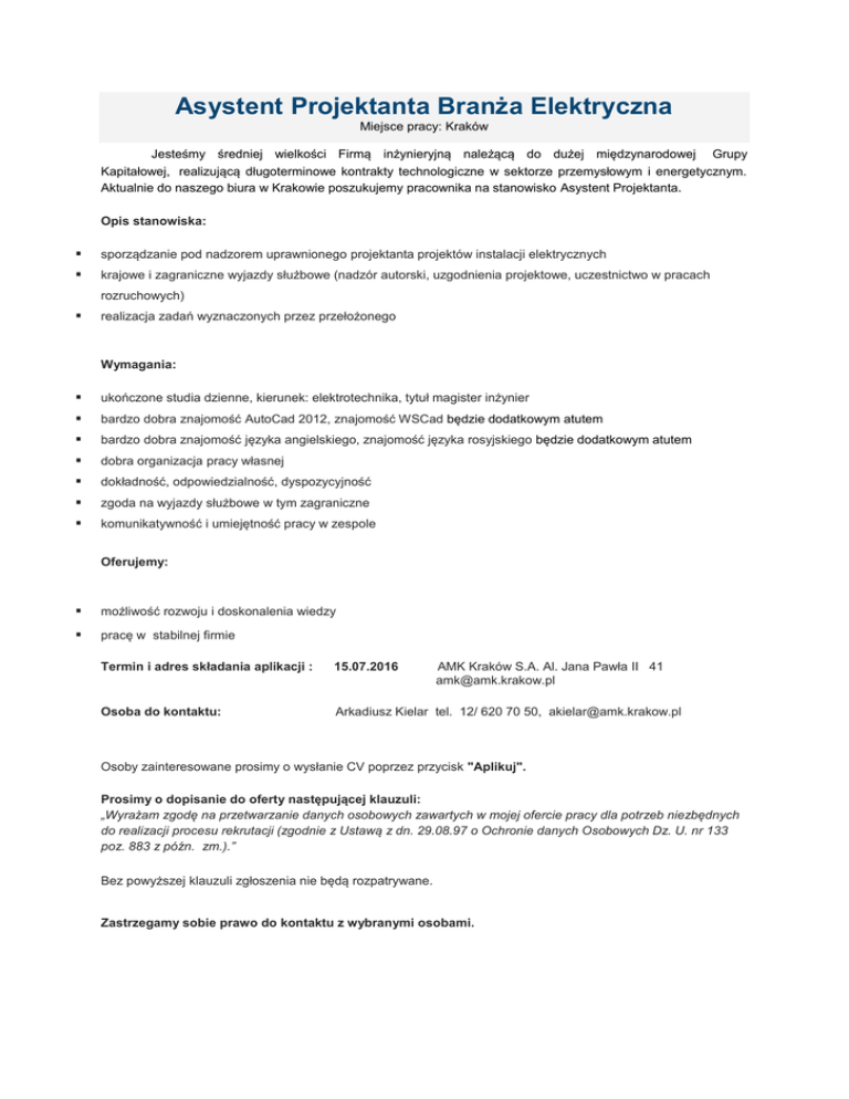 Asystent Projektanta Branża Elektryczna Miejsce pracy: Kraków Jesteśmy średniej wielkości Firmą inżynieryjną należącą do dużej międzynarodowej Grupy Kapitałowej, realizującą długoterminowe kontrakty technologiczne w sektorze przemysłowym i energetycznym. Aktualnie do naszego biura w Krakowie poszukujemy pracownika na stanowisko Asystent Projektanta. Opis stanowiska: sporządzanie pod nadzorem uprawnionego projektanta projektów instalacji elektrycznych krajowe i zagraniczne wyjazdy służbowe (nadzór autorski, uzgodnienia projektowe, uczestnictwo w pracach rozruchowych) realizacja zadań wyznaczonych przez przełożonego Wymagania: ukończone studia dzienne, kierunek: elektrotechnika, tytuł magister inżynier bardzo dobra znajomość AutoCad 2012, znajomość WSCad będzie dodatkowym atutem bardzo dobra znajomość języka angielskiego, znajomość języka rosyjskiego będzie dodatkowym atutem dobra organizacja pracy własnej dokładność, odpowiedzialność, dyspozycyjność zgoda na wyjazdy służbowe w tym zagraniczne komunikatywność i umiejętność pracy w zespole Oferujemy: możliwość rozwoju i doskonalenia wiedzy pracę w stabilnej firmie Termin i adres składania aplikacji : 15.07.2016 AMK Kraków S.A. Al. Jana Pawła II 41 [email protected] Osoba do kontaktu: Arkadiusz Kielar tel. 12/ 620 70 50, [email protected] Osoby zainteresowane prosimy o wysłanie CV poprzez przycisk "Aplikuj". Prosimy o dopisanie do oferty następującej klauzuli: „Wyrażam zgodę na przetwarzanie danych osobowych zawartych w mojej ofercie pracy dla potrzeb niezbędnych do realizacji procesu rekrutacji (zgodnie z Ustawą z dn. 29.08.97 o Ochronie danych Osobowych Dz. U. nr 133 poz. 883 z późn. zm.).” Bez powyższej klauzuli zgłoszenia nie będą rozpatrywane. Zastrzegamy sobie prawo do kontaktu z wybranymi osobami.