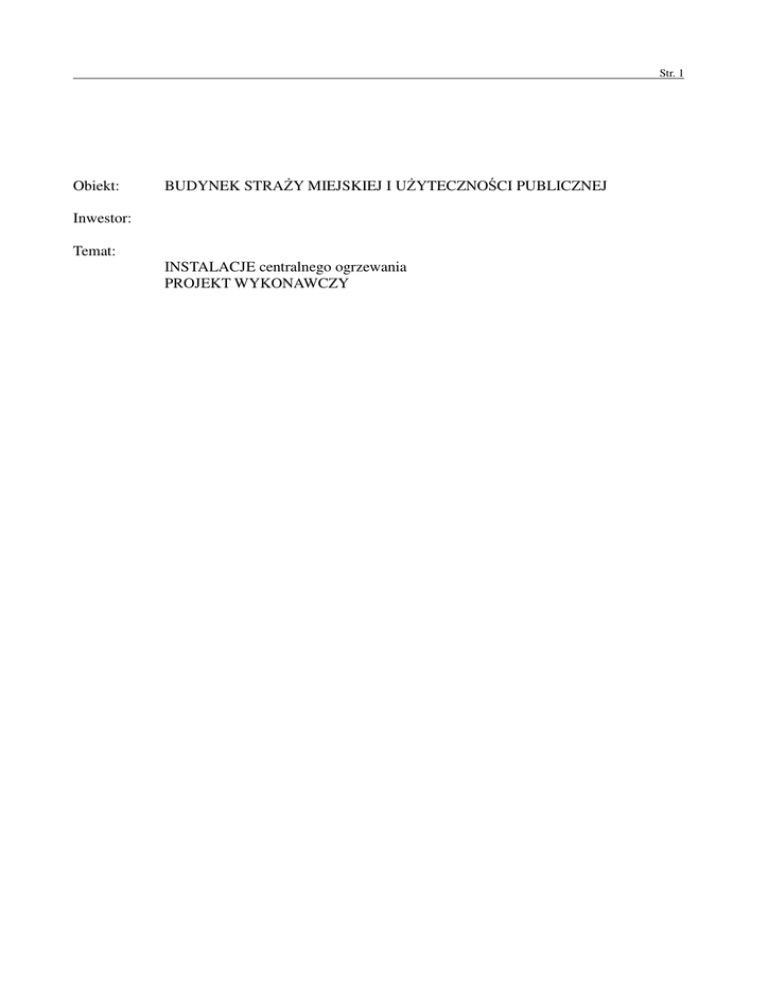 Str. 1 Obiekt: BUDYNEK STRAŻY MIEJSKIEJ I UŻYTECZNOŚCI PUBLICZNEJ Inwestor: Temat: INSTALACJE centralnego ogrzewania PROJEKT WYKONAWCZY Str. 2 SPIS TREŚCI: 1. Wstęp...........................................................................................................................................3 1.1. Przedmiot i zakres opracowania...........................................................................................3 1.2. Założenia..............................................................................................................................3 1.3. Opis stanu istniejącego.........................................................................................................3 2. Opis instalacji c.o.........................................................................................................................4 3. Wytyczne wykonania i montażu....................................................................................................4 4. Obliczenia....................................................................................................................................4 4.1. Obliczeniowe zapotrzebowanie ciepła. Dobór grzejników.....................................................4 4.2. Obliczenia hydrauliczne instalacji c.o....................................................................................7 5.Informacja bioz..............................................................................................................................8 5.1. Zakres robót..........................................................................................................................8 5.2. Istniejące obiekty budowlane................................................................................................8 5.3. Elementy zagospodarowania terenu stwarzające zagrożenie bezpieczeństwa.....................8 5.5. Sposób instruktażu pracowników..........................................................................................8 5.6. Środki zapobiegające niebezpieczeństwom..........................................................................8 SPIS RYSUNKÓW: 1. Rzut parteru- instalacja c.o 2. Rzut I piętra- instalacja c.o rys. nr 1 rys. nr 2 Str. 3 1. WSTĘP 1.1. Przedmiot i zakres opracowania Przedmiotem niniejszego opracowania jest projekt instalacji ogrzewania w budynku usługowym i nowo budowanym budynku Straży Miejskiej w Bełchatowie przy ul. Kościuszki 15. W zakres opracowania wchodzi: • obliczenia zapotrzebowania ciepła budynku • dobór grzejników • obliczenia związane z wymiarowaniem orurowania • projekt rozmieszczenia przewodów • zestawienie materiałów 1.2. Założenia Projekt wykonano na podstawie: • uzgodnień z Inwestorem • obowiązujących norm i przepisów z zakresu objętego opracowaniem. 1.3. Opis stanu istniejącego Budynek usługowo - mieszkalny jest budynkiem istniejącym, który zostanie przebudowany i rozbudowany. Zostanie zmienione przeznaczenie pomieszczeń istniejącego budynku. Budynek istniejący jest jednopiętrowy niepodpiwniczony tak samo jak część dobudowywana. W dobudowanej części budynku będzie się mieściło pomieszczenie techniczne w którym będzie się mieścił węzeł. Projekt węzła cieplnego według odrębnego opracowania. Ciepło z węzła należy również doprowadzić do nagrzewnicy wentylacyjnej. Zasilanie nagrzewnicy ujęto w odrębnym opracowaniu. Str. 4 2. OPIS INSTALACJI C.O. W modernizowanym budynku usługowym oraz budynku Straży Miejskiej w Bełchatowie przewidziano ogrzewanie wodne o parametrach obliczeniowych wody grzewczej 75/550C . Woda grzewcza będzie doprowadzona z węzła cieplnego ujętego w odrębnym opracowaniu. Przewody c.o. wykonać z rur PE-Xc do c.o. Przewody należy izolować otuliną dla instalacji podtynkowych thermocompact S grubości 9 mm i prowadzić w podłogach. Minimalna warstwa posadzki lub tynku nad rurą powinna wynosić 3 do 4 cm. Trasy przewodów pokazano na rysunkach. Na każdej gałęzi zasilającej dane piętro przewidziano zawory odcinające. Należy zapewnić łatwy dostęp do zaworów poprzez pokrywę zamykającą w posadzce. Podparcia i mocowanie przewodów wykonać zgodnie z wymaganiami producenta rur. W najwyższych punktach instalacji przewidziano automatyczne odpowietrzniki. We wszystkich ogrzewanych pomieszczeniach dobrano grzejniki stalowe płytowe. Grzejniki wyposażone będą w zawory termostatyczne i zawory odcinające oraz odpowietrzniki. Podejścia do grzejników przewidziano z podłączeniem dolnym typu CV. 3. WYTYCZNE WYKONANIA I MONTAŻU Instalację c.o. należy wykonać z rur PE-Xc do c.o. Przewody prowadzić w podłodze Minimalna warstwa posadzki lub tynku nad rurą powinna wynosić odpowiednio 4 i 3 cm. zolacje cieplne przewodów wykonać z otulin thermacompact. Izolacje wykonywać po próbach szczelności i zabezpieczeniu antykorozyjnym przewodów. Armatura powinna być montowana w miejscach dostępnych, zgodnie z zaleceniami producenta. Grzejniki należy montować zgodnie z wymaganiami producenta grzejników. Podejścia do grzejników wykonać z podłączeniem dolnym. Grzejniki płytowe mocować min 10cm od podłogi. Wykonaną instalację należy przepłukać i poddać próbom szczelności. Przed próbami instalację należy napełnić wodą i dokładnie odpowietrzyć. Kontrolować szczelność połączeń z armaturą. Ciśnienie próbne w instalacji powinno być wyższe o 2 bary od ciśnienia roboczego , jednak nie niższe niż 4 bary. Wszystkie zastosowane materiały winny mieć wymagane przepisami certyfikaty i dopuszczenia do stosowania w budownictwie. Wszystkie prace wykonawcze należy prowadzić zgodnie z „Warunkami technicznymi wykonania i odbioru instalacji ogrzewczych” zeszyt 6, wydawnictwo COBRTI Instal z 2003r. Wszystkie zastosowane materiały i urządzenia powinny posiadać wymagane przepisami dopuszczenia i deklaracje. 4. OBLICZENIA 4.1. Obliczeniowe zap