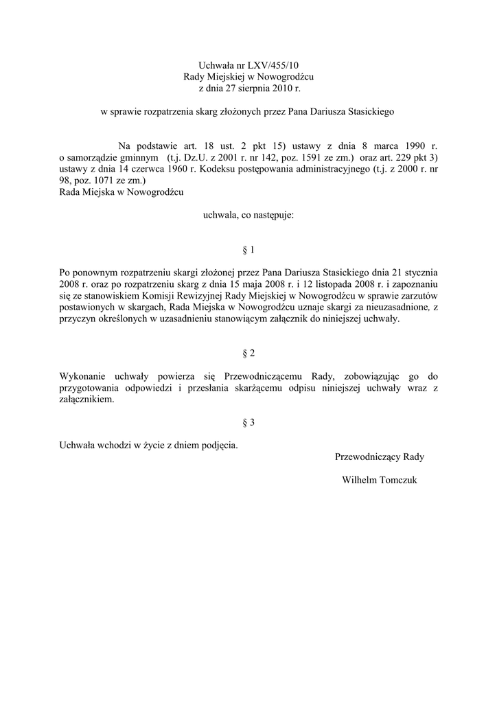Uchwała nr LXV/455/10 Rady Miejskiej w Nowogrodźcu z dnia 27 sierpnia 2010 r. w sprawie rozpatrzenia skarg złożonych przez Pana Dariusza Stasickiego Na podstawie art. 18 ust. 2 pkt 15) ustawy z dnia 8 marca 1990 r. o samorządzie gminnym (t.j. Dz.U. z 2001 r. nr 142, poz. 1591 ze zm.) oraz art. 229 pkt 3) ustawy z dnia 14 czerwca 1960 r. Kodeksu postępowania administracyjnego (t.j. z 2000 r. nr 98, poz. 1071 ze zm.) Rada Miejska w Nowogrodźcu uchwala, co następuje: §1 Po ponownym rozpatrzeniu skargi złożonej przez Pana Dariusza Stasickiego dnia 21 stycznia 2008 r. oraz po rozpatrzeniu skarg z dnia 15 maja 2008 r. i 12 listopada 2008 r. i zapoznaniu się ze stanowiskiem Komisji Rewizyjnej Rady Miejskiej w Nowogrodźcu w sprawie zarzutów postawionych w skargach, Rada Miejska w Nowogrodźcu uznaje skargi za nieuzasadnione, z przyczyn określonych w uzasadnieniu stanowiącym załącznik do niniejszej uchwały. §2 Wykonanie uchwały powierza się Przewodniczącemu Rady, zobowiązując go do przygotowania odpowiedzi i przesłania skarżącemu odpisu niniejszej uchwały wraz z załącznikiem. §3 Uchwała wchodzi w życie z dniem podjęcia. Przewodniczący Rady Wilhelm Tomczuk Uzasadnienie do uchwały nr LXV/455/10 Rady Miejskiej w Nowogrodźcu z dnia 27 sierpnia 2010 r. Po ponownym rozpoznaniu i przeanalizowaniu skargi Pana Dariusza Stasickiego z dnia 21 stycznia 2008 roku na Burmistrza Nowogrodźca, wykonując zalecenie Wojewody Dolnośląskiego oraz dokonując rozstrzygnięcia skargi zawartej z dnia 15.05.2008 oraz w piśmie z dnia 12.11.2008 r. ustala i stwierdza się co następuje. Przedmiotem w/w skarg Pana Stasickiego są następujące zarzuty stawiane Burmistrzowi Nowogrodźca: 1) nieprawidłowość aktu notarialnego przenoszącego własność lokalu mieszkalnego położonego w Zebrzydowej nr 263d/1 najmowanego przez Pana Stasickiego na rzecz Gminy Nowogrodziec w zakresie jego treści, 2) brakiem przedłożenia przez Burmistrza Nowogrodźca dokumentów zrzeczenia się Pana Stasickiego prawa pierwszeństwa z zakresie lokalu nabytego przez Gminę Nowogrodziec, 3) naruszenia przez Burmistrza Nowogrodźca praw nabytych przez Pana Stasickiego związanych z prawem pierwszeństwa w zakresie nabycia od Nadleśnictwa Węgliniec lokalu przez Niego najmowanego, a co za tym idzie nabycia przez Gminę lokalu mieszkalnego najmowanego przez skarżącego z naruszeniem prawa, 4) bezczynności Burmistrza Nowogrodźca w zakresie rozpoznawania pism i wniosków skarżącego, 5) brak informacji ze strony Burmistrza Nowogrodźca o zamiarze nabycia przez Gminę Nowogrodziec lokalu najmowanego przez skarżącego. Ponadto skarżący wnosi do Rady Miejskiej w Nowogrodźcu o podjęcie działań mających na celu unieważnienie aktu notarialnego przenoszącego własność lokalu mieszkalnego położonego w Zebrzydowej nr 263d/1 najmowanego przez Pana Stasickiego na rzecz Gminy Nowogrodziec Odnosząc się do twierdzeń skarżącego zawartych w skardze Rada Miejska w Nowogrodźcu stwierdza co następuje. Powyższe skargi Pana Stasickiego są bezzasadne, z uwagi na następujące okoliczności. Uregulowanie zawarte w art. 227 ustawy Kodeks postępowania administracyjnego stanowi, iż: przedmiotem skargi może być w szczególności zaniedbanie lub nienależyte wykonywanie zadań przez właściwe organy albo przez ich pracowników, naruszenie praworządności lub interesów skarżących, a także przewlekłe lub biurokratyczne załatwianie spraw. Powyższy przepis zakreśla granice materialnego rozpoznania skargi na Burmistrza Nowogrodźca. Dokonując ustaleń faktycznych występujących w sprawie stwierdzono, co następuje. 1.Ustalenie ewentualnych nieprawidłowości treści aktu notarialnego przenoszącego poprzez darowiznę własność lokalu położonego leży poza kompetencją Rady Miejskiej, albowiem dotyczy zarzucanej przez skarżącego nieprawidłowości w zakresie treści aktu notarialnego, a więc wykonywania obowiązków związanych ze sporządzeniem aktu notarialnego przez uprawnionego notariusza. Nieprawidłowości, w tym nieważność samego aktu podlegają rozpoznaniu na drodze postępowania cywilnego przez właściwy Sąd. Rada Miejska nie posiada w tym zakresie żadnych kompetencji. Jednocześnie Rada Miejska w Nowogrodźcu nie dopatrzyła się naruszenia prawa w tym zakresie przez Burmistrza Nowogrodźca, który nie mógł wnioskować o ujęcie w treści aktu notarialnego kwestii związanej z ewentualnym prawem pierwszeństwa po stronie Pana Stasickiego. Z oczywistych względów wiedzę i dokumenty w tym zakresie na dzień sporządzenia aktu notarialnego posiadał jedynie wyłącznie darczyńca tj. Skarb Państwa Nadleśnictwo Węgliniec. Tak więc kwestia ujęcia ewentualnych zastrzeżeń Pana Stasickiego leżała po stronie darczyńcy. Gmina nie ma podstaw, aby ingerować w przedmiotową kwestię. Ewentualne nieprawidłowości w tym zakresie może stanowić podstawę do roszczeń Pana Stasickiego wobec Nadleśnictwa Węgliniec nie zaś Gminy Nowogrodziec. Z uwagi na powyższe Rada Miejska nie dopatrzyła się w działaniach Burmistrza Nowogrodźca zarzucanego złamania prawa lub innych działań nielegalnych. Rada Miejska w Nowogrodźcu nie widzi też podstaw do wnioskowania do Burmistrza Nowogrodźca o podjęcie działań mających za cel stwierdzenie nieważności wskazywanego przez skarżącego aktu notarialnego, szczególnie w sytuacji, gdy skarżący jako osoba dowodząca, iż posiada w tym zakresie interes prawny może wystąpić samodzielnie z takim wnioskiem w drodze procesu cywilnego na podstawie art. 189 Kodeksu postępowania cywilnego w zw. z art. 58 Kodeksu cywilnego, jeżeli uznaje, iż rzeczywiście sporny akt notarialny jest nieważny. 2.Brak przedstawienia wymaganego w skardze dokumentu związanego z Pana prawem pierwszeństwa do lokalu mieszkalnego w Zebrzydowej wynika z tego, iż Gmina takim dokumentem nie dysponuje. Nadleśnictwo Węgliniec nie przedstawiło Burmistrzow