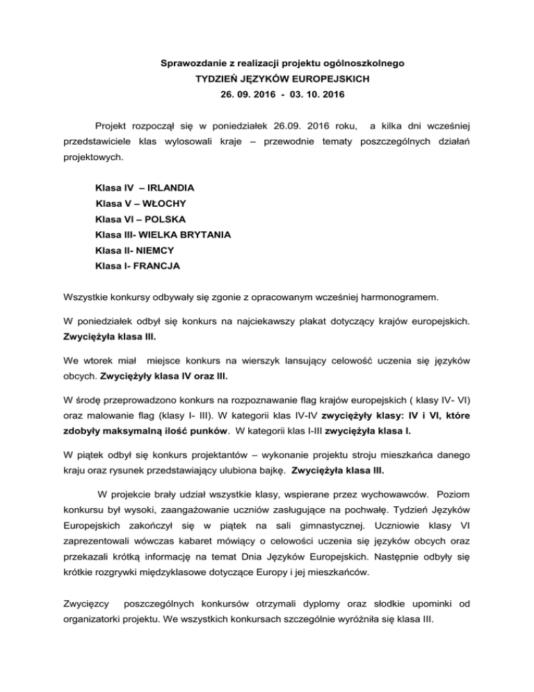 Sprawozdanie z realizacji projektu ogólnoszkolnego TYDZIEŃ JĘZYKÓW EUROPEJSKICH 26. 09. 2016 - 03. 10. 2016 Projekt rozpoczął się w poniedziałek 26.09. 2016 roku, a kilka dni wcześniej przedstawiciele klas wylosowali kraje – przewodnie tematy poszczególnych działań projektowych. Klasa IV – IRLANDIA Klasa V – WŁOCHY Klasa VI – POLSKA Klasa III- WIELKA BRYTANIA Klasa II- NIEMCY Klasa I- FRANCJA Wszystkie konkursy odbywały się zgonie z opracowanym wcześniej harmonogramem. W poniedziałek odbył się konkurs na najciekawszy plakat dotyczący krajów europejskich. Zwyciężyła klasa III. We wtorek miał miejsce konkurs na wierszyk lansujący celowość uczenia się języków obcych. Zwyciężyły klasa IV oraz III. W środę przeprowadzono konkurs na rozpoznawanie flag krajów europejskich ( klasy IV- VI) oraz malowanie flag (klasy I- III). W kategorii klas IV-IV zwyciężyły klasy: IV i VI, które zdobyły maksymalną ilość punków. W kategorii klas I-III zwyciężyła klasa I. W piątek odbył się konkurs projektantów – wykonanie projektu stroju mieszkańca danego kraju oraz rysunek przedstawiający ulubiona bajkę. Zwyciężyła klasa III. W projekcie brały udział wszystkie klasy, wspierane przez wychowawców. Poziom konkursu był wysoki, zaangażowanie uczniów zasługujące na pochwałę. Tydzień Języków Europejskich zakończył się w piątek na sali gimnastycznej. Uczniowie klasy VI zaprezentowali wówczas kabaret mówiący o celowości uczenia się języków obcych oraz przekazali krótką informację na temat Dnia Języków Europejskich. Następnie odbyły się krótkie rozgrywki międzyklasowe dotyczące Europy i jej mieszkańców. Zwycięzcy poszczególnych konkursów otrzymali dyplomy oraz słodkie upominki od organizatorki projektu. We wszystkich konkursach szczególnie wyróżniła się klasa III. Założone cele projektu zostały osiągnięte. Uczniowie chętnie pracowali, wykazali się dociekliwością i kreatywnością, rywalizowali ze sobą w zdrowy sposób, zarazem się integrując. Bohaterowie ulubionych bajek w wykonaniu klas II i I. Prezentacja krótkiej informacji na temat Dnia Języków Obcych. Rozgrywki na sali gimnastycznej podczas podsumowania Tygodnia Języków Europejskich. Rozgrywki na sali gimnastycznej podczas podsumowania Tygodnia Języków Europejskich. Wręczanie nagród zwycięzcom poszczególnych konkursów. Oprac. Katarzyna Braszczyńska
