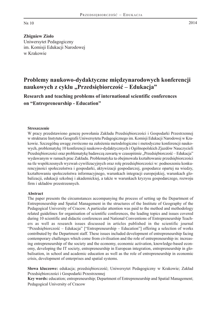 Przedsiębiorczość – Edukacja Nr 10 2014 Zbigniew Zioło Uniwersytet Pedagogiczny im. Komisji Edukacji Narodowej w Krakowie Problemy naukowo-dydaktyczne międzynarodowych konferencji naukowych z cyklu „Przedsiębiorczość – Edukacja” Research and teaching problems of international scientific conferences on “Entrepreneurship - Education” Streszczenie W pracy przedstawiono genezę powołania Zakładu Przedsiębiorczości i Gospodarki Przestrzennej w strukturze Instytutu Geografii Uniwersytetu Pedagogicznego im. Komisji Edukacji Narodowej w Kra kowie. Szczególną uwagę zwrócono na założenia metodologiczne i metodyczne konferencji naukowych, problematykę 10 konferencji naukowo-dydaktycznych i Ogólnopolskich Zjazdów Nauczycieli Przedsiębiorczości oraz problematykę badawczą zawartą w czasopiśmie „Przedsiębiorczość – Edukacja” wydawanym w ramach prac Zakładu. Problematyka ta obejmowała kształtowanie przedsiębiorczości na tle współczesnych wyzwań cywilizacyjnych oraz rolę przedsiębiorczości w: podnoszeniu konkurencyjności społeczeństwa i gospodarki, aktywizacji gospodarczej, gospodarce opartej na wiedzy, kształtowaniu społeczeństwa informacyjnego, warunkach integracji europejskiej, warunkach globalizacji, edukacji szkolnej i akademickiej, a także w warunkach kryzysu gospodarczego, rozwoju firm i układów przestrzennych. Abstract The paper presents the circumstances accompanying the process of setting up the Department of Entrepreneurship and Spatial Management in the structures of the Institute of Geography of the Pedagogical University of Cracow. A particular attention was paid to the method and methodology related guidelines for organisation of scientific conferences, the leading topics and issues covered during 10 scientific and didactic conferences and National Conventions of Entrepreneurship Teachers as well as research issues discussed in articles published in the scientific journal “Przedsiębiorczość – Edukacja” [“Entrepreneurship – Education”] offering a selection of works contributed by the Department staff. These issues included development of entrepreneurship facing contemporary challenges which come from civilisation and the role of entrepreneurship in: increasing entrepreneurship of the society and the economy, economic activation, knowledge-based economy, developing the IT society, entrepreneurship in European integration, entrepreneurship in globalisation, in school and academic education as well as the role of entrepreneurship in economic crisis, development of enterprises and spatial systems. Słowa kluczowe: edukacja; przedsiębiorczość; Uniwersytet Pedagogiczny w Krakowie; Zakład Przedsiębiorczości i Gospodarki Przestrzennej Key words: education; entrepreneurship; Department of Entrepreneurship and Spatial Management; Pedagogical University of Cracow Problemy naukowo-dydaktyczne międzynarodowych konferencji naukowych... 11 Wprowadzenie W procesie zmian systemu gospodarowania przejawiającego się we wdrażaniu reguł gospodarki rynkowej ważnym zagadnieniem jest nie tylko dokonywanie zmian w zakresie instrumentów ekonomicznych i reguł prawnych oraz przyjmowania związanych z nimi nowych zasad zarządzania, ale także przygotowywanie odpowiednich kadr i całego społeczeństwa do nowych zadań pojawiających się w globalizującym się świecie. Wdrażane reguły gospodarowania wymagają konkurencyjnego zachowania przedsiębiorstw produkcyjnych i usługowych, instytucji, władz samorządowych układów regionalnych i lokalnych oraz społeczeństwa. Podstawową rolę w tym zakresie odgrywa odpowiednio przygotowany człowiek, który w określonych uwarunkowaniach, opierając się na regułach ekonomicznych, potrafi odpowiednio zarządzać przedsiębiorstwem, instytucjami, układami przestrzennymi oraz wskazać racjonalne drogi postępowania społeczeństwu. Wymaga to dążenia do stałego pogłębiania wiedzy o współczesnych kierunkach rozwoju oraz procesach przemian społecznych, gospodarczych i kulturowych, prowadzących do informacyjnej fazy rozwoju, w której gospodarka opiera się na wiedzy, a nauka staje się nową bazą ekonomicznego rozwoju. W celu prawidłowej realizacji tych nowych zadań muszą być przygotowane odpowiednie kadry, grupy zawodowe i całe społeczeństwo, które na podstawie reguł konkurencji intelektualnej i demokratycznych zasad będą uczestniczyć w procesie zarządzania przez wybór odpowiednich przedstawicieli władzy. Należy zaznaczyć, że bez uruchomienia mechanizmów konkurencji intelektualnej opartej na zasobach wiedzy i umiejętności jej wykorzystania zastosowane reguły demokratycznych wyborów nie spełnią swoich funkcji i nie wpłyną na wybór najlepiej przygotowanych, odpowiedzialnych moralnie przedstawicieli władzy do sprawowania funkcji publicznych. Podstawową rolę w tym zakresie odgrywa społeczeństwo wychowane w duchu poszanowania zasad etycznych oraz umiejętności zachowań konkurencyjnych i przedsiębiorczych. Na tym tle w niniejszych rozważaniach podjęta została problematyka genezy utworzenia Zakładu Przedsiębiorczości i Gospodarki Przestrzennej, funkcjonującego w strukturze Instytutu Geografii Uniwersytetu Pedagogicznego, a następnie założenia metodologiczne i metodyczne międzynarodowych konferencji oraz zarys ich problematyki naukowo-dydaktycznej. Rozważania kończy wykaz prac publikowanych w czasopiśmie „Przedsiębiorczość – – Edukacja” poświęconych problematyce badawczej i edukacyjnej przedsiębiorczości. Geneza Zakładu Przedsiębiorczości i Gospodarki Przestrzennej Współczesne tendencje rozwoju cywilizacyjnego, prowadzące do kształtowania społeczeństwa informacyjnego oraz związanej z nim gospodarki opartej na wiedzy, wymagają stałej modernizacji treści i form procesu dydaktycznego na wszystkich poziomach edukacyjnych. Odnosi się to zwłaszcza do kształcenia młodzieży, która powinna być coraz l