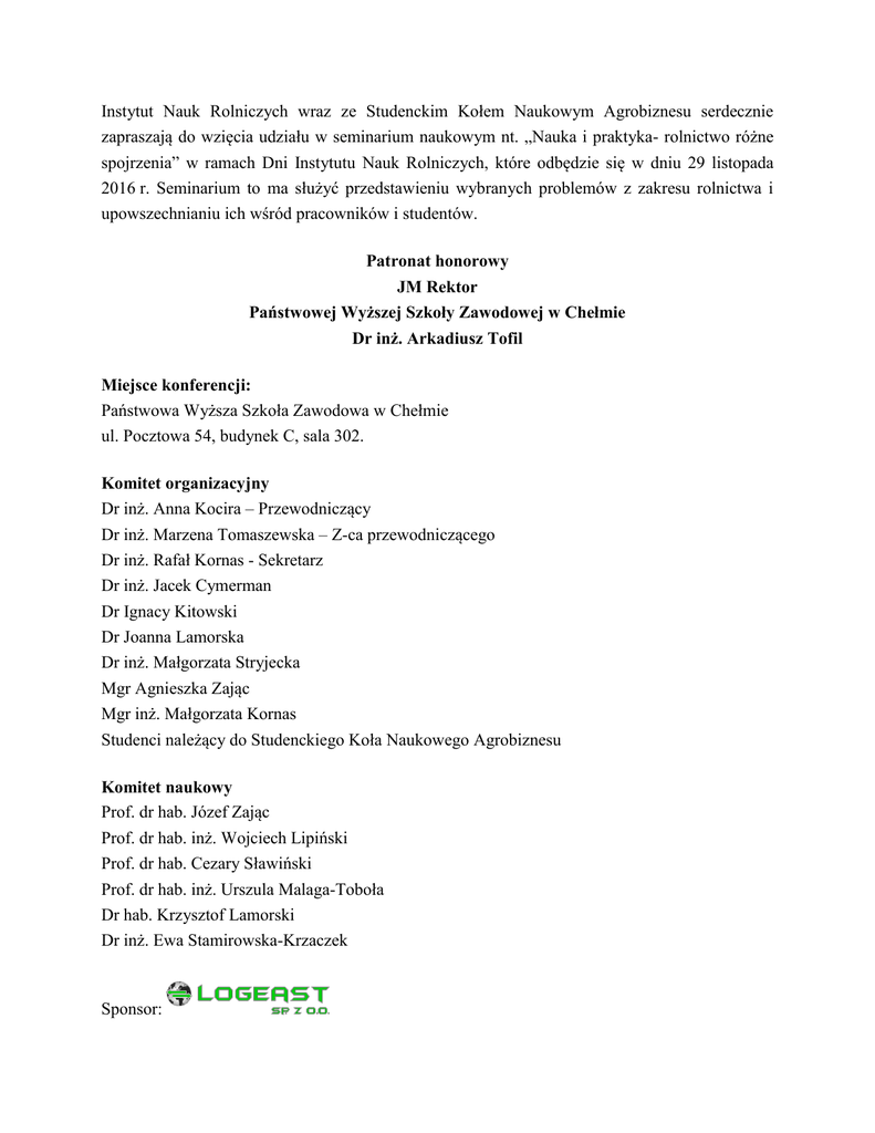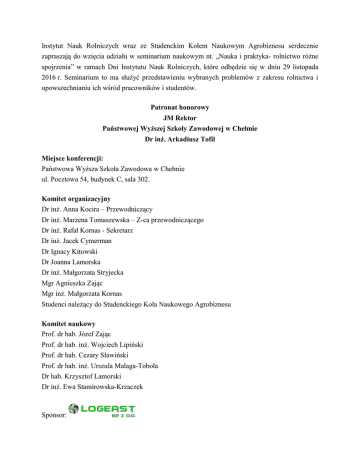 Instytut Nauk Rolniczych wraz ze Studenckim Kołem Naukowym Agrobiznesu serdecznie zapraszają do wzięcia udziału w seminarium naukowym nt. „Nauka i praktyka- rolnictwo różne spojrzenia” w ramach Dni Instytutu Nauk Rolniczych, które odbędzie się w dniu 29 listopada 2016 r. Seminarium to ma służyć przedstawieniu wybranych problemów z zakresu rolnictwa i upowszechnianiu ich wśród pracowników i studentów. Patronat honorowy JM Rektor Państwowej Wyższej Szkoły Zawodowej w Chełmie Dr inż. Arkadiusz Tofil Miejsce konferencji: Państwowa Wyższa Szkoła Zawodowa w Chełmie ul. Pocztowa 54, budynek C, sala 302. Komitet organizacyjny Dr inż. Anna Kocira – Przewodniczący Dr inż. Marzena Tomaszewska – Z-ca przewodniczącego Dr inż. Rafał Kornas - Sekretarz Dr inż. Jacek Cymerman Dr Ignacy Kitowski Dr Joanna Lamorska Dr inż. Małgorzata Stryjecka Mgr Agnieszka Zając Mgr inż. Małgorzata Kornas Studenci należący do Studenckiego Koła Naukowego Agrobiznesu Komitet naukowy Prof. dr hab. Józef Zając Prof. dr hab. inż. Wojciech Lipiński Prof. dr hab. Cezary Sławiński Prof. dr hab. inż. Urszula Malaga-Toboła Dr hab. Krzysztof Lamorski Dr inż. Ewa Stamirowska-Krzaczek Sponsor: Program seminarium 9 45 – 9 50 – rozpoczęcie seminarium Sesja plenarna Prowadzenie: Dr inż. Ewa Stamirowska-Krzaczek 950 – 1010 - Podstawowe zasady dolistnego dokarmiania roślin - Prof. dr hab. Czesław Szewczuk, Katedra Roślin Przemysłowych i Leczniczych, Uniwersytet Przyrodniczy w Lublinie 10 10 – 11 30 - Techniczna i technologiczna modernizacja gospodarstw rolnych - Dr hab. inż. Sławomir Kocira, Katedra Eksploatacji Maszyn i Zarządzania Procesami Produkcyjnymi, Uniwersytet Przyrodniczy w Lublinie 11 30 – 11 50 – Murawy ciepłolubne na Lubelszczyźnie – zagrożenia, metody ochrony - Dr inż. Mariusz Kulik, Katedra Łąkarstwa i Kształtowania Krajobrazu, Uniwersytet Przyrodniczy w Lublinie 11 50 – 12 10 – Biostymulatory w rolnictwie - Dr inż. Anna Kocira, Instytut Nauk Rolniczych, Państwowa Wyższa Szkoła Zawodowa w Chełmie 12 10 – 12 30 przerwa kawowa Sesja referatowa Prowadzenie: Dr inż. Ewa Stamirowska-Krzaczek 12 30 – 12 45 – Aspekty rolnictwa zrównoważonego oraz jego wyznaczniki - Dr inż. Magdalena Kołtun, absolwentka rolnictwa PWSZ w Chełmie, Placówka Partnerska Nest Banku, Chełm 12 45 – 13 00 - Jak pobudzić innowacje w rolnictwie? - Mgr inż. Magda Litwińczuk, absolwentka rolnictwa PWSZ w Chełmie, Agroconsult, Agropolska – pierwszy multiportal polski 13 00 – 13 15 – Agroturystyka – hobby czy sposób na biznes? - Mgr inż. Iwona Stopa, absolwentka rolnictwa PWSZ w Chełmie, Policealna Szkoła WILIAMS w Chełmie 13 15 – 13 30 – Wierzba wiciowa jako roślina energetyczna - Katarzyna Szczepanik, studentka rolnictwa, przewodnicząca Studenckiego Koła Naukowego Agrobiznesu 13 30 – 13 45 – Technologia uprawy i zastosowanie czosnku - Aneta Remiś, studentka rolnictwa, sekretarz Studenckiego Koła Naukowego Agrobiznesu