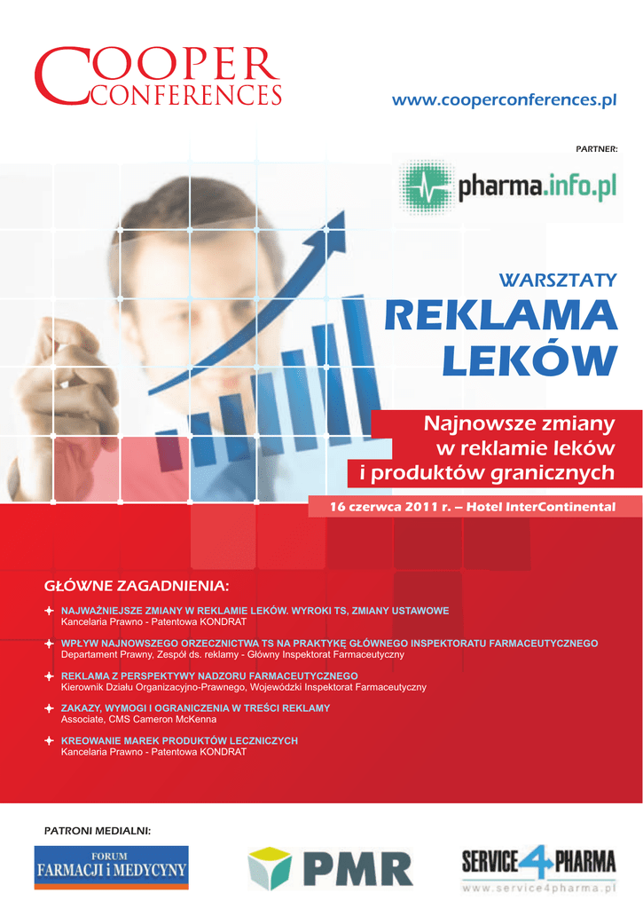 www.cooperconferences.pl PARTNER: WARSZTATY REKLAMA LEKÓW Najnowsze zmiany w reklamie leków i produktów granicznych 16 czerwca 2011 r. – Hotel InterContinental GŁ ÓWNE ZAGADNIENIA: NAJWAŻNIEJSZE ZMIANY W REKLAMIE LEKÓW. WYROKI TS, ZMIANY USTAWOWE Kancelaria Prawno - Patentowa KONDRAT WPŁYW NAJNOWSZEGO ORZECZNICTWA TS NA PRAKTYKĘ GŁÓWNEGO INSPEKTORATU FARMACEUTYCZNEGO Departament Prawny, Zespół ds. reklamy - Główny Inspektorat Farmaceutyczny REKLAMA Z PERSPEKTYWY NADZORU FARMACEUTYCZNEGO Kierownik Działu Organizacyjno-Prawnego, Wojewódzki Inspektorat Farmaceutyczny ZAKAZY, WYMOGI I OGRANICZENIA W TREŚCI REKLAMY Associate, CMS Cameron McKenna KREOWANIE MAREK PRODUKTÓW LECZNICZYCH Kancelaria Prawno - Patentowa KONDRAT PATRONI MEDIALNI: WARSZTATY REKLAMA LEKÓW Najnowsze zmiany w reklamie leków i produktów granicznych 16 czerwca 2011 r. – Hotel InterContinental PROGRAM: 09:30 REJESTRACJA 10:00 NAJWAŻNIEJSZE ZMIANY W REKLAMIE LEKÓW. WYROKI TS, ZMIANY USTAWOWE. Wyroki TS z 5 maja 2011 – nowe praktyczne zmiany w zakresie CHPL, opakowań CHPL – reklama czy informacja Zmiany w ustawach o URPL i refundacyjnej. Konsekwencje dla praktyki Nowe możliwości reklamowe od maja 2011 dr Mariusz Kondrat – Kancelaria KONDRAT 11:00 WPŁYW NAJNOWSZEGO ORZECZNICTWA TS NA PRAKTYKĘ GŁÓWNEGO INSPEKTORATU FARMACEUTYCZNEGO Reklama a Charakterystyka Produktów Leczniczych Reklama leków w Internecie - informacja a reklama - zabezpieczenie strony internetowej - produktowe strony internetowe - wizualizacja opakowań Reklama porównawcza Reklama przypominająca Katarzyna Piotrowska – Departament Prawny, Zespół ds. reklamy – Główny Inspektorat Farmaceutyczny 12:00 PRZERWA KAWOWA 12:20 REKLAMA Z PERSPEKTYWY NADZORU FARMACEUTYCZNEGO Reklama aptek – nowe zakazy · · Gazetki reklamowe · Definicja sprzedaży wysyłkowej produktów leczniczych · Sprzedaż produktów leczniczych za pośrednictwem ALLEGRO · Reklama suplementów diety, kosmetyków i wyrobów medycznych w aptekach Rafał Błoszczyński – Kierownik Działu Organizacyjno-Prawnego, Wojewódzki Inspektorat Farmaceutyczny 13:00 LUNCH 14:00 ZAKAZY, WYMOGI I OGRANICZENIA W TREŚCI REKLAMY Reklama kierowana publicznie a reklama do profesjonalistów - różnice w treści i zasadach używania materiałów Materiały promocyjne a materiały informacyjne Odnoszenie się do zaleceń specjalistów i celebrytów Podawanie cen w reklamie Porównywanie leków z produktami konkurentów Łukasz Sławatyniec – Associate, CMS Cameron McKenna 15:00 KREOWANIE MAREK PRODUKTÓW LECZNICZYCH Tworzenie nazw leków Ochrona nazw leków w charakterze znaków towarowych Nazwy leków w imporcie równoległym Wymogi opakowań i ulotek Rejestracja opakowań jako znaki towarowe Product Placement Justyna Stefańczyk-Kaczmarzyk – Radca Prawny, Kancelaria KONDRAT 16:00 ZAKOŃCZENIE Cooper Group Sp. z o.o., ul. Grzybowska 4/91, 00-131 Warszawa, tel. (22) 224 63 68, fax. (22) 875 84 97, www.cooperconferences.pl WARSZTATY REKLAMA LEKÓW Najnowsze zmiany w reklamie leków i produktów granicznych 16 czerwca 2011 r. – Hotel InterContinental PRELEGENCI: dr MARIUSZ KONDRAT – Rzecznik Patentowy, Kancelaria Prawno-Patentowa KONDRAT Doktor prawa, rzecznik patentowy. Studiował prawo na uniwersytetach w Lublinie, Leuven, Oxfordzie i Amsterdamie. Przed założeniem Kancelarii Prawno-Patentowej KONDRAT pracował w departamencie prawnym UKIE oraz jako adiunkt i wykładowca prawa europejskiego na UKSW. Współautor Komentarza do ustawy Prawo Farmaceutyczne oraz Komentarza do Traktatu Ustanawiającego Wspólnotę Europejską. Autor dwóch monografii: Znaki towarowe w internecie oraz Ochrona znaków towarowych przed naruszeniami w internecie. Autor poradnika Własność Przemysłowa w Unii Europejskiej oraz wielu innych publikacji z zakresu prawa własności przemysłowej i prawa farmaceutycznego. KATARZYNA PIOTROWSKA – Departament Prawny, Zespół ds. Reklam, Główny Inspektorat Farmaceutyczny Absolwentka Wydziału Prawa i Administracji Uniwersytetu Warszawskiego. Studia podyplomowe z zakresu Farmakoekonomiki, Marketingu i Prawa Farmaceutycznego. Od 2008 r. jest członkiem Zespołu ds. reklamy Departamentu Prawnego Głównego Inspektoratu Farmaceutycznego. Posiada szerokie doświadczenie w prowadzeniu postępowań administracyjnych w zakresie reklamy produktów leczniczych oraz reklamy działalności aptek i punktów aptecznych. Autorka publikacji oraz prelegentka na konferencjach dotyczących reklamy produktów leczniczych. RAFAŁ BŁOSZCZYNŃSKI — Kierownik Działu Organizacyjno-Prawnego, Wojewódzki Inspektorat Farmaceutyczny Specjalista w dziedzinie prawa farmaceutycznego oraz żywnościowego w zakresie produktów z pogranicza. Absolwent Katolickiego Uniwersytetu Lubelskiego w Lublinie (magister prawa). 6 letnie doświadczenie w sprawowaniu nadzoru rynku reklamy produktów leczniczych, prowadzonego przez GIF i WIF. Obecnie kierownik wydziału organizacyjno prawnego Wojewódzkiego Inspektoratu Farmaceutycznego zajmuje się, opiniowaniem oraz nadzorowaniem procesem udzielania, zmian (przekształcenia spółek) zezwoleń na prowadzenie aptek, a zwłaszcza nadzorowanie rynku w zakresie detalicznego i hurtowego obrotu produktami leczniczymi. Cooper Group Sp. z o.o., ul. Grzybowska 4/91, 00-131 Warszawa, tel. (22) 224 63 68, fax. (22) 875 84 97, www.cooperconferences.pl WARSZTATY REKLAMA LEKÓW Najnowsze zmiany w reklamie leków i produktów granicznych 16 czerwca 2011 r. – Hotel InterContinental ŁUKASZ SŁAWATYNIEC – Associate, CMS Cameron McKenna Od 2006 roku związany jest z kancelarią CMS Cameron McKenna, gdzie doradza klientom z branży farmaceutycznej, w szczególności w kwestiach reklamy, refundacji, rejestracji oraz dystrybucji leków, jak też w kwestiach związanych z przejściem i ochroną praw własności intelektualnej. Specjalizuje się również w prawie prasowym. Brał udział w przygotowywaniu i prowadzeniu szeregu postępowań prz