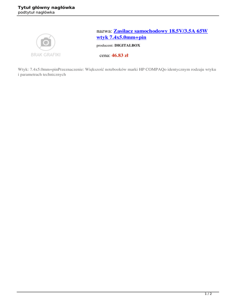 Tytuł główny nagłówka podtytuł nagłówka nazwa: Zasilacz samochodowy 18.5V/3.5A 65W wtyk 7.4x5.0mm+pin producent: DIGITALBOX cena: 46.83 zł Wtyk: 7.4x5.0mm+pinPrzeznaczenie: Większość notebooków marki HP COMPAQo identycznym rodzaju wtyku i parametrach technicznych 1/2 Tytuł główny nagłówka podtytuł nagłówka Producent Nazwa typu Strona o towarze nazwa Opis ogólny Wyposażenie dodatkowe Moc Napięcie wyjściowe Wtyk Natężenie wyjściowe Okres rękojmi w miesiącach wartość DIGITALBOX Zasilacze mobilne http://digitalbox.pl/index.php?page=shop.p roduct_details&flypage=flypage.tpl&produ ct_id=60&category_id=4&option=com_vir tuemart&Itemid=2 Digitalbox zasilacz samochodowy 18.5V/3.5A 65W wtyk 7.4x5.0mm+pin HP Compaq Wyjście USB 65 W 18,5 V 7,4*5,0 3,5 A 24 2/2