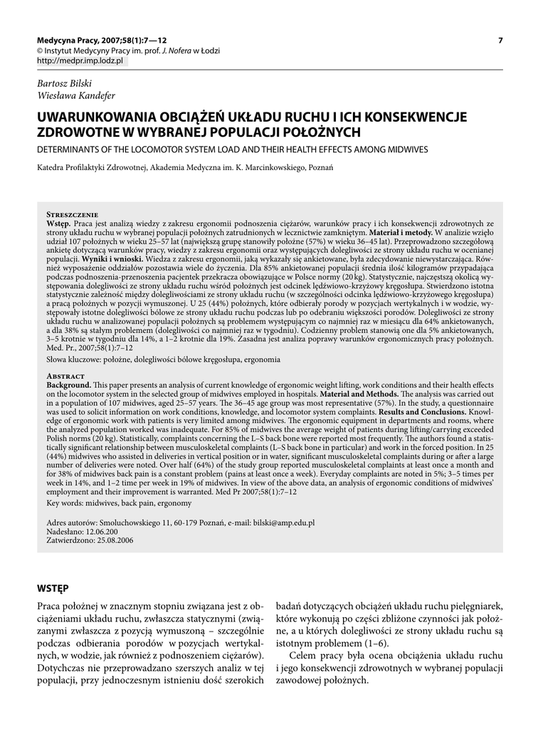 Medycyna Pracy, 2007;58(1):7 — 12 © Instytut Medycyny Pracy im. prof. J. Nofera w Łodzi http://medpr.imp.lodz.pl 7 Bartosz Bilski Wiesława Kandefer UWARUNKOWANIA OBCIĄŻEŃ UKŁADU RUCHU I ICH KONSEKWENCJE ZDROWOTNE W WYBRANEJ POPULACJI POŁOŻNYCH DETERMINANTS OF THE LOCOMOTOR SYSTEM LOAD AND THEIR HEALTH EFFECTS AMONG MIDWIVES Katedra Profilaktyki Zdrowotnej, Akademia Medyczna im. K. Marcinkowskiego, Poznań Streszczenie Wstęp. Praca jest analizą wiedzy z zakresu ergonomii podnoszenia ciężarów, warunków pracy i ich konsekwencji zdrowotnych ze strony układu ruchu w wybranej populacji położnych zatrudnionych w lecznictwie zamkniętym. Materiał i metody. W analizie wzięło udział 107 położnych w wieku 25–57 lat (największą grupę stanowiły położne (57%) w wieku 36–45 lat). Przeprowadzono szczegółową ankietę dotyczącą warunków pracy, wiedzy z zakresu ergonomii oraz występujących dolegliwości ze strony układu ruchu w ocenianej populacji. Wyniki i wnioski. Wiedza z zakresu ergonomii, jaką wykazały się ankietowane, była zdecydowanie niewystarczająca. Również wyposażenie oddziałów pozostawia wiele do życzenia. Dla 85% ankietowanej populacji średnia ilość kilogramów przypadająca podczas podnoszenia-przenoszenia pacjentek przekracza obowiązujące w Polsce normy (20 kg). Statystycznie, najczęstszą okolicą występowania dolegliwości ze strony układu ruchu wśród położnych jest odcinek lędźwiowo-krzyżowy kręgosłupa. Stwierdzono istotna statystycznie zależność między dolegliwościami ze strony układu ruchu (w szczególności odcinka lędźwiowo-krzyżowego kręgosłupa) a pracą położnych w pozycji wymuszonej. U 25 (44%) położnych, które odbierały porody w pozycjach wertykalnych i w wodzie, występowały istotne dolegliwości bólowe ze strony układu ruchu podczas lub po odebraniu większości porodów. Dolegliwości ze strony układu ruchu w analizowanej populacji położnych są problemem występującym co najmniej raz w miesiącu dla 64% ankietowanych, a dla 38% są stałym problemem (dolegliwości co najmniej raz w tygodniu). Codzienny problem stanowią one dla 5% ankietowanych, 3–5 krotnie w tygodniu dla 14%, a 1–2 krotnie dla 19%. Zasadna jest analiza poprawy warunków ergonomicznych pracy położnych. Med. Pr., 2007;58(1):7–12 Słowa kluczowe: położne, dolegliwości bólowe kręgosłupa, ergonomia Abstract Background. This paper presents an analysis of current knowledge of ergonomic weight lifting, work conditions and their health effects on the locomotor system in the selected group of midwives employed in hospitals. Material and Methods. The analysis was carried out in a population of 107 midwives, aged 25–57 years. The 36–45 age group was most representative (57%). In the study, a questionnaire was used to solicit information on work conditions, knowledge, and locomotor system complaints. Results and Conclusions. Knowledge of ergonomic work with patients is very limited among midwives. The ergonomic equipment in departments and rooms, where the analyzed population worked was inadequate. For 85% of midwives the average weight of patients during lifting/carrying exceeded Polish norms (20 kg). Statistically, complaints concerning the L–S back bone were reported most frequently. The authors found a statistically significant relationship between musculoskeletal complaints (L–S back bone in particular) and work in the forced position. In 25 (44%) midwives who assisted in deliveries in vertical position or in water, significant musculoskeletal complaints during or after a large number of deliveries were noted. Over half (64%) of the study group reported musculoskeletal complaints at least once a month and for 38% of midwives back pain is a constant problem (pains at least once a week). Everyday complaints are noted in 5%; 3–5 times per week in 14%, and 1–2 time per week in 19% of midwives. In view of the above data, an analysis of ergonomic conditions of midwives’ employment and their improvement is warranted. Med Pr 2007;58(1):7–12 Key words: midwives, back pain, ergonomy Adres autorów: Smoluchowskiego 11, 60-179 Poznań, e-mail: [email protected] Nadesłano: 12.06.200 Zatwierdzono: 25.08.2006 WSTĘP Praca położnej w znacznym stopniu związana jest z obciążeniami układu ruchu, zwłaszcza statycznymi (związanymi zwłaszcza z pozycją wymuszoną – szczególnie podczas odbierania porodów w pozycjach wertykalnych, w wodzie, jak również z podnoszeniem ciężarów). Dotychczas nie przeprowadzano szerszych analiz w tej populacji, przy jednoczesnym istnieniu dość szerokich badań dotyczących obciążeń układu ruchu pielęgniarek, które wykonują po części zbliżone czynności jak położne, a u których dolegliwości ze strony układu ruchu są istotnym problemem (1–6). Celem pracy była ocena obciążenia układu ruchu i jego konsekwencji zdrowotnych w wybranej populacji zawodowej położnych. 8 B. Bilski, W. Kandefer MATERIAŁ I METODY Analiza obciążeń układu ruchu i ich konsekwencji zdrowotnych metodą ankietową została przeprowadzona w losowo wybranej populacji położnych zatrudnionych w 6 szpitalach województwa lubuskiego, w tym w pięciu szpitalach I poziomu referencyjnego oraz w jednym II poziomu referencyjnego w 2005 r. (wzór ankiety dostępny u autorów). Badaniami objęto łącznie populację 120 położnych, co stanowiło 31,5% ogółu położnych zatrudnionych w tych placówkach. Uzyskano 107 wyczerpująco wypełnionych ankiet, co stanowiło 31,5% ogółu personelu położnych zatrudnionych na wymienionych w tabeli 1 oddziałach z terenu województwa lubuskiego. Ze względu na losowy dobór grupy ankietowanej można przyjąć, że warunki pracy tej populacji odpowiadały pozostałym położnym zatrudnionym w lecznictwie zamkniętym w tym województwie (były to te same placówki). Średnia arytmetyczna wieku położnych biorących udział w badaniach wynosi