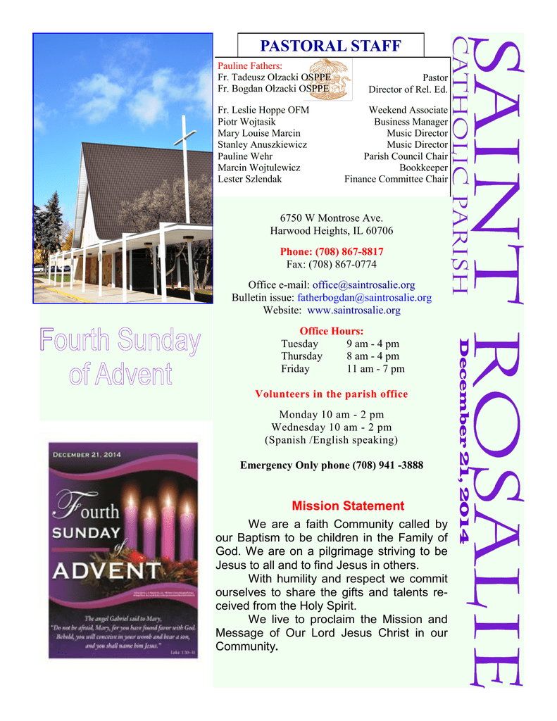 PASTORAL STAFF Pauline Fathers: Fr. Tadeusz Olzacki OSPPE Fr. Bogdan Olzacki OSPPE Fr. Leslie Hoppe OFM Piotr Wojtasik Mary Louise Marcin Stanley Anuszkiewicz Pauline Wehr Marcin Wojtulewicz Lester Szlendak Pastor Director of Rel. Ed. Weekend Associate Business Manager Music Director Music Director Parish Council Chair Bookkeeper Finance Committee Chair 6750 W Montrose Ave. Harwood Heights, IL 60706 Phone: (708) 867-8817 Fax: (708) 867-0774 Office e-mail: [email protected] Bulletin issue: [email protected] Website: www.saintrosalie.org Volunteers in the parish office Monday 10 am - 2 pm Wednesday 10 am - 2 pm (Spanish /English speaking) Emergency Only phone (708) 941 -3888 Mission Statement We are a faith Community called by our Baptism to be children in the Family of God. We are on a pilgrimage striving to be Jesus to all and to find Jesus in others. With humility and respect we commit ourselves to share the gifts and talents received from the Holy Spirit. We live to proclaim the Mission and Message of Our Lord Jesus Christ in our Community. December 21, 2014 Office Hours: Tuesday 9 am - 4 pm Thursday 8 am - 4 pm Friday 11 am - 7 pm St. Rosalie 2 Christmas Schedule MASS INTENTIONS The custom in Germany is that of the Wednesday, December 24, 2014 childrens' festival between January 1-6 7:30 am NO MASS (Three Kings Day). After 4:00pm Family Mass a service at the + Norbert Pabich (Wife & Children) churches the children go 9:00pm Msza (Polish) from house to house to + Stanisława Janowska gather offerings for poor + Franciszek Rypel children in poor coun+ Józef Stępowski tries. + Michał Foryś They are dressed + Adam Pająk as the three kings and + Adam Cholewa carry sticks with stars on 12:00am Mass (English) the top. At the homes - Happy 57th Anniversary to they sing songs and reMr. & Mrs. Al Mittler cite messages of Christ+ Hilde Germaine mas. + Edmund Gregor At each house + Zbigniew Delanowski - 1 Year Death Anniversary they paint the letters "20+C+M+B+14" which Thursday, December 25, 2014 - Christmas are for the Latin Chris7:30 am + Edward & Cecylia Bates - Death Anniversary tus Mansionem Benedicat (Christ bless this (Daughter Eleonore) house). 9:00 am - O Boże błogosławieństwo dla Tadeusza i At the same time Marii z okazji 50 rocznicy ślubu oraz the letters are the first wszelkie łaski dla całej ich rodziny letters of the names of 10:30 am + Bruno & Helen Marcin the wise men: Caspar, + Edmund Gregor Melchior and Balthasar. + Zbigniew Delanowski — Christmas Stories 12:00 pm dantis from German Culture. 1:30 pm + Zofia i Tomasz Wozniak http:// + Tadeusz Wozniak www.catholicculture.org/ + Aleksandra i Stanisław Zaglaniczny culture/liturgicalyear/ + Maria i Marian Łuszczycki prayers/view.cfm?id=49 ECHOING MARY'S DECISION Dla Boga nie ma nic niemożliwego O wierze rozmawiamy na różne sposoby. Jedni z mniejszą, a inni z większą łatwością. Problem w tym, że dużo trudniej, niż rozmawiać o wierze, przychodzi nam powiedzieć „wierzę" Dopóki pozostajemy na płaszczyźnie mniej czy bardziej teoretycznych rozważań o sprawach wiary lub pytamy o życie innych i o to, co bezpośrednio nie dotyka naszego osobistego życia, rozmowa o wierze przychodzi nam w miarę łatwo; zresztą - kto wie - może jest to tylko rozmowa o religii... Prawdziwa rozmowa o wierze to decyzja, by - jak Maryja - pozwolić Bogu wejść w nasze życie i zmienić w nim dosłownie wszystko. Przekroczyć granicę niemożliwego. Saturday 4:00 pm Vigil Mass in English Sunday 7:30 am 10:30 am & 12:00pm In English 9:00 am and 1:30 pm In Polish DAILY MASSES 7:30 am In English followed by Rosary 7:00 pm - In Polish on Fridays During the month of May: Monday thru Friday 7:00 pm - In Polish- May Devotion followed by Mass During the month of Oct.: Monday thru Friday 7:00 pm In Polish– Rosary followed by Mass SACRAMENT OF RECONCILIATION Starts at: 6:00 pm on Friday 3:00 pm on Saturday St. Rosalie The angel Gabriel today confronts Mary with a mystery. The mystery of salvation in Christ is not a mystery that is solved, but a reality beyond our comprehension that we must choose to enter into. In the liturgy of the Eastern Church, everyone waits to see if Mary will enter into the mystery: God waits, Adam and Eve and all the souls of the dead who long for paradise wait, angels wait for new heavenly companions. And there is much rejoicing when her decision is "yes." We have less dramatic choices offered to us, but the mystery of our salvation in Christ is by no means "solved." We may understand it a bit better due to Mary's "yes." We may be a bit closer to it through the passion, death, and resurrection of Jesus Christ. But it still remains a mystery to which we all must give our own "yes." Soon we will be singing "O come, let us adore him." May our Advent prayer, our echo of Mary's "yes," continue then, so we may enter into the mystery of our salvation in Jesus Christ, God among us. Copyright (c) J. S. Paluch Co. SUNDAY MASSES ADORATION OF THE MOST BLESSED SACRAMENT 5:00 pm - 7:00 pm on Friday & 6:00 pm - 7:00 pm ks. Dariusz Madejczyk http://www.opoka.org.pl/biblioteka/H/HN/2/4adwent-6.html on first Thursday of the Month 3 St. Rosalie Dear Parishioners: May Christmas Peace fill your home and our Parish! We wish you an abundance of God’s blessings and good health. God bless you and your families and may Christ give you His peace, good will and fellowship with all the heavenly host. Drodzy Parafianie: Niech Pokój Bożego Narodzenia wypełni Wasze domy i naszą Parafię! Życzymy Wam błogosławionych Świąt Bożego Narodzenia, zdrowia i pomyślności w Nowym Roku AD 2015. Niechaj Dobry Bóg otoczy Was i Wasze rodziny łaską pokoju i miłości. Szczęść Boże! Fr Tadeusz Olzacki, Pastor Fr Bogdan Olzacki and Parish Staff 4 Today the second collection is designed for for the parking lot St. Rosalie Announcements Please join us for a 4pm Family Mass with children’s choir. Our Midnight Mass will commence Chris