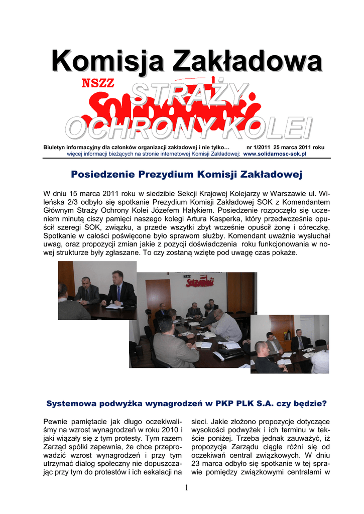 Komisja Zakładowa STRAŻY OCHRONY KOLEI Biuletyn informacyjny dla członków organizacji zakładowej i nie tylko… nr 1/2011 25 marca 2011 roku więcej informacji bieżących na stronie internetowej Komisji Zakładowej: www.solidarnosc-sok.pl Posiedzenie Prezydium Komisji Zakładowej W dniu 15 marca 2011 roku w siedzibie Sekcji Krajowej Kolejarzy w Warszawie ul. Wileńska 2/3 odbyło się spotkanie Prezydium Komisji Zakładowej SOK z Komendantem Głównym Straży Ochrony Kolei Józefem Hałykiem. Posiedzenie rozpoczęło się uczeniem minutą ciszy pamięci naszego kolegi Artura Kasperka, który przedwcześnie opuścił szeregi SOK, związku, a przede wszytki zbyt wcześnie opuścił żonę i córeczkę. Spotkanie w całości poświęcone było sprawom służby. Komendant uważnie wysłuchał uwag, oraz propozycji zmian jakie z pozycji doświadczenia roku funkcjonowania w nowej strukturze były zgłaszane. To czy zostaną wzięte pod uwagę czas pokaże. Systemowa podwyżka wynagrodzeń w PKP PLK S.A. czy będzie? Pewnie pamiętacie jak długo oczekiwaliśmy na wzrost wynagrodzeń w roku 2010 i jaki wiązały się z tym protesty. Tym razem Zarząd spółki zapewnia, że chce przeprowadzić wzrost wynagrodzeń i przy tym utrzymać dialog społeczny nie dopuszczając przy tym do protestów i ich eskalacji na sieci. Jakie złożono propozycje dotyczące wysokości podwyżek i ich terminu w tekście poniżej. Trzeba jednak zauważyć, iż propozycja Zarządu ciągle różni się od oczekiwań central związkowych. W dniu 23 marca odbyło się spotkanie w tej sprawie pomiędzy związkowymi centralami w 1 spółce, a Zarządem. Prezes przedstawił dokładnie te propozycje o których mówił podczas rady SZIK w dniu 16 marca br. Pod wpływem rozmów i realnie podchodząc do tematu przedstawiciele związków zweryfikowali swoje żądania do kwoty 175 zł w uposażeniu zasadniczym od 1 kwiet- nia br. jednocześnie ustalając dzień 8 kwietnia br. jako ostatni do uzgodnień. Po tej dacie mają zostać podjęte przez organizacje związkowe działania, które wymuszą na Zarządzie wprowadzenie podwyżki w wysokości zadowalającej stronę społeczną. Posiedzenie Rady Sekcji Zawodowej Infrastruktury Kolejowej W dniu 16 marca 2011 roku w siedzibie Zarządu PKP PLK S.A. w Warszawie przy ul. Targowej 74 odbyło się posiedzenie Rady SZIK, tematyka spotkania to sprawy bieżące i w dużej mierze sprawy związane z infrastrukturą. To co na pewno zainteresuje i w całości dotyczy funkcjonariuszy SOK to ewentualne podwyżki w spółce. Na posiedzenie został zaproszony Prezes PKP PLK S.A. Zbigniew Szafrański, który udzielając odpowiedzi na różnego rodzaju pytania poinformował również, że na dzień 23 marca br. uzgodnione jest spotkanie ze związkami zawodowymi w sprawie podwyżek w roku 2011. Propozycja Zarządu to 100 zł do uposażenia zasadniczego od 1 maja br. i 50 zł w premii uznaniowej lub II wariant podwyżka od 1 czerwca br. w wysokości 125 zł do uposażenia zasadniczego i 50 zł w premii uznaniowej. Na spotkaniu ponadto poruszono sprawę ewentualnych zmian organizacyjnych w spółce. Prezes zapewnił, że do końca roku 2011 żadnych zmian nie będzie. Poinformował też, że informacje o propozycjach zmian jakie wypracowuje zatrudniona przez radę Nadzorczą firma konsultingowa nie zawsze brane są poważnie pod uwagę gdyż nie uwzględniają specyfiki spółki. Z. Szafrański przedstawił też zarys zmian jakie z czasem będą wdrażane. Z prac Rady Sekcji Krajowej Kolejarzy nych są wyłącznie plotkami nie mającymi potwierdzenia w rzeczywistości. Ponadto w dniu 10 marca br. powinien zostać ustalony kolejny termin spotkania członków Prezydium Rady SKK z Premierem Donaldem Tuskiem. Na spotkaniu tym będzie również poruszona sprawa przeciągających się prac legislacyjnych nad projektem ustawy o SOK, który wypracował Pan Poseł Janusz Piechociński ze swoją Podkomisją. Dnia 1 marca 2011 roku w siedzibie Sekcji Krajowej Kolejarzy NSZZ "Solidarność" przy ul. Wileńskiej w Warszawie odbyło sie kolejne posiedzenie Rady Sekcji Krajowej Kolejarzy. Informacje dotyczące PKP PLK S.A. to przede wszystkim zapewnienie, iż nie przewidywane są żadne zmiany organizacyjne w spółce do końca roku 2011. Tym samym plotki jakie od jakiegoś czasu krążą o zmianach w Straży Ochrony Kolei dotyczące między innymi likwidacji niektórych Komend Regional- 2 Posiedzenie Komisji Zakładowej SOK W dniach 12 – 13 kwietnia br. w Ośrodku Szkolenia SOK w Zbąszyniu odbędzie się pierwsze w tym roku posiedzenie Komisji Zakładowej Straży Ochrony Kolei. Będzie to jednocześnie okazja do podsumowania działalności w rok po wyborach, w których dokonano zmian władz. Na pewno będzie to okazja do analizy dotychczasowej działalności nie tylko Przewodniczącego Komisji ale też jej członków, w tym przede wszystkim członków Prezydium. O przebiegu posiedzenia poinformujemy w kolejnym numerze. Z serwisu informacyjnego Komisji Krajowej… 25 marca podczas obrad WZD w Katowicach szef górniczej „Solidarności” Dominik Kolorz został wybrany na funkcję Przewodniczącego Zarządu Regionu Śląsko – Dąbrowskiego. Dominik Kolorz na stanowisku przewodniczącego zastąpił Piotra Dudę. * 22 marca kolejarskie związki zawodowe rozpoczęły referendum strajkowe w spółkach przeznaczonych do prywatyzacji. Związkowcy domagają się gwarancji socjalnych dla pracowników przed sprzedażą przedsiębiorstw. * Komisja Krajowa NSZZ „Solidarność” ogłosiła stan gotowości protestacyjnej. Związek zorganizuje m.in. 16 manifestacji w miastach wojewódzkich. * W spółce PPG Polifarb Cieszyn zostało podpisane porozumienie, na mocy którego do pracy przywrócono Przewodniczącego zakładowej „S” Mirosława Kitowskiego. * Sąd Rejonowy w Słubicach już podczas pierwszej rozprawy uznał wypowiedzenia umów o pracę z członkami organizacji zakładowej „S” w Teleskopie za bezpra