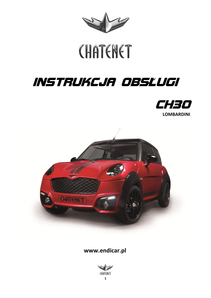 INSTRUKCJA OBSŁUGI CH30 LOMBARDINI www.endicar.pl 1 Wszystkie prawa zastrzeżone. Tekst, rysunki, zdjęcia oraz wszystkie inne informacje opublikowane w niniejszej instrukcji podlegają prawom autorskim firmy APP sp. z o.o. Wszelkie kopiowanie, dystrybucja, elektroniczne przetwarzanie oraz przesyłanie zawartości bez zezwolenia firmy APP sp. z o.o. jest zabronione. 2 Witamy w gronie użytkowników CH30! Dziękujemy za zaufanie, jakim nas Państwo obdarzyliście. Nasz zespół chcąc zapewnić Państwu pełnię satysfakcji dołożył wszelkich starań podczas procesu projektowania i produkcji pojazdu Chatenet CH30. Niniejsza instrukcja obsługi i konserwacji zawiera cenne dla Państwa informacje, dzięki którym poznacie swój nowy pojazd, co umożliwi wykorzystanie w optymalny sposób zastosowanych w nim rozwiązań konstrukcyjnych, a także poprzez przestrzeganie zaleceń dotyczących obsługi, zapewni najlepsze warunki eksploatacji. Prosimy o zapoznanie się z niniejszą instrukcją przed pierwszym uruchomieniem pojazdu i życzymy udanej eksploatacji nowego modelu Chatenet. Model CH30 jest pojazdem klasy homologacyjnej L7e (czterokołowiec) może być prowadzony przez użytkownika, który ukończył 16 lat. Warunkiem jest posiadanie prawa jazdy kategorii B1. Szerokiej drogi... życzy Louis Georges CHATENET oraz Zespół ENDICAR 3 ZALECENIA DOT. BEZPIECZEŃSTWA 4 Wymiany/Naprawy Paliwo/Olej Układ wydechowy Akumulator Identyfikacja pojazdu Docieranie pojazdu Konserwacja nadwozia 20 Sprawdzanie poziomów oleju, płynów i akumulatora olej w silniku płyn hamulcowy akumulator spryskiwacze Bezpieczniki Ogumienie Akumulator 21 21 21 21 22 22 24 Światła 24 Wymiary 24 Dane techniczne 25 Plan obsługi pojazdu 26 Płyny eksploatacyjne 26 WYPOSAŻENIE Otwieranie/Blokowanie/Odblokowywanie Regulacja siedzeń Pasy bezpieczeństwa Miejsce kierowcy Cyfrowa tablica rozdzielcza Regulacja zegara Licznik całkowitego lub częściowego przebiegu pojazdu Wskaźnik przeglądów okresowych Regulacja natężenia oświetlania wskaźników Oświetlenie wnętrza pojazdu Hamowanie awaryjne Lampki kontrolne na tablicy rozdzielczej Oświetlenie i sygnalizacja Wycieraczki, spryskiwacze Konsola środkowa Wentylacja/ogrzewanie/usuwanie zaparowania szyb Ogrzewanie tylnej szyby Uruchamianie pojazdu Dźwignia zmiany biegów Hamulec ręczny Wspomaganie przy parkowaniu 5 7 7 8 9 10 Akcesoria Lusterka wsteczne Lampka sufitowa Osłona przeciwsłoneczna Schowek (z przodu, po stronie pasażera) Schowki w drzwiach Popielniczka Bagażnik 17 10 11 11 11 11 12 13 13 14 15 15 16 16 17 17 4 ZALECENIA DOTYCZĄCE BEZPIECZEŃSTWA WYMIANY/NAPRAWY Wszelkie wymiany lub naprawy (w instalacji elektrycznej, silniku, układzie przeniesienia napędu, układzie hamulcowym, pasach bezpieczeństwa, nadwoziu...) muszą być wykonywane przez autoryzowaną stację obsługi pojazdów (ASO) marki CHATENET. PALIWO/OLEJ Paliwo i olej są substancjami wysoce łatwopalnymi. Nie wolno w ich pobliżu używać otwartego ognia ani stosować źródła silnego ciepła. Nie wolno tankować samochodu w pomieszczeniu zamkniętym. Podczas uzupełniania paliwa, silnik samochodu musi być wyłączony. Należy pamiętać, aby nie napełniać zbiornika „pod korek”. W przypadku rozlania paliwa/oleju w komorze silnika lub na układ wydechowy należy dokładnie wytrzeć wszystkie ślady substancji przed uruchomieniem pojazdu. Przed włączeniem silnika, należy również sprawdzić, czy wszystkie korki od zbiorników powróciły na swoje miejsca. Zaleca się regularne sprawdzanie poziomów (paliwa, oleju silnikowego). UKŁAD WYDECHOWY Spaliny są substancją szkodliwą, a nawet śmiertelną. Nie należy nigdy pozostawiać silnika na biegu w pomieszczeniu o słabej wentylacji. W przypadku, gdy tłumiki przestają pełnić swoją funkcję lub ulegną uszkodzeniu, należy je wymienić. AKUMULATOR Należy zachować ostrożność przy czynnościach związanych z akumulatorem, ponieważ zawiera on kwas. W przypadku wykonywania jakiejkolwiek czynności w elementach instalacji elektrycznej, należy bezwzględnie odłączyć przewód bieguna ujemnego akumulatora (masa). IDENTYFIKACJA POJAZDU Tabliczka znamionowa producenta Znajduje się na przegrodzie czołowej po lewej stronie. Numer podwozia VIN Jest wygrawerowany na aluminiowej ramie kratownicowej pod siedzeniem pasażera. DOCIERANIE POJAZDU Trwałość (żywotność) zakupionego pojazdu będzie zależeć od Państwa sposobu prowadzenia podczas pierwszych kilometrów. Przy pierwszym uruchomieniu pojazdu, należy powoli rozgrzewać silnik, unikając pełnego obciążania zimnego silnika. Podczas jazdy, od czasu do czasu należy zwalniać pedał przyspieszenia, zmniejszając prędkość obrotową silnika. W trakcie pierwszych 500km należy bezwzględnie unikać wciskania do oporu pedału przyśpieszenia przez dłuższy czas, bez przerwy. Konieczne jest wykonanie pierwszego przeglądu po przejechaniu 500 km w serwisie CHATENET (ASO) 5 OTWIERANIE/BLOKOWANIE/ODBLOKOWYWANIE Drzwi Zamek centralny Blokowanie i odblokowywanie drzwi odbywa się za pomocą pilota (patrz rysunek poniżej) lub, w razie potrzeby, od strony kierowcy - za pomocą kluczyka. Umożliwia blokowanie i odblokowywanie zamków drzwi i pokrywy bagażnika. rys. 1 Podczas otwierania drzwi, szyba opuszcza się automatycznie 5 cm, aby odsłonić uszczelkę drzwi. Podczas zamykania – szyba podnosi się z powrotem w górę, żeby zapewnić prawidłową szczelność drzwi. Pokrywa bagażnika Aby otworzyć bagażnik, należy odblokować zamek pokrywy tylnej za pomocą pilota (jeśli samochód jest zamknięty), a następnie wcisnąć stycznik zamka, który znajduje się pod przetłoczeniem po prawej stronie lampki oświetlenia rejestracji. Otwieranie od zewnątrz: aby otworzyć drzwi, należy pociągnąć za klamkę. Otwieranie od wewnątrz: drzwi otwierają się od wewnątrz za pomocą rączek umieszczonych nad podłokietnikami. Zabezpieczenie: gdy samochód osiągni