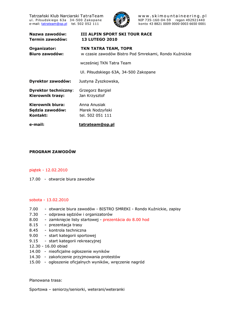 Tatrzański Klub Narciarski TatraTeam www.skimountaineering.pl u l . P i łs u d s k i e g o 6 3 a 3 4 - 5 0 0 Z a k o p a n e e-mail: [email protected] tel. 502 052 111 NIP 735-160-04-59 regon 492921440 konto 43 8821 0009 0000 0003 6650 0001 Nazwa zawodów: Termin zawodów: III ALPIN SPORT SKI TOUR RACE 13 LUTEGO 2010 Organizator: Biuro zawodów: TKN TATRA TEAM, TOPR w czasie zawodów Bistro Pod Smrekami, Rondo Kuźnickie wcześniej TKN Tatra Team Ul. Piłsudskiego 63A, 34-500 Zakopane Dyrektor zawodów: Justyna Żyszkowska, Dyrektor techniczny: Kierownik trasy: Grzegorz Bargiel Jan Krzysztof Kierownik biura: Sędzia zawodów: Kontakt: Anna Anusiak Marek Nodzyński tel. 502 051 111 e-mail: [email protected] PROGRAM ZAWODÓW piątek - 12.02.2010 17.00 - otwarcie biura zawodów sobota - 13.02.2010 7.00 - otwarcie biura zawodów - BISTRO SMREKI - Rondo Kuźnickie, zapisy 7.30 - odprawa sędziów i organizatorów 8.00 - zamknięcie listy startowej - prezentácia do 8.00 hod 8.15 - prezentacja trasy 8.45 - kontrola techniczna 9.00 - start kategorii sportowej 9.15 - start kategorii rekreacyjnej 12.30 - 16.00 obiad 14.00 - nieoficjalne ogłoszenie wyników 14.30 - zakończenie przyjmowania protestów 15.00 - ogłoszenie oficjalnych wyników, wręczenie nagród Planowana trasa: Sportowa – seniorzy/seniorki, weterani/weteranki Tatrzański Klub Narciarski TatraTeam www.skimountaineering.pl u l . P i łs u d s k i e g o 6 3 a 3 4 - 5 0 0 Z a k o p a n e e-mail: [email protected] tel. 502 052 111 NIP 735-160-04-59 regon 492921440 konto 43 8821 0009 0000 0003 6650 0001 START - Rondo Kuźnickie, zielonym szlakiem podejście na Nosal, Nosalowa Przełęcz, niebieskim szlakiem przez Boczań na Halę Gąsienicową, Przełęcz Karb przez Czerwone Stawki, zjazd w rejon Dolnej Stacji Wyciągu na Gąsienicowej, Przełęcz Lilowe, Beskid, Sucha Przełęcz, zjazd nartostradą przez Halę do Kuźnic – META Amatorska i Sportowa - juniorzy/juniorki, kadeci/kadetki START – Rondo Kuźnickie, zielonym szlakiem podejście na Nosal, Nosalowa Przełęcz, niebieskim szlakiem przez Boczań na Halę Gąsienicową, Przełęcz Lilowe, Beskid, Sucha Przełęcz, zjazd nartostradą przez Halę do Kuźnic - META TRASA AWARYJNA START – Rondo Kuźnickie, zielonym szlakiem podejście na Nosal, Nosalowa Przełęcz, niebieskim szlakiem przez Boczań na Halę Gąsienicową, Dolna Stacja wyciągu na Gąsienicowej, Sucha Przełęcz, zjazd w rejon Buli w kotle Goryczkowym, wyjście na Kasprowy Wierch, zjazd nartostradą przez Halę do Kuźnic - META Regulamin Zawodów ALPIN SPORT SKI TOUR RACE WARUNKI KLASYFIKACJI §1 W zawodach klasyfikowani są wszyscy zawodnicy, którzy ukończą zawody. FORMUŁA ZAWODÓW §2 Konkurencja indywidualna, pomiar czasu start-meta, start wspólny. Tatrzański Klub Narciarski TatraTeam www.skimountaineering.pl u l . P i łs u d s k i e g o 6 3 a 3 4 - 5 0 0 Z a k o p a n e e-mail: [email protected] tel. 502 052 111 NIP 735-160-04-59 regon 492921440 konto 43 8821 0009 0000 0003 6650 0001 KATEGORIE ZAWODNIKÓW §3 1. Zawody rozgrywane są w dwóch głównych kategoriach - rekreacyjnej i sportowej z podziałem na podkategorie. Kategorie wiekowe w kategorii sportowej: Wg regulaminu Pucharu Polski Kadet/kadetka – rocznik 1993 i wcześniejsze Junior/juniorka – rocznik 1990 – 1992 Senior/seniorka – rocznik 1989 – 1970 Weteran/weteranka – rocznik 1969 – 1960 Nestor/nestorka – rocznik 1959 i wcześniejsze Kategorie wiekowe w kategorii amatorskiej: Wg regulaminu Pucharu Polski Amatorów Kadet/kadetka – rocznik 1992 i wcześniejszy Senior/seniorka – rocznik 1975 – 1991 Weteran/weteranka – rocznik 1960 – 1974 Nestor/nestorka – rocznik 1959 i wcześniej Zawodnicy są nagradzani przy minimum trzech osobach startujących w danej kategorii. Każdy zawodnik może wziąć udział w zawodach. Wszyscy zawodnicy startują na własną odpowiedzialność podpisując przed startem stosowne oświadczenie. Z ogólnej listy wyników wyliczana jest klasyfikacja Pucharu Polski w której mogą być klasyfikowani jedynie zawodnicy posiadający licencje krajową PZA. Klasyfikacją Pucharu Polski zajmuje się osoba z ramienia KNW PZA. W klasyfikacji Pucharu Europy Środkowej mogą wziąć udział wszyscy zawodnicy startujący na trasie sportowej Tatrzański Klub Narciarski TatraTeam www.skimountaineering.pl u l . P i łs u d s k i e g o 6 3 a 3 4 - 5 0 0 Z a k o p a n e e-mail: [email protected] tel. 502 052 111 NIP 735-160-04-59 regon 492921440 konto 43 8821 0009 0000 0003 6650 0001 SPRZĘT I WYPOSAŻENIE ZAWODNIKÓW §4 Artykuły wyliczone poniżej muszą spełniać wymogi europejskie (EU) lub wymogi UIAA. §5 Podstawowe obowiązkowe wyposażenie zawodnika: 1. Narty wyposażone w metalowe krawędzie na co najmniej 90% ich długości, o szerokości co najmniej 60mm pod butem. Narty musza mieć co najmniej 160cm długości dla mężczyzn i 150cm dla kobiet (dla młodziczek i młodzików minimum 80% wzrostu zawodnika). Wiązania muszą umożliwiać ruch pięty podczas podchodzenia lub zjazdu i mogą lecz nie muszą być wyposażone w paski zabezpieczające, na ryzyko zawodnika. Zarówno przednia, jak i tylna część wiązań musi zapewniać bezpieczne wypinanie w płaszczyźnie przód-tył, jak i na boki (w płaszczyźnie prostopadłej). Stosowanie wiązań i butów biegowych oraz ich pochodnych jest stanowczo zabronione. 2. Buty musza zakrywać kostkę i posiadać podeszwy typu Vibram lub podobne, przy czym podeszwa taka musi zajmować przynajmniej 75% powierzchni stopy, a nacięcia w niej muszą być głębokie na 4mm. Minimalna liczba nacięć podeszwy: 8 na obcasie i 15 w części przedniej. (Minimalna powierzchnia nacięcia: 1cm2). Buty musza być przystosowane do zamocowania na nich metalowych raków i musza być zapinane na minimum dwie klamry. 3. Para kijków do narciarstwa alpejskiego lub biegowego o maksymalnej średnicy 25mm z niemetalowymi talerzykami. 4. Para fok. Ze względu na zasady ochro