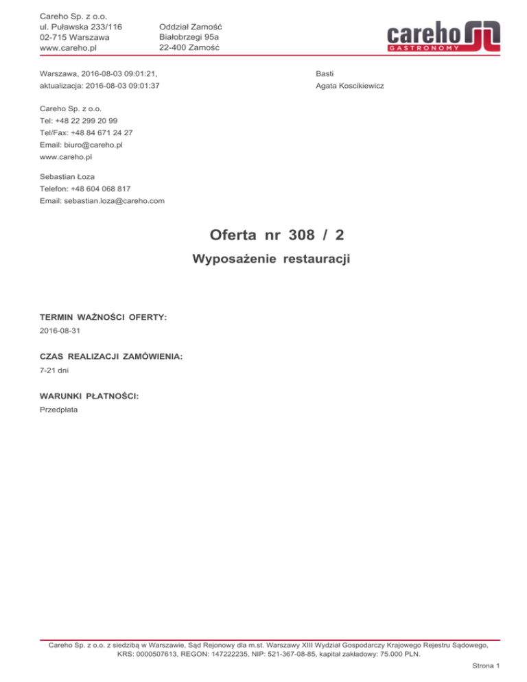 Careho Sp. z o.o. ul. Puławska 233/116 02-715 Warszawa www.careho.pl Oddział Zamość Białobrzegi 95a 22-400 Zamość Warszawa, 2016-08-03 09:01:21, Basti aktualizacja: 2016-08-03 09:01:37 Agata Koscikiewicz Careho Sp. z o.o. Tel: +48 22 299 20 99 Tel/Fax: +48 84 671 24 27 Email: [email protected] www.careho.pl Sebastian Łoza Telefon: +48 604 068 817 Email: [email protected] Oferta nr 308 / 2 Wyposażenie restauracji TERMIN WAŻNOŚCI OFERTY: 2016-08-31 CZAS REALIZACJI ZAMÓWIENIA: 7-21 dni WARUNKI PŁATNOŚCI: Przedpłata Careho Sp. z o.o. z siedzibą w Warszawie, Sąd Rejonowy dla m.st. Warszawy XIII Wydział Gospodarczy Krajowego Rejestru Sądowego, KRS: 0000507613, REGON: 147222235, NIP: 521-367-08-85, kapitał zakładowy: 75.000 PLN. Strona 1 Careho Sp. z o.o. ul. Puławska 233/116 02-715 Warszawa www.careho.pl Oddział Zamość Białobrzegi 95a 22-400 Zamość Podsumowanie oferty Lp. 01 Nazwa produktu Model Kod Ilość Cena* Rabat Po rabacie* Oświetlenie do okapów przyściennych POL-794 794P-3035 1 560,00 zł 10% 504,00 zł Łapacz tłuszczu do okapów przyściennych POL-793 793-3000 1 522,00 zł 10% 469,80 zł 770351 1 509,00 zł PCI - 78 ET 00000864 1 50 000,00 zł 10% 45 000,00 zł O 611 b 00003491 1 28 900,00 zł 10% 26 010,00 zł NT - 100 00009798 1 13 500,00 zł 10% 12 150,00 zł OTS - 48 00000276 1 1 282,00 zł 10% 1 153,80 zł POL-710 710 3010 1 2 321,00 zł 10% 2 088,90 zł Plus Zap 16 AL 00008871 1 155,00 zł 10% 139,50 zł GDHRL - C - 66 ET 00000521 1 3 389,00 zł 10% 3 050,10 zł UHL - 11 00000400 1 875,00 zł 10% 787,50 zł POL-211-L 211-106-L 1 1 092,00 zł 1 092,00 zł EVO 100 00007341 1 2 808,00 zł 2 808,00 zł Kuchenka indukcyjna 3,5kW 509,00 zł 100(H)mm, 325(W)mm, 415(D)mm 01a Kuchnia elektryczna indukcyjna 4-strefowa z szafką 20kW 900(H)mm, 800(L)mm, 700(D)mm 02 Piec konwekcyjno-parowy 6xGN1/1 10,2kW 786(H)mm, 933(L)mm, 863(D)mm 03 Zmywarka do naczyń i szkła 8,7kW 1570(H)mm, 635(L)mm, 755(D)mm 04 Podgrzewacz talerzy 0,75kW 860(H)mm, 400(W)mm, 420(D)mm 05 Okap przyścienny skrzyniowy 1000mm 450(H)mm, 3000(W)mm, 1000(D)mm 06 Lampa owadobójcza 262(H)mm, 365(W)mm, 130(D)mm 07 Elektryczna płyta grilowa chromowana 6kW 290(H)mm, 660(W)mm, 600(D)mm 08 Urządzenia do podgrzewania i utrzymywania frytek Gn 1/1 390(H)mm, 330(W)mm, 530(D)mm 09 Stół ze zlewem bez półki 600mm 850(H)mm, 1000(W)mm, 600(D)mm 10 Młynek koloidalny 0,7kW 312(H)mm, Suma netto: 95 762,60 zł VAT: 22 025,40 zł Suma brutto: 117 788,00 zł *Ceny netto Careho Sp. z o.o. z siedzibą w Warszawie, Sąd Rejonowy dla m.st. Warszawy XIII Wydział Gospodarczy Krajowego Rejestru Sądowego, KRS: 0000507613, REGON: 147222235, NIP: 521-367-08-85, kapitał zakładowy: 75.000 PLN. Strona 2 Careho Sp. z o.o. ul. Puławska 233/116 02-715 Warszawa www.careho.pl Oddział Zamość Białobrzegi 95a 22-400 Zamość 01. Kuchenka indukcyjna 3,5kW Parametry główne Producent Stalgast Kod producenta 770351 Kategoria Obróbka termiczna Podkategoria Kuchnie Gwarancja producenta 1 lat(a) Parametry techniczne Certyfikaty Wysokość 100 mm Szerokość 325 mm Głębokość 415 mm Główny materiał Stal nierdzewna Zasilanie Elektryczne: 230V 50Hz 1N Moc całkowita 3,5 kW Strona produktu http://careho.pl/pl/product/kuchenka-indukcyjna-35kw-stalgast Opis Cena Cena: 509,00 zł automatyczna detekcja garnków i dostosowanie powierzchni grzewczej do wielkości garnka funkcja podtrzymania ciepła funkcja utrzymania temperatury regulacja mocy grzania zabezpieczenie przed przegrzaniem stosować naczynia przeznaczone do kuchni indukcyjnych ceramiczna płyta robocza Careho Sp. z o.o. z siedzibą w Warszawie, Sąd Rejonowy dla m.st. Warszawy XIII Wydział Gospodarczy Krajowego Rejestru Sądowego, KRS: 0000507613, REGON: 147222235, NIP: 521-367-08-85, kapitał zakładowy: 75.000 PLN. Strona 3 Careho Sp. z o.o. ul. Puławska 233/116 02-715 Warszawa www.careho.pl Oddział Zamość Białobrzegi 95a 22-400 Zamość 01a. Kuchnia elektryczna indukcyjna 4-strefowa z szafką 20kW Parametry główne Producent Rm Gastro Model PCI - 78 ET Kod producenta 00000864 Kategoria Obróbka termiczna Podkategoria Kuchnie Urządzenia Kuchnie indukcyjne Parametry techniczne Cena Cena: 50 000,00 zł Rabat: 10 % Cena po rabacie: 45 000,00 zł Oszczędność: 5 000,00 zł Wysokość 900 mm Długość 800 mm Głębokość 700 mm Waga 70 kg Zasilanie Elektryczne: 400V 50Hz 3N Moc całkowita 20 kW Ilość stref grzewczych 4 Moc stref grzewczych 4x5kW Strona produktu http://careho.pl/pl/product/kuchnia-elektryczna-indukcyjna-4-strefowa-z-szafka-20kw-rmgastropci-78-et Opis bezpieczny system grzewczy krótki czas przygotowania potraw do 60% mniejsze zużycie energii łatwe utrzymanie w czystości płyty szybkogrzejne szafka otwarta wymiary płyty [cm]: 75 x 57 rodzaj płyty: indukcyjna Careho Sp. z o.o. z siedzibą w Warszawie, Sąd Rejonowy dla m.st. Warszawy XIII Wydział Gospodarczy Krajowego Rejestru Sądowego, KRS: 0000507613, REGON: 147222235, NIP: 521-367-08-85, kapitał zakładowy: 75.000 PLN. Strona 4 Careho Sp. z o.o. ul. Puławska 233/116 02-715 Warszawa www.careho.pl Oddział Zamość Białobrzegi 95a 22-400 Zamość 02. Piec konwekcyjno-parowy 6xGN1/1 10,2kW Parametry główne Producent Retigo Model O 611 b Kod producenta 00003491 Kategoria Obróbka termiczna Podkategoria Piekarniki i Piece Urządzenia Piece konwekcyjno-parowe Parametry techniczne Cena Cena: 28 900,00 zł Rabat: 10 % Cena po rabacie: 26 010,00 zł Oszczędność: 2 890,00 zł Wysokość 786 mm Długość 933 mm Głębokość 863 mm Waga 116 kg Zasilanie Elektryczne: 400V 50Hz 3N Moc całkowita 10,2 kW Pojemność 6x GN 1/1 + 1x GN 1/1 Strona produktu http://careho.pl/pl/product/piec-konwekcyjno-parowy-6xgn11-102kw-retigo-o-611-b Opis TRADYCYJNE TECHNIKI GOTOWANIA gorące powietrze 30-300 °C funkcja kombi - gorące powietrze/para 50-300 °C funkcja gotowania - gotowanie w parze 99-130 °C automatyczny przedgrzew automatyczne chłodzenie bio-gotowanie 30-98 °C książka kucharska 