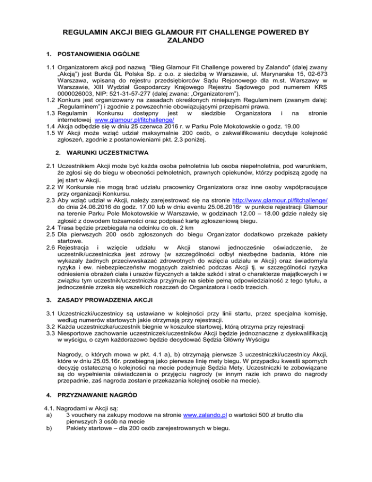 REGULAMIN AKCJI BIEG GLAMOUR FIT CHALLENGE POWERED BY ZALANDO 1. POSTANOWIENIA OGÓLNE 1.1 Organizatorem akcji pod nazwą "Bieg Glamour Fit Challenge powered by Zalando" (dalej zwany „Akcją”) jest Burda GL Polska Sp. z o.o. z siedzibą w Warszawie, ul. Marynarska 15, 02-673 Warszawa, wpisaną do rejestru przedsiębiorców Sądu Rejonowego dla m.st. Warszawy w Warszawie, XIII Wydział Gospodarczy Krajowego Rejestru Sądowego pod numerem KRS 0000026003, NIP: 521-31-57-277 (dalej zwana: „Organizatorem”). 1.2 Konkurs jest organizowany na zasadach określonych niniejszym Regulaminem (zwanym dalej: „Regulaminem”) i zgodnie z powszechnie obowiązującymi przepisami prawa. 1.3 Regulamin Konkursu dostępny jest w siedzibie Organizatora i na stronie internetowej www.glamour.pl/fitchallenge/ 1.4 Akcja odbędzie się w dniu 25 czerwca 2016 r. w Parku Pole Mokotowskie o godz. 19.00 1.5 W Akcji może wziąć udział maksymalnie 200 osób, o zakwalifikowaniu decyduje kolejność zgłoszeń, zgodnie z postanowieniami pkt. 2.3 poniżej. 2. WARUNKI UCZESTNICTWA 2.1 Uczestnikiem Akcji może być każda osoba pełnoletnia lub osoba niepełnoletnia, pod warunkiem, że zgłosi się do biegu w obecności pełnoletnich, prawnych opiekunów, którzy podpiszą zgodę na jej start w Akcji. 2.2 W Konkursie nie mogą brać udziału pracownicy Organizatora oraz inne osoby współpracujące przy organizacji Konkursu. 2.3 Aby wziąć udział w Akcji, należy zarejestrować się na stronie http://www.glamour.pl/fitchallenge/ do dnia 24.06.2016 do godz. 17.00 lub w dniu eventu 25.06.2016r w punkcie rejestracji Glamour na terenie Parku Pole Mokotowskie w Warszawie, w godzinach 12.00 – 18.00 gdzie należy się zgłosić z dowodem tożsamości oraz podpisać kartę zgłoszeniową biegu. 2.4 Trasa będzie przebiegała na odcinku do ok. 2 km 2.5 Dla pierwszych 200 osób zgłoszonych do biegu Organizator dodatkowo przekaże pakiety startowe. 2.6 Rejestracja i wzięcie udziału w Akcji stanowi jednocześnie oświadczenie, że uczestnik/uczestniczka jest zdrowy (w szczególności odbył niezbędne badania, które nie wykazały żadnych przeciwwskazać zdrowotnych do wzięcia udziału w Akcji) oraz świadomy/a ryzyka i ew. niebezpieczeństw mogących zaistnieć podczas Akcji tj. w szczególności ryzyka odniesienia obrażeń ciała i urazów fizycznych a także szkód i strat o charakterze majątkowych i w związku tym uczestnik/uczestniczka przyjmuje na siebie pełną odpowiedzialność z tego tytułu, a jednocześnie zrzeka się wszelkich roszczeń do Organizatora i osób trzecich. 3. ZASADY PROWADZENIA AKCJI 3.1 Uczestniczki/uczestnicy są ustawiane w kolejności przy linii startu, przez specjalna komisję, według numerów startowych jakie otrzymają przy rejestracji. 3.2 Każda uczestniczka/uczestnik biegnie w koszulce startowej, którą otrzyma przy rejestracji 3.3 Niesportowe zachowanie uczestniczek/uczestników Akcji będzie jednoznaczne z dyskwalifikacją w wyścigu, o czym każdorazowo będzie decydować Sędzia Główny Wyścigu Nagrody, o których mowa w pkt. 4.1 a), b) otrzymają pierwsze 3 uczestniczki/uczestnicy Akcji, które w dniu 25.05.16r. przebiegną jako pierwsze linię mety biegu. W przypadku kwestii spornych decyzję ostateczną o kolejności na mecie podejmuje Sędzia Mety. Uczestniczki te zobowiązane są do wypełnienia oświadczenia o przyjęciu nagrody (w innym razie ich prawo do nagrody przepadnie, zaś nagroda zostanie przekazania kolejnej osobie na mecie). 4. PRZYZNAWANIE NAGRÓD 4.1. Nagrodami w Akcji są: a) 3 vouchery na zakupy modowe na stronie www.zalando.pl o wartości 500 zł brutto dla pierwszych 3 osób na mecie b) Pakiety startowe – dla 200 osób zarejestrowanych w biegu. 4.2. Za wygraną nagrodę nie przysługuje ekwiwalent pieniężny ani rzeczowy. 4.3. Laureatki/laureaci Konkursu nie mają prawa do scedowania nagrody na inną osobę. 5. PODSTĘPOWANIE REKLAMACYJNE 5.1. Każdemu uczestnikowi Akcji przysługuje prawo wniesienia reklamacji, bezpośrednio na miejscu Akcji, do Sędziego Głównego. Decyzja Sędziego Głównego w sprawie reklamacji będzie ostateczna, co nie uchybia ew. uprawnieniom do dochodzenia roszczeń na drodze postępowania sądowego 6. KOMISJA 6.1. Do kontroli prawidłowości Akcji zostanie powołana Komisja Techniczna, w której skład wchodzić będą: • Sędzia Główny • Sędzia Startu • Sędzia Mety 6.2. Komisja Techniczna będzie nadzorować wykonanie przez Organizatora wszystkich zobowiązań wynikających z niniejszego Regulaminu. 7. POSTANOWIENIA KOŃCOWE 7.1. Uczestnicy, którzy nie spełnią któregokolwiek z wymogów określonych w niniejszym Regulaminie lub podadzą nieprawdziwe informacje, zostaną automatycznie zdyskwalifikowane, zgodnie z decyzją Organizatora. 7.2 Organizator zastrzega sobie prawo do opublikowania relacji z Akcji, w szczególności w na łamach magazynów Gala, Glamour, Instyle, Elle oraz stronach internetowych: glamour.pl, elle.pl oraz Social Media: Glamour oraz Elle, na co wszyscy Uczestnicy/Uczestniczki Akcji wyrażają zgodę. 7.3 W sprawach nie uregulowanych niniejszym Regulaminem zastosowanie znajdą odpowiednie przepisy prawa polskiego. 7.4 Dane osobowe uczestniczek/uczestników Akcji będą wykorzystane wyłącznie dla potrzeb Akcji na zasadach określonych w Regulaminie. Dane osobowe będą chronione zgodnie z ustawą o ochronie danych osobowych. Dane osobowe uczestniczki Akcji tj. imię, nazwisko, adres będą przetwarzane przez Organizatora Konkursu wyłącznie na zasadach określonych w Regulaminie, w szczególności w celu opublikowania wyników Akcji oraz przekazania laureatkom/laureatom. nagród. Uczestniczkom/Uczestniczkom Akcji przysługuje prawo wglądu do swoich danych oraz ich poprawiania. Podanie danych jest dobrowolne, lecz ich brak uniemożliwia wzięcie udziału w Akcji. Organizator informuje, iż dane osobowe laureatek/laureatów Akcji zostaną opublikowane w czasopiśmie Glamour, Elle i