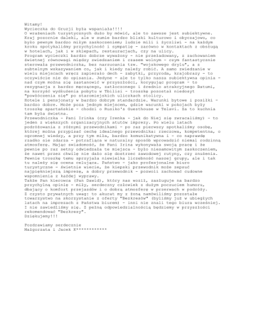 Witamy! Wycieczka do Gruzji była wspaniała!!!! O wrażeniach turystycznych dużo by mówić, ale to zawsze jest subiektywne. Kraj pozornie daleki, ale w sumie bardzo bliski kulturowo i obyczajowo, co było pewnym bardzo miłym zaskoczeniem; ludzie mili i życzliwi - na każdym kroku spotykaliśmy przychylność i sympatię - zarówno w kontaktach z obsługą w hotelach, jak i w sklepach, restauracjach, czy na ulicy. Program wycieczki bardzo dobrze wyważony - nie przeładowany, z zachowaniem świetnej równowagi między zwiedzaniem i czasem wolnym - czym fantastycznie sterowała przewodniczka, bez narzucania tzw. "wojskowego drylu", a z subtelnym wskazywaniem co, jak i kiedy należy robić. A samo zwiedzanie w wielu miejscach wręcz zapierało dech - zabytki, przyroda, krajobrazy - to oczywiście nie do opisania. Jedyne - ale to tylko nasza subiektywna opinia nad czym można się zastanowić w przyszłości, korygując program - to rezygnacja z bardzo męczącego, zatłoczonego i średnio atrakcyjnego Batumi, na korzyść wydłużenia pobytu w Tbilisi - troszkę pozostał niedosyt "powłóczenia się" po staromiejskich uliczkach stolicy. Hotele i pensjonaty w bardzo dobrym standardzie. Warunki bytowe i posiłki bardzo dobre. Może poza jednym miejscem, gdzie warunki w pokojach były troszkę spartańskie - chodzi o Rusiko's Guesthouse w Telavi. Za to kuchnia tam była świetna. Przewodniczka - Pani Irinka (czy Irenka - jak do Niej się zwracaliśmy) - to jeden z większych organizacyjnych atutów imprezy. Po wielu latach podróżowania z różnymi przewodnikami - po raz pierwszy spotkaliśmy osobę, której można przypisać cechę idealnego przewodnika: rzeczowa, kompetentna, o ogromnej wiedzy, a przy tym miła, bardzo komunikatywna i - co naprawdę rzadko sie zdarza - potrafiąca w naturalny sposób wprowadzić niemal rodzinną atmosferę. Mając swiadomość, że Pani Irina wykonywała swoją pracę i że pewnie po raz setny odwiedzała te miejsca - było niesamowitym zaskoczeniem, że nawet przez chwilę nie dało się dostrzec zawodowej rutyny, czy znużenia. Pewnie troszkę temu sprzyjała niewielka liczebność naszej grupy, ale i tak tu należy się ocena celująca. Państwo - jako profesjonalne biuro turystyczne - świetnie wiecie, że kiepski przewodnik może zepsuć najpiękniejszą imprezę, a dobry przewodnik - pozwoli zachować cudowne wspomnienia z każdej wyprawy. Także Pan kierowca (Pan Dawid), który nas woził, zasługuje na bardzo przychylną opinię - miły, serdeczny człowiek z dużym poczuciem humoru, dbający o komfort przejazdów i o dobrą atmosferę w przerwach w podróży. Z czysto prywatnych uwag: to akurat my z żoną namówiliśmy pozostałe towarzystwo na skorzystanie z oferty "Bezkresów" (byliśmy już w ubiegłych latach na imprezach z Państwa biurem) - inni nie znali tego biura wcześniej. I nie zawiedliśmy się. Z pełną odpowiedzialnością będziemy w przyszłości rekomendować "Bezkresy". Dziękujemy!!! Pozdrawiamy serdecznie Małgorzata i Jacek K************