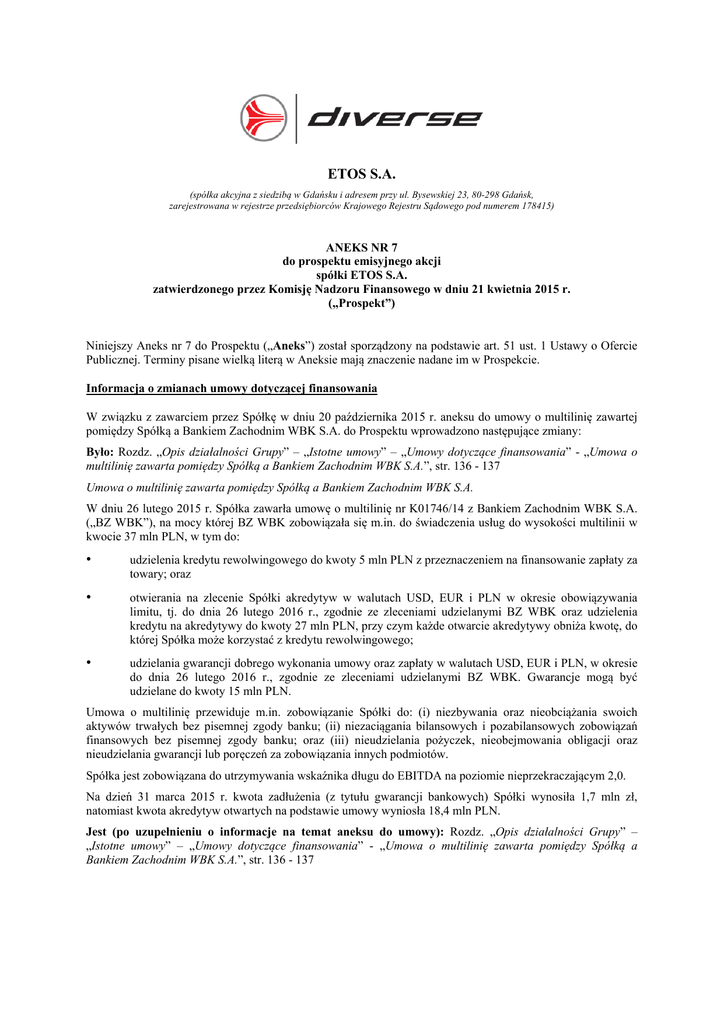 ETOS S.A. (spółka akcyjna z siedzibą w Gdańsku i adresem przy ul. Bysewskiej 23, 80-298 Gdańsk, zarejestrowana w rejestrze przedsiębiorców Krajowego Rejestru Sądowego pod numerem 178415) ANEKS NR 7 do prospektu emisyjnego akcji spółki ETOS S.A. zatwierdzonego przez Komisję Nadzoru Finansowego w dniu 21 kwietnia 2015 r. („Prospekt”) Niniejszy Aneks nr 7 do Prospektu („Aneks”) został sporządzony na podstawie art. 51 ust. 1 Ustawy o Ofercie Publicznej. Terminy pisane wielką literą w Aneksie mają znaczenie nadane im w Prospekcie. Informacja o zmianach umowy dotyczącej finansowania W związku z zawarciem przez Spółkę w dniu 20 października 2015 r. aneksu do umowy o multilinię zawartej pomiędzy Spółką a Bankiem Zachodnim WBK S.A. do Prospektu wprowadzono następujące zmiany: Było: Rozdz. „Opis działalności Grupy” – „Istotne umowy” – „Umowy dotyczące finansowania” - „Umowa o multilinię zawarta pomiędzy Spółką a Bankiem Zachodnim WBK S.A.”, str. 136 - 137 Umowa o multilinię zawarta pomiędzy Spółką a Bankiem Zachodnim WBK S.A. W dniu 26 lutego 2015 r. Spółka zawarła umowę o multilinię nr K01746/14 z Bankiem Zachodnim WBK S.A. („BZ WBK”), na mocy której BZ WBK zobowiązała się m.in. do świadczenia usług do wysokości multilinii w kwocie 37 mln PLN, w tym do: • udzielenia kredytu rewolwingowego do kwoty 5 mln PLN z przeznaczeniem na finansowanie zapłaty za towary; oraz • otwierania na zlecenie Spółki akredytyw w walutach USD, EUR i PLN w okresie obowiązywania limitu, tj. do dnia 26 lutego 2016 r., zgodnie ze zleceniami udzielanymi BZ WBK oraz udzielenia kredytu na akredytywy do kwoty 27 mln PLN, przy czym każde otwarcie akredytywy obniża kwotę, do której Spółka może korzystać z kredytu rewolwingowego; • udzielania gwarancji dobrego wykonania umowy oraz zapłaty w walutach USD, EUR i PLN, w okresie do dnia 26 lutego 2016 r., zgodnie ze zleceniami udzielanymi BZ WBK. Gwarancje mogą być udzielane do kwoty 15 mln PLN. Umowa o multilinię przewiduje m.in. zobowiązanie Spółki do: (i) niezbywania oraz nieobciążania swoich aktywów trwałych bez pisemnej zgody banku; (ii) niezaciągania bilansowych i pozabilansowych zobowiązań finansowych bez pisemnej zgody banku; oraz (iii) nieudzielania pożyczek, nieobejmowania obligacji oraz nieudzielania gwarancji lub poręczeń za zobowiązania innych podmiotów. Spółka jest zobowiązana do utrzymywania wskaźnika długu do EBITDA na poziomie nieprzekraczającym 2,0. Na dzień 31 marca 2015 r. kwota zadłużenia (z tytułu gwarancji bankowych) Spółki wynosiła 1,7 mln zł, natomiast kwota akredytyw otwartych na podstawie umowy wyniosła 18,4 mln PLN. Jest (po uzupełnieniu o informacje na temat aneksu do umowy): Rozdz. „Opis działalności Grupy” – „Istotne umowy” – „Umowy dotyczące finansowania” - „Umowa o multilinię zawarta pomiędzy Spółką a Bankiem Zachodnim WBK S.A.”, str. 136 - 137 Umowa o multilinię zawarta pomiędzy Spółką a Bankiem Zachodnim WBK S.A. W dniu 26 lutego 2015 r. Spółka zawarła umowę o multilinię nr K01746/14 z Bankiem Zachodnim WBK S.A. („BZ WBK”), na mocy której BZ WBK zobowiązała się m.in. do świadczenia usług do wysokości multilinii w kwocie 37 mln PLN, w tym do: • udzielenia kredytu rewolwingowego do kwoty 5 mln PLN z przeznaczeniem na finansowanie zapłaty za towary; oraz • otwierania na zlecenie Spółki akredytyw w walutach USD, EUR i PLN w okresie obowiązywania limitu, tj. do dnia 26 lutego 2016 r., zgodnie ze zleceniami udzielanymi BZ WBK oraz udzielenia kredytu na akredytywy do kwoty 27 mln PLN, przy czym każde otwarcie akredytywy obniża kwotę, do której Spółka może korzystać z kredytu rewolwingowego; • udzielania gwarancji dobrego wykonania umowy oraz zapłaty w walutach USD, EUR i PLN, w okresie do dnia 26 lutego 2016 r., zgodnie ze zleceniami udzielanymi BZ WBK. Gwarancje mogą być udzielane do kwoty 15 mln PLN. Umowa o multilinię przewiduje m.in. zobowiązanie Spółki do: (i) niezbywania oraz nieobciążania swoich aktywów trwałych bez pisemnej zgody banku; (ii) niezaciągania bilansowych i pozabilansowych zobowiązań finansowych bez pisemnej zgody banku; oraz (iii) nieudzielania pożyczek, nieobejmowania obligacji oraz nieudzielania gwarancji lub poręczeń za zobowiązania innych podmiotów. Spółka jest zobowiązana do utrzymywania wskaźnika długu do EBITDA na poziomie nieprzekraczającym 2,0. Na dzień 31 marca 2015 r. kwota zadłużenia (z tytułu gwarancji bankowych) Spółki wynosiła 1,7 mln zł, natomiast kwota akredytyw otwartych na podstawie umowy wyniosła 18,4 mln PLN. W dniu 20 października 2015 r. Spółka zawarła aneks do umowy o multilinię z BZ WBK, na mocy którego nastąpiło podwyższenie limitu zaangażowania BZ WBK w finansowanie Spółki do wysokości multilinii w kwocie: 55 mln PLN w okresie do dnia 27 lutego 2016 r., 50 mln PLN w okresie od dnia 28 lutego 2016 r. do dnia 30 marca 2016 r. oraz 45 mln PLN w okresie do dnia 31 marca 2016 r., w tym do: • udzielenia kredytu w rachunku bieżącym do kwoty 10 mln PLN z przeznaczeniem na finansowanie bieżącej działalności gospodarczej; • udzielenia kredytu rewolwingowego do kwoty 5 mln PLN z przeznaczeniem na finansowanie zapłaty za towary; • otwierania na zlecenie Spółki akredytyw w walutach USD, EUR i PLN w okresie obowiązywania limitu, zgodnie ze zleceniami udzielanymi BZ WBK oraz udzielenia kredytu na akredytywy do kwoty: 37 mln PLN w okresie do dnia 27 lutego 2016 r. oraz 32 mln PLN w okresie od dnia 1 marca 2016 r. do 120 dnia poprzedzającego dzień spłaty dla kredytu na akredytywy, tj.19 kwietnia 2017 r., przy czym każde otwarcie akredytywy obniża kwotę, do której Spółka może korzystać z kredytu rewolwingowego; oraz • udzielania gwarancji dobrego wykonania umowy oraz zapłaty w walutach USD, EUR i PLN, w okresie do dnia 31 marca 2016 r., zgodnie ze z