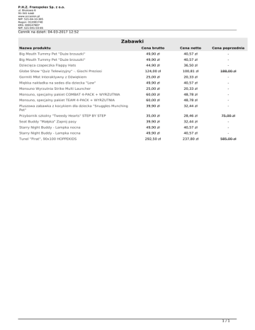 P.H.Z. Franspolex Sp. z o.o. ul. Brukowa 6 91-341 Łódź www.occasion.pl NIP: 521-04-10-385 Regon: 012001740 KRS: 000147807 NIP: 521-041-03-85 Cennik na dzień: 04-03-2017 12:52 Zabawki Nazwa produktu Cena brutto Cena netto Cena poprzednia Big Mouth Tummy Pet "Duże brzuszki" 49,90 zł 40,57 zł - Big Mouth Tummy Pet "Duże brzuszki" 49,90 zł 40,57 zł - Dziecięca czapeczka Flappy Hats 44,90 zł 36,50 zł - Globe Show "Quiz Telewizyjny" -. Giochi Preziosi 124,00 zł 100,81 zł 188,00 zł Gormiti Młot Interaktywny z Dźwiękiem 25,00 zł 20,33 zł - Miękka nakładka na sedes dla dziecka "Lew" 49,90 zł 40,57 zł - Monsuno Wyrzutnia Strike Multi Launcher 25,00 zł 20,33 zł - Monsuno, specjalny pakiet COMBAT 4-PACK + WYRZUTNIA 60,00 zł 48,78 zł - Monsuno, specjalny pakiet TEAM 4-PACK + WYRZUTNIA 60,00 zł 48,78 zł - Pluszowa zabawka z kocykiem dla dziecka "Snuggles Munching Pet" 39,90 zł 32,44 zł - Przybornik szkolny "Tweedy Hearts" STEP BY STEP 35,00 zł 28,46 zł 75,00 zł Seat Buddy "Małpka" Zapnij pasy 39,90 zł 32,44 zł - Starry Night Buddy - Lampka nocna 49,90 zł 40,57 zł - Starry Night Buddy - Lampka nocna 49,90 zł 40,57 zł - 292,50 zł 237,80 zł 585,00 zł Tunel "Pirat", 90x100 HOPPEKIDS 1/1 Powered by TCPDF (www.tcpdf.org)