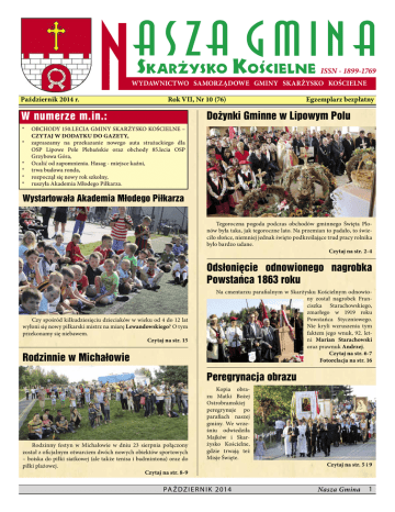 ISSN - 1899-1769 WYDAWNICTWO SAMORZĄDOWE GMINY SKARŻYSKO KOŚCIELNE Październik 2014 r. Rok VII, Nr 10 (76) Egzemplarz bezpłatny Dożynki Gminne w Lipowym Polu W numerze m.in.: * OBCHODY 150.LECIA GMINY SKARŻYSKO KOŚCIELNE – CZYTAJ W DODATKU DO GAZETY, * zapraszamy na przekazanie nowego auta strażackiego dla OSP Lipowe Pole Plebańskie oraz obchody 85.lecia OSP Grzybowa Góra, * Ocalić od zapomnienia. Hasag - miejsce kaźni, * trwa budowa ronda, * rozpoczął się nowy rok szkolny, * ruszyła Akademia Młodego Piłkarza. Wystartowała Akademia Młodego Piłkarza Tegoroczna pogoda podczas obchodów gminnego Święta Plonów była taka, jak tegoroczne lato. Na przemian to padało, to świeciło słońce, niemniej jednak święto podkreślające trud pracy rolnika było bardzo udane. Czytaj na str. 2-4 Odsłonięcie odnowionego nagrobka Powstańca 1863 roku Czy spośród kilkudziesięciu dzieciaków w wieku od 4 do 12 lat wyłoni się nowy piłkarski mistrz na miarę Lewandowskiego? O tym przekonamy się niebawem. Czytaj na str. 15 Rodzinnie w Michałowie Na cmentarzu parafialnym w Skarżysku Kościelnym odnowiony został nagrobek Franciszka Starachowskiego, zmarłego w 1919 roku Powstańca Styczniowego. Nie kryli wzruszenia tym faktem jego wnuk, 92. letni Marian Starachowski oraz prawnuk Andrzej. Czytaj na str. 6-7 Fotorelacja na str. 16 Peregrynacja obrazu Rodzinny festyn w Michałowie w dniu 23 sierpnia połączony został z oficjalnym otwarciem dwóch nowych obiektów sportowych – boiska do piłki siatkowej (ale także tenisa i badmintona) oraz do piłki plażowej. Czytaj na str. 8-9 Kopia obrazu Matki Bożej Ostrobramskiej peregrynuje po parafiach naszej gminy. We wrześniu odwiedziła Majków i Skarżysko Kościelne, gdzie trwają też Misje Święte. PA Ź DZ I E R N I K 2014 Czytaj na str. 5 i 9 Nasza Gmina 1 W y darzenia Dożynki Gminne w Lipowym Polu Żniwa się skończyły, zboże już sprzątnięto. Dzisiaj wszyscy chłopi, obchodzą swe święto. Zebrali się młodzi, razem ze starszymi, By się wspólnie cieszyć, plonami żniwnymi. Składamy wam plony, matki i ojcowie, My, młodzi żniwiarze, córki i synowie. Życzymy Wam przy tym, byście długo żyli. Pracowali z nami, równo chleb dzielili. Tegoroczna pogoda podczas obchodów gminnego Święta Plonów była taka, jak tegoroczne lato. Na przemian to padało, to świeciło słońce, niemniej jednak święto podkreślające trud pracy rolnika było bardzo udane. Uroczystości rozpoczęły się Mszą św. w kościele parafialnym w Lipowym Polu, którą sprawował proboszcz ks. Mirosław Maciąg. Delegacje poszczególnych sołectw przed ołtarzem złożyły wieńce, a chleb z tegorocznych zbiorów na ołtarz przekazali starostowie dożynek – Bożena Sadza z Lipowego Pola Skarbowego oraz Jerzy Bernat z Lipowego Pola Plebańskiego. Chleb, wieńce oraz dary przekazane przez delegacje w trakcie nabożeństwa zostały poświęcone. Msza św. uświetniona została obecnością pocztów sztandarowych Gminy Skarżysko Kościelne, kolejarzy oraz jednostek OSP. Po uroczystościach kościelnych korowód dożynkowy poprze- 2 Nasza Gmina PA Ź DZ I E R N I K 2014 W y darzenia dzony konną bryczką dotarł przed strażacką remizę w Lipowym Polu Plebańskim, gdzie przybyłych powitał prezes miejscowej straży Tadeusz Chyb. Wśród licznych gości znaleźli się poseł Andrzej Bętkowski, członek zarządu województwa Kazimierz Kotowski, władze Powiatu Skarżyskiego, radna powiatowa Danuta Banaczek, wójt gminy Zdzisław Woźniak, radni z przewodniczącym rady Pawłem Wiatrem. Tradycyjnego ośpiewania wieńców dożynkowych dokonał zespół Grzybowianki, okolicznościowy wiersz o chlebie recytowała Bożena Sadza. Bogu najpierw dzięki za zdrowie, pogodę. Potem naszym władzom. Dobrze wam, dobrze nam, lepiej jeszcze trzeba, Rządźcie gospodarze, by nie brakło chleba. Po krótkim wystąpieniu wójta Zdzisława Woźniaka starostowie na jego ręce przekazali chleb z tegorocznych zbiorów, bochny te przekazał on sołtysom, a ci z kolei podzielili się nimi z uczestnikami dożynek. W części artystycznej wystąpili: zespół Grzybowianki, Niedźwiadki, dzieci z obu świetlic wiejskich, zespół Romano, kabaret Grom oraz zespół Perły z lamusa z MCK w Skarżysku-Kamiennej. Ogłoszone zostały też wyniki konkursu Piękna i bezpieczna posesja. I miejsce jury przyznało Bożenie i Januszowi Sadza z Lipowego Pola Skarbowego, II – Piotrowi Stopińskiemu z Lipowego Pola Skarbowego a III Bożenie i Zygmuntowi Działak z Majkowa. Wyróżniono posesje Ewy i Stanisława Czubak z Kierza, Moniki i Dariusza Nowak z Lipowego Pola Skarbowego oraz Haliny i Tadeusza Sieczków, Pawła Sieczki, Justyny Jaros, Zofii Suwara i Mieczysława Białkowskiego – wszyscy ze Skarżyska Kościelnego. Wręczono też tytuły Rolnika Roku. Z Grzybowej Góry byli to: Henryk Młudziński, Piotr Janiec, Zbigniew Piętak, Lech Błach, Marek Jaśkiewicz, Ireneusz Błach, Mieczysław Stefaniak, Szczepan Piętak, Małgorzata i Marian Płusa, Tadeusz Piętak, Renata i Tadeusz Piętak, Grzegorz Derlatka, Kazimierz Milcarz, Małgorzata Król, Bogusława Śniegulska, Mieczysław Kępas, Zofia Brzezińska, Władysław Derlatka, Alicja i Edward Zając, Halina i Leszek Sieczka, Monika i Janusz Ulewińscy, Jadwiga Dziwit, PA Ź DZ I E R N I K 2014 Nasza Gmina 3 W y darzenia Olbryś, Wandę i Kazimierza Sułek, Alicję Borkowską, Ireneusza Pająka (Skarżysko Kościelne II) oraz Elizę i Jerzego Polańskich (Świerczek). Organizatorzy zadbali też o inne atrakcje. Można było skorzystać ze stoisk kulinarnych, grilla, wziąć udział w loterii, nabyć rękodzieło wykonane przez dzieci ze szkoły i świetlicy. Furorę robiły również wykonane przez Renatę Kępę maskotki naszych samorządowców. Wieczorem zaś do zabawy zagrał zespół KoliBeer, przy muzyce którego bawiono się doskonale do późnych godzin nocnych. W przygotowanie dożynek mocno Agata i Janu