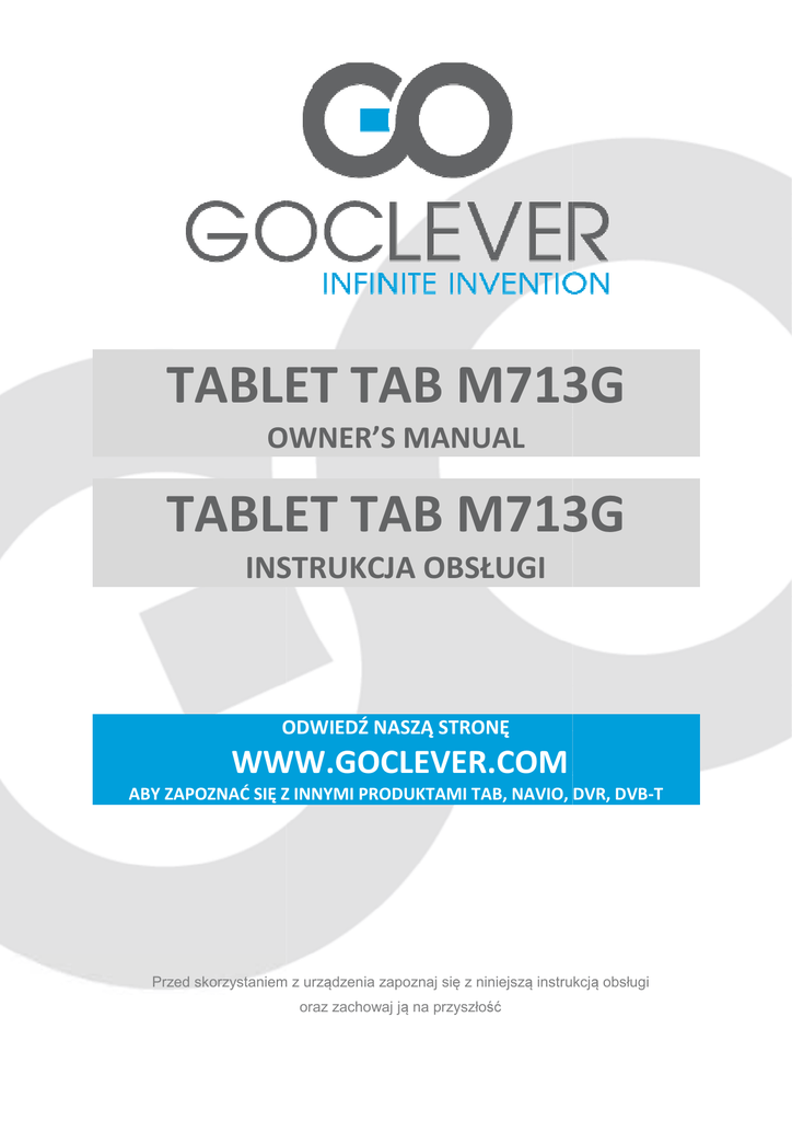 TABLET TAB M713G 3G OWNER’S MANUAL TABLET TAB M713G 3G INSTRUKCJA OBSŁUGI ODWIEDŹ NASZĄ STRONĘ WWW.GOCLEVER.COM ABY ZAPOZNAĆ SIĘ Z INNYMI PRODUKTAMI TAB, NAVIO, DVR, DVB-T DVB Przed skorzystaniem z urządzenia urzą ą zapoznaj się ę z niniejszą ą instrukcją ą obsługi oraz zachowaj ją na przyszłość Contents / Spis treści treś English Polski Warunki gwarancji 3 19 36 2 Contents INTRODUCTION ATTENTION PRODUCT Packing List Buttons Specifications QUICK GUIDE Power on/off Battery and Charging Icons OPERATION Audio Player Photo and Video Player Recorder FM Radio File Management Internet Browser Dialing Contacts Messages Memory Cards Camera SYSTEM SETTINGS Wi-Fi Settings Other Settings DESKTOP SETTINGS Adding and Deleting Icons Wallpaper Settings Small Icons 4 4 5 5 5 6 7 7 7 8 9 9 10 11 11 12 12 13 13 13 14 14 15 15 15 17 17 17 18 3 Introduction Dear Customer, thank you for your purchasing our products. For your security, read the product instructions and all attached data before using it. If you don’t operate the product in accordance with product instructions, it can result in any personal injury, property or other losses, the company will not responsible for that. Copyrights of instructions ions belongs to our company; Mentioned trademarks, type size in the instructions belongs to their respective owners; If the content of instructions is inconsistent with the actual products, whichever are actual products. If you are unknown or objectionable to the clauses of the instructions, please propose a written objection to our company within 7 days after purchasing it. Otherwise you have accepted and understood all the content of the instructions. Attention 1. LCD maintenance: Don't put any heavy objects bjects on the device. Please make sure that you haven’t put too many things in the bag or besides the device when using suitcase or backpack. Don't grasp, twist or impact the surface of the LCD. Don't put LCD in environment beyond 40 degree or humidity over o 90%. Don't expose LCD in the direct sunlight or strong fluorescent. Please don't use corrosive cleaning agent to clean LCD to avoid any damage. 2. Please do not block ventilating radiator to avoid device over heat. 3. Please don't remove memory card while system is reading data from it. 4. Please don't take the case apart when the system is working or data would be damaged, even lost. Please copy those important files by yourself timely, especially, before you decide deci to format the disks. 5. Please use the power adapter according to the safe usage rules 6. Use only original adapter provided by supplier. 7. Make sure the device is away from the harsh environment (high-temperature, (high low temperature, high humidity). 10. Only the authorized people of our agency can assemble or disassemble the device, please prevent the seal from any damage for after-sales after service. 11. Write down all passwords used to secure your device. If you forget your password, all data can be lost. 4 Product Packing List Tablet device 1 pc Memory (TF) card (optional) 1 pc AC Adapter 1 pc USB cable 1 pc User manual 1 pc Warranty card 1 pc Buttons Position Definition Function instruction A Button Press for more than 3 sec to Power on/off , press for 1 sec to stand by. B Button Volume increase/decrease C Camera port Back camera D Port SIM card port E Port Micro SD card port, Reset F Port USB Port G Port HDMI Output H Port Recorder Port I Camera Front Camera Speaker port Two speakers Port Earphone port J-K M 5 Specifications Dimensions 193.7 x 122.6 x 10.2mm Weight 370g LCD Size 7” Resolution 1024 x 600 USB port micro microUSB 2.0 CPU ARM DC Cortex A9 1.0GHz Internal memory Flash Memory: 4GB Flash RAM 1G DDR2 Flash memory Suppo microSD cards up to 32GB Supports capacity Power Music function Video function Image 3.7V/4500mAh Li-ion, DC5V Adapter Play format MP3,WMA,WAV,OGG,AAC,APE MP3 Max. bitrate 8Kbps ~ 392 Kbps Support WMA, WMV Supports Max. bitrate 5Kbps ~ 192 Kbps Frequency 20Hz ~ 20KHz Noise oise 90dB Format AVI,MPEG4,FlV,AVI,MKV,3GP,TS.H.264, MPEG4, H.263, DivX, Xvid,VC-1 Xvid,VC Max resolution 1920 x 1080 Display mode 4:3, 16:9, Full screen JPG, PNG, BMP Format TXT, LRC, PDF, Html, Htm, Htm EPUB Mass storage 5M Chipset MT6620-S500 Speed Max. 54Mbps Distance Max. 100m Frequency 2.4GHz 802.11n FM Receiver frequency 87.5 ~ 108.0MHZ Recorder WAV format recorder E-reader Wi-Fi Function Working tempreature -10 ~ +70°C OS Windows 2000/XP/WIN7/Vista, Mac OS V9.0/10.0 6 Quick Guide Power on/off Power on and unlock: press ress “power “ button” for 3 sec to power on, press and slide to The device will be unlocked: Sleep mode and unlock: choose “Display” in settings, setting choose closed after 15sec and device will be sleep after 15 sec and be locked. Power off: press “power button” for 3 sec, choose “ok” to power off the device. lease reset device or press “power button” for 6 Attention: please sec to cut the power off when no reaction. Battery and charging 1. Please charge for 4-8 hours rs at first-time first use. 2. Connect AC adapter with the device and will be charged as stand for full battery 3. Please charge for 1 min at least and start device when no power. power 7 Icons Icon Function Back to Menu System info Back Menu Related Application Time Icon Function USB debug USB Connected Wi-Fi Connected Bluetooth Connected Battery Signal strength 8 Operation Audio Player Press this button to enter music player. • Press • Hold Icon to enter music list to fast play Function Icon Function Artist Personal ersonal music Song Name Play list Current play Random play Repeat all music Repeat single music Previous revious Next Play Pause 9 Photo and Video Player Press this button to enter photo browser. Press to back to main menu. • Hold • Video format support: AVI, MPEG4, FlV, AVI, MKV, 3GP, TS etc. • Photo format support: t: JPG, PNG, BMP etc. to choose chapter, chapter press to exit. Press to pause. 10 Recorder Pres