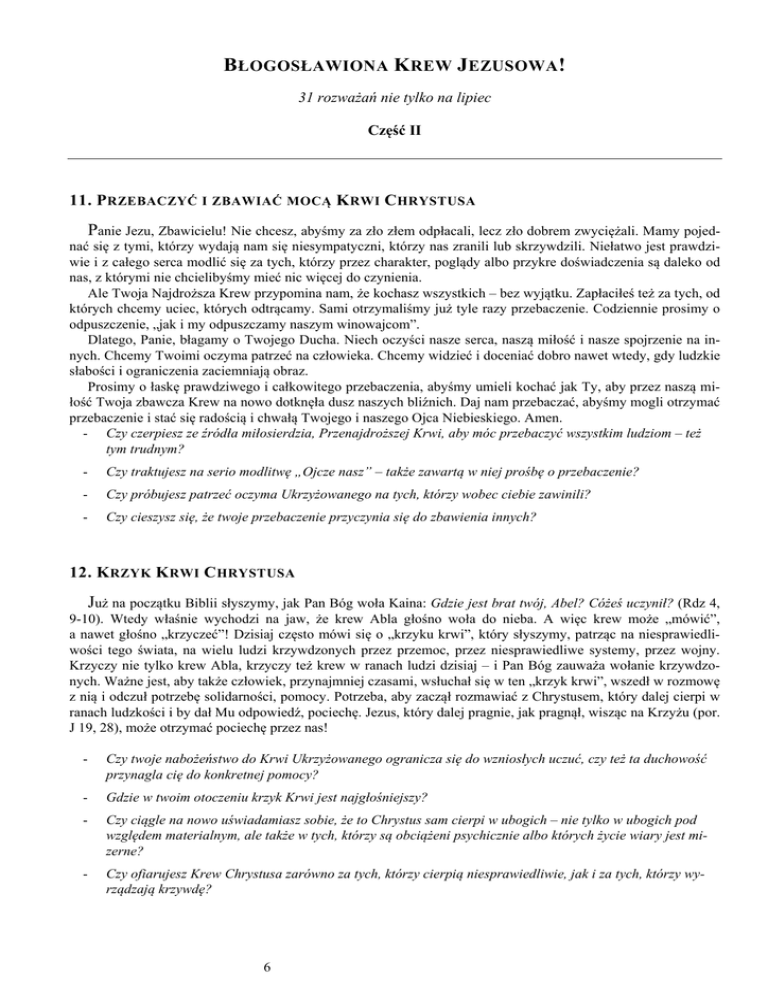 BŁOGOSŁAWIONA K REW J EZUSOWA ! 31 rozważań nie tylko na lipiec Część II 11. P RZEBACZYĆ I ZBAWIAĆ MOCĄ K RWI C HRYSTUSA Panie Jezu, Zbawicielu! Nie chcesz, abyśmy za zło złem odpłacali, lecz zło dobrem zwyciężali. Mamy pojednać się z tymi, którzy wydają nam się niesympatyczni, którzy nas zranili lub skrzywdzili. Niełatwo jest prawdziwie i z całego serca modlić się za tych, którzy przez charakter, poglądy albo przykre doświadczenia są daleko od nas, z którymi nie chcielibyśmy mieć nic więcej do czynienia. Ale Twoja Najdroższa Krew przypomina nam, że kochasz wszystkich – bez wyjątku. Zapłaciłeś też za tych, od których chcemy uciec, których odtrącamy. Sami otrzymaliśmy już tyle razy przebaczenie. Codziennie prosimy o odpuszczenie, „jak i my odpuszczamy naszym winowajcom”. Dlatego, Panie, błagamy o Twojego Ducha. Niech oczyści nasze serca, naszą miłość i nasze spojrzenie na innych. Chcemy Twoimi oczyma patrzeć na człowieka. Chcemy widzieć i doceniać dobro nawet wtedy, gdy ludzkie słabości i ograniczenia zaciemniają obraz. Prosimy o łaskę prawdziwego i całkowitego przebaczenia, abyśmy umieli kochać jak Ty, aby przez naszą miłość Twoja zbawcza Krew na nowo dotknęła dusz naszych bliźnich. Daj nam przebaczać, abyśmy mogli otrzymać przebaczenie i stać się radością i chwałą Twojego i naszego Ojca Niebieskiego. Amen. - Czy czerpiesz ze źródła miłosierdzia, Przenajdroższej Krwi, aby móc przebaczyć wszystkim ludziom – też tym trudnym? - Czy traktujesz na serio modlitwę „Ojcze nasz” – także zawartą w niej prośbę o przebaczenie? - Czy próbujesz patrzeć oczyma Ukrzyżowanego na tych, którzy wobec ciebie zawinili? - Czy cieszysz się, że twoje przebaczenie przyczynia się do zbawienia innych? 12. K RZYK K RWI C HRYSTUSA Już na początku Biblii słyszymy, jak Pan Bóg woła Kaina: Gdzie jest brat twój, Abel? Cóżeś uczynił? (Rdz 4, 9-10). Wtedy właśnie wychodzi na jaw, że krew Abla głośno woła do nieba. A więc krew może „mówić”, a nawet głośno „krzyczeć”! Dzisiaj często mówi się o „krzyku krwi”, który słyszymy, patrząc na niesprawiedliwości tego świata, na wielu ludzi krzywdzonych przez przemoc, przez niesprawiedliwe systemy, przez wojny. Krzyczy nie tylko krew Abla, krzyczy też krew w ranach ludzi dzisiaj – i Pan Bóg zauważa wołanie krzywdzonych. Ważne jest, aby także człowiek, przynajmniej czasami, wsłuchał się w ten „krzyk krwi”, wszedł w rozmowę z nią i odczuł potrzebę solidarności, pomocy. Potrzeba, aby zaczął rozmawiać z Chrystusem, który dalej cierpi w ranach ludzkości i by dał Mu odpowiedź, pociechę. Jezus, który dalej pragnie, jak pragnął, wisząc na Krzyżu (por. J 19, 28), może otrzymać pociechę przez nas! - Czy twoje nabożeństwo do Krwi Ukrzyżowanego ogranicza się do wzniosłych uczuć, czy też ta duchowość przynagla cię do konkretnej pomocy? - Gdzie w twoim otoczeniu krzyk Krwi jest najgłośniejszy? - Czy ciągle na nowo uświadamiasz sobie, że to Chrystus sam cierpi w ubogich – nie tylko w ubogich pod względem materialnym, ale także w tych, którzy są obciążeni psychicznie albo których życie wiary jest mizerne? - Czy ofiarujesz Krew Chrystusa zarówno za tych, którzy cierpią niesprawiedliwie, jak i za tych, którzy wyrządzają krzywdę? 6 13. G OTOWOŚĆ , ABY SŁUCHAĆ I CZEKAĆ Kiedy Bóg zawołał młodego Samuela, ten nie umiał jeszcze na Jego wezwanie odpowiedzieć, gdyż nie znał głosu Boga. Doświadczony kapłan Heli poradził mu, by następnym razem powiedział: Mów Panie, bo sługa Twój słucha (1 Sm 3, 9). Ta modlitwa nadaje się z pewnością dla każdego, kto pragnie rozmawiać z Bogiem. Partnerzy tej rozmowy są tak nierówni, że Bogu w każdym razie przypada pierwsze słowo, podczas gdy my powinniśmy wyrazić naszą gotowość słuchania i służenia. Aby Krew Chrystusa mogła do nas przemówić, potrzebujemy nie tylko czasu, ale przede wszystkim spokoju i uważnej otwartości serca. Głębiej w rozmowę z Krwią Chrystusa zaprowadzi nas nie wielka ilość różnych formułek modlitewnych, ale wewnętrzna gotowość i dyspozycyjność, która idzie za głosem Boga. Cóż może naszego partnera rozmowy bardziej zachęcić do mówienia niż chwila, kiedy rozpozna naszą gotowość do uczenia się? Często zresztą sprawdza Bóg, czy ta gotowość jest rzeczywiście szczera i mocna. To zaś możemy okazać przez cierpliwość i skromność, które umieją czekać. Nie możemy jednak spodziewać się, że Krew Chrystusa natychmiast i w każdej sytuacji będzie do nas przemawiać. Zbyt głęboka jest Jego tajemnica cierpienia i miłości. Żeby w nią wejść, potrzebny jest klimat zaufania, potrzebna jest godzina łaski, którą trzeba wyprosić, wyczekać, wycierpieć. - Czy jesteś gotowy nasłuchiwać w sercu głosu Krwi Chrystusa? - Czy dajesz sobie na modlitwie czas na słuchanie? - Czy rezygnujesz szybko, gdy odpowiedź nie przychodzi natychmiast? - Czy jesteś gotowy przyjąć od Pana Boga rozwiązanie problemów inne niż oczekujesz? - Co robisz, aby stworzyć klimat zaufania dla rozmowy z Bogiem? 14. W OŁANIE O POMOC Wśród zaakceptowanych szczególnie przez Kościół i powszechnie zalecanych litanii znajduje się też litania do Krwi Chrystusa. Zwraca w niej uwagę powtarzające się wezwanie: „wybaw nas!” Brzmi ono jak wołanie tonącego o pomoc. Ale czyż nie jest to często właśnie głos naszego serca? Czy nie musimy wołać tak codziennie pragnąc w naszą modlitwę włączyć nędzę całego świata? Cóż innego moglibyśmy zawołać w obliczu Krwi Zbawiciela, skoro doświadczamy tak wielu katastrof! Czy już samo to wołanie o pomoc nie stanowi też wyrazu zaufania? Ostatecznie gotowość przyjęcia pomocy jest też darem dla Boga, naszego Ojca. - Czy wiesz, że także prośba i wołanie o pomoc może być darem dla Boga? - Czy rozumiesz, że t