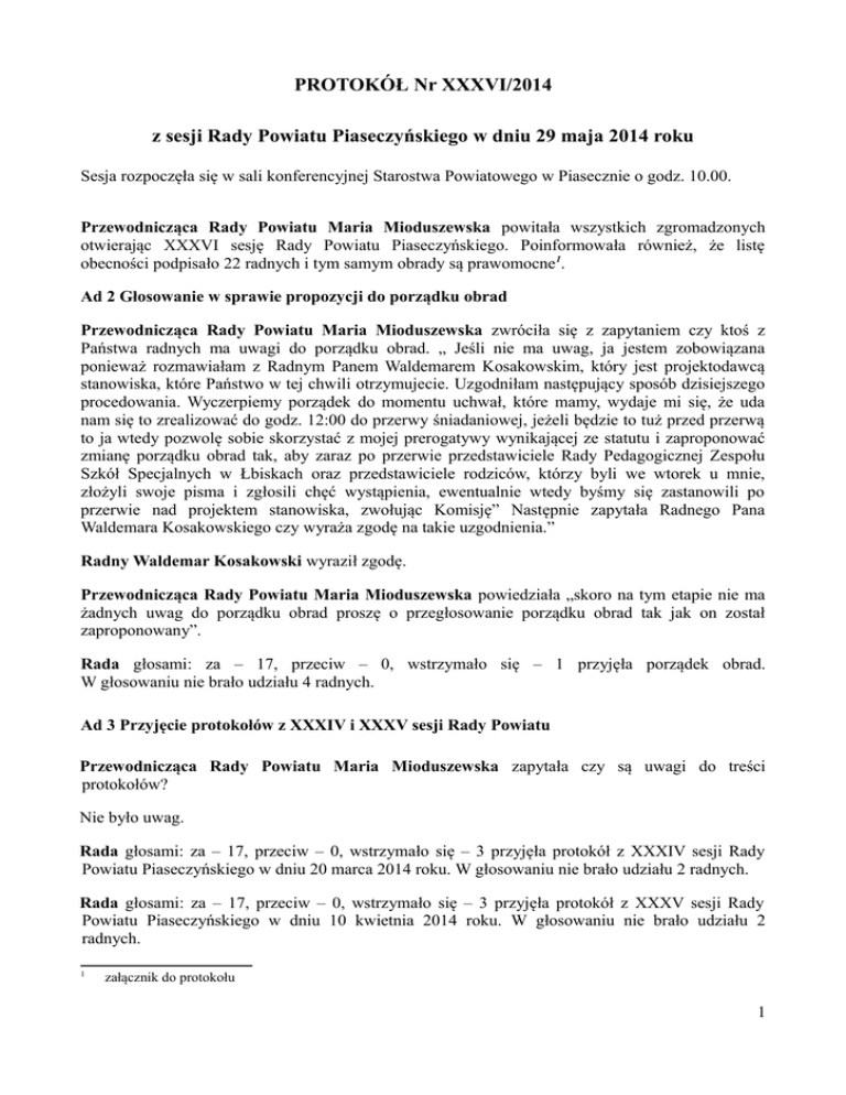 PROTOKÓŁ Nr XXXVI/2014 z sesji Rady Powiatu Piaseczyńskiego w dniu 29 maja 2014 roku Sesja rozpoczęła się w sali konferencyjnej Starostwa Powiatowego w Piasecznie o godz. 10.00. Przewodnicząca Rady Powiatu Maria Mioduszewska powitała wszystkich zgromadzonych otwierając XXXVI sesję Rady Powiatu Piaseczyńskiego. Poinformowała również, że listę obecności podpisało 22 radnych i tym samym obrady są prawomocne1. Ad 2 Głosowanie w sprawie propozycji do porządku obrad Przewodnicząca Rady Powiatu Maria Mioduszewska zwróciła się z zapytaniem czy ktoś z Państwa radnych ma uwagi do porządku obrad. „ Jeśli nie ma uwag, ja jestem zobowiązana ponieważ rozmawiałam z Radnym Panem Waldemarem Kosakowskim, który jest projektodawcą stanowiska, które Państwo w tej chwili otrzymujecie. Uzgodniłam następujący sposób dzisiejszego procedowania. Wyczerpiemy porządek do momentu uchwał, które mamy, wydaje mi się, że uda nam się to zrealizować do godz. 12:00 do przerwy śniadaniowej, jeżeli będzie to tuż przed przerwą to ja wtedy pozwolę sobie skorzystać z mojej prerogatywy wynikającej ze statutu i zaproponować zmianę porządku obrad tak, aby zaraz po przerwie przedstawiciele Rady Pedagogicznej Zespołu Szkół Specjalnych w Łbiskach oraz przedstawiciele rodziców, którzy byli we wtorek u mnie, złożyli swoje pisma i zgłosili chęć wystąpienia, ewentualnie wtedy byśmy się zastanowili po przerwie nad projektem stanowiska, zwołując Komisję” Następnie zapytała Radnego Pana Waldemara Kosakowskiego czy wyraża zgodę na takie uzgodnienia.” Radny Waldemar Kosakowski wyraził zgodę. Przewodnicząca Rady Powiatu Maria Mioduszewska powiedziała „skoro na tym etapie nie ma żadnych uwag do porządku obrad proszę o przegłosowanie porządku obrad tak jak on został zaproponowany”. Rada głosami: za – 17, przeciw – 0, wstrzymało się – 1 przyjęła porządek obrad. W głosowaniu nie brało udziału 4 radnych. Ad 3 Przyjęcie protokołów z XXXIV i XXXV sesji Rady Powiatu Przewodnicząca Rady Powiatu Maria Mioduszewska zapytała czy są uwagi do treści protokołów? Nie było uwag. Rada głosami: za – 17, przeciw – 0, wstrzymało się – 3 przyjęła protokół z XXXIV sesji Rady Powiatu Piaseczyńskiego w dniu 20 marca 2014 roku. W głosowaniu nie brało udziału 2 radnych. Rada głosami: za – 17, przeciw – 0, wstrzymało się – 3 przyjęła protokół z XXXV sesji Rady Powiatu Piaseczyńskiego w dniu 10 kwietnia 2014 roku. W głosowaniu nie brało udziału 2 radnych. 1 załącznik do protokołu 1 Ad 4 Rozpatrzenie projektu uchwały w sprawie zmian w uchwale w sprawie Wieloletniej Prognozy Finansowej Powiatu Piaseczyńskiego Naczelnik Wydziału Finansowego Grzegorz Koczyk przedstawił projekt uchwały w sprawie zmian w uchwale w sprawie Wieloletniej Prognozy Finansowej Powiatu Piaseczyńskiego.2 Przewodnicząca Komisji Budżetu i Finansów Radna Marianna Kurek poinformowała, że Komisja Budżetu i Finansów jednogłośnie zaopiniowała projekt uchwały w sprawie zmian w uchwale w sprawie Wieloletniej Prognozy Finansowej Powiatu Piaseczyńskiego. Rada w głosowaniu imiennym: za – 18, przeciw – 0, wstrzymało się – 0, przyjęła uchwałę w sprawie zmian w uchwale w sprawie Wieloletniej Prognozy Finansowej Powiatu Piaseczyńskiego3.W głosowaniu nie brało udziału 4 radnych. Ad 5 Rozpatrzenie projektu uchwały w sprawie zmian w uchwale budżetowej na rok 2014 Naczelnik Wydziału Finansowego Grzegorz Koczyk przedstawił projekt uchwały w sprawie zmian w uchwale budżetowej na rok 2014 4 Przewodnicząca Komisji Budżetu i Finansów Radna Marianna Kurek poinformowała, że Komisja Budżetu i Finansów przy jednym głosie wstrzymującym pozytywnie zaopiniowała projekt uchwały w sprawie zmian w uchwale budżetowej na rok 2014. Wicestarosta Marek Gieleciński wyjaśnił „tam gdzie mamy zmiany w pkt 9 zapis zwiększa się o 272 400 zł planowane w dziale 852 itd jest błąd literowy powinna być kwota 372 400 zł. Informowałem o tym na Komisji Budżetu, ale inni Państwo mogliby nie wiedzieć przepraszamy za tą pomyłkę. Pomyłka nastąpiła przy konstruowaniu tekstu w naszych służbach finansowych ale ona dotyczy błędu w cyfrze nie w innej postaci i nie ma ona wpływu żadnego na zmiany w dochodach i wydatkach”. Przewodnicząca Rady Powiatu Maria Mioduszewska „ja osobiście cieszę się, że dzisiaj mamy szansę przegłosować tutaj pewne wnioski, które od jakiegoś czasu na naszych komisjach były omawiane i składane przez naszych przyjaciół, przez naszych szefów jednostek między innymi wykonanie placu z siłownią do ćwiczeń Zespołu Szkół Nr 1 w Piasecznie na ul. Szpitalnej, Pani Dyrektor była u nas, mam nadzieję, że te pieniądze rzeczywiście pomogą uporządkować teren i chociaż czasowo w pewnym sensie taki erzatz nowego boiska bo na to dzisiaj nas nie stać tam powstanie. Bardzo się cieszę i mam nadzieję, że przegłosujemy również zadanie inwestycyjne wykonanie szkolnego placu zabaw dla Łbisk i oczywiście budowa drogi to jest zobowiązanie z ubiegłego roku na terenie Gminy Konstancin-Jeziorna niezwykle ważne dla dalszej współpracy. Bardzo dziękuję za most przez rzekę Tarczynkę; także niezwykle ważny. Ostatnio jak z kolegami rozmawialiśmy to tak naprawdę najwięcej wykonujemy mostów ale pamiętam I kadencję kiedy otrzymaliśmy wykaz mostów w tragicznym stanie nie robionych przez dziesięciolecia, nie konserwowanych w naszej poprzedniej rzeczywistości, dziś mamy taką szansę i wprowadzamy te mosty, ponieważ w połowie są one dofinansowane więc nie sposób nie skorzystać z tych środków, które będą darowane. Zachęcam Państwa do udziału w głosowaniu”. 2 3 4 załącznik do protokołu załącznik do protokołu załącznik do protokołu 2 Rada w głosowaniu imiennym głosami: za – 19, przeciw – 0, wstrzymało się – 1, przyjęła uchwałę w sprawie zmian