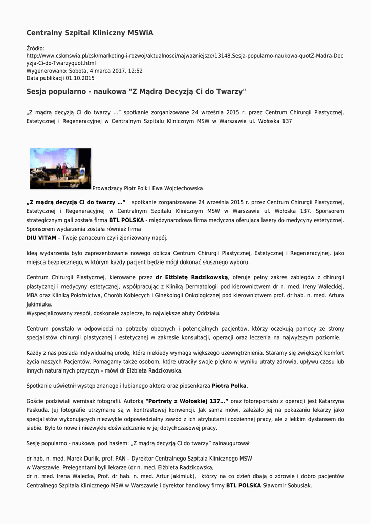 Centralny Szpital Kliniczny MSWiA Źródło: http://www.cskmswia.pl/csk/marketing-i-rozwoj/aktualnosci/najwazniejsze/13148,Sesja-popularno-naukowa-quotZ-Madra-Dec yzja-Ci-do-Twarzyquot.html Wygenerowano: Sobota, 4 marca 2017, 12:52 Data publikacji 01.10.2015 Sesja popularno - naukowa "Z Mądrą Decyzją Ci do Twarzy" „Z mądrą decyzją Ci do twarzy …” spotkanie zorganizowane 24 września 2015 r. przez Centrum Chirurgii Plastycznej, Estetycznej i Regeneracyjnej w Centralnym Szpitalu Klinicznym MSW w Warszawie ul. Wołoska 137 Prowadzący Piotr Polk i Ewa Wojciechowska „Z mądrą decyzją Ci do twarzy …” spotkanie zorganizowane 24 września 2015 r. przez Centrum Chirurgii Plastycznej, Estetycznej i Regeneracyjnej w Centralnym Szpitalu Klinicznym MSW w Warszawie ul. Wołoska 137. Sponsorem strategicznym gali została firma BTL POLSKA - międzynarodowa firma medyczna oferująca lasery do medycyny estetycznej. Sponsorem wydarzenia została również firma DIU VITAM – Twoje panaceum czyli zjonizowany napój. Ideą wydarzenia było zaprezentowanie nowego oblicza Centrum Chirurgii Plastycznej, Estetycznej i Regeneracyjnej, jako miejsca bezpiecznego, w którym każdy pacjent będzie mógł dokonać słusznego wyboru. Centrum Chirurgii Plastycznej, kierowane przez dr Elżbietę Radzikowską, oferuje pełny zakres zabiegów z chirurgii plastycznej i medycyny estetycznej, współpracując z Kliniką Dermatologii pod kierownictwem dr n. med. Ireny Waleckiej, MBA oraz Kliniką Położnictwa, Chorób Kobiecych i Ginekologii Onkologicznej pod kierownictwem prof. dr hab. n. med. Artura Jakimiuka. Wyspecjalizowany zespół, doskonałe zaplecze, to największe atuty Oddziału. Centrum powstało w odpowiedzi na potrzeby obecnych i potencjalnych pacjentów, którzy oczekują pomocy ze strony specjalistów chirurgii plastycznej i estetycznej w zakresie konsultacji, operacji oraz leczenia na najwyższym poziomie. Każdy z nas posiada indywidualną urodę, która niekiedy wymaga większego uzewnętrznienia. Staramy się zwiększyć komfort życia naszych Pacjentów. Pomagamy także osobom, które utraciły swoje piękno w wyniku utraty zdrowia, upływu czasu lub innych naturalnych przyczyn – mówi dr Elżbieta Radzikowska. Spotkanie uświetnił występ znanego i lubianego aktora oraz piosenkarza Piotra Polka. Goście podziwiali wernisaż fotografii. Autorką "Portrety z Wołoskiej 137…” oraz fotoreportażu z operacji jest Katarzyna Paskuda. Jej fotografie utrzymane są w kontrastowej konwencji. Jak sama mówi, zależało jej na pokazaniu lekarzy jako specjalistów wykonujących niezwykle odpowiedzialny zawód z ich atrybutami codziennej pracy, ale z lekkim dystansem do siebie. Było to nowe i niezwykłe doświadczenie w jej dotychczasowej pracy. Sesję popularno - naukową pod hasłem: „Z mądrą decyzją Ci do twarzy” zainaugurował dr hab. n. med. Marek Durlik, prof. PAN – Dyrektor Centralnego Szpitala Klinicznego MSW w Warszawie. Prelegentami byli lekarze (dr n. med. Elżbieta Radzikowska, dr n. med. Irena Walecka, Prof. dr hab. n. med. Artur Jakimiuk), którzy na co dzień dbają o zdrowie i dobro pacjentów Centralnego Szpitala Klinicznego MSW w Warszawie i dyrektor handlowy firmy BTL POLSKA Sławomir Sobusiak. dr Elżbieta Radzikowska, dr n. med. Irena Walecka, dr hab. n. med. Marek Durlik, prof.PAN Prowadzący Piotr Polk i Ewa Wojciechowska Sesja popularno-naukowa "Z mądrą decyzją Ci do twarzy" W trakcie sesji Autorka portretów "Portrety z Wołoskiej 137..." Prelegent prof. dr hab. n. med. Artur Jakimiuk z aktorką Panią Ewą Wencel dr n. med. Irena Walecka Goście sesji "Z mądrą decyzją Ci do twarzy" Zaproszeni goście Drukuj Generuj PDF Powiadom znajomego Wstecz