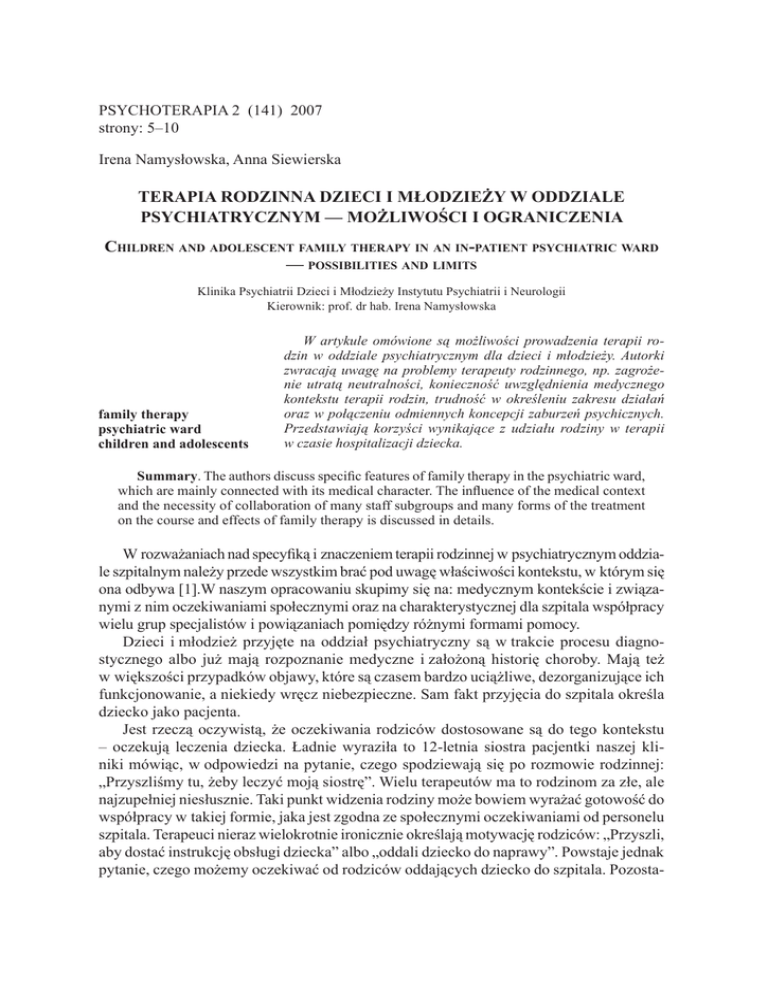 Psychoterapia 2 (141) 2007 strony: 5–10 Irena Namysłowska, Anna Siewierska Terapia rodzinna dzieci i młodzieży w oddziale psychiatrycznym — możliwości i ograniczenia Children and adolescent family therapy in an in-patient psychiatric ward — possibilities and limits Klinika Psychiatrii Dzieci i Młodzieży Instytutu Psychiatrii i Neurologii Kierownik: prof. dr hab. Irena Namysłowska family therapy psychiatric ward children and adolescents W artykule omówione są możliwości prowadzenia terapii rodzin w oddziale psychiatrycznym dla dzieci i młodzieży. Autorki zwracają uwagę na problemy terapeuty rodzinnego, np. zagrożenie utratą neutralności, konieczność uwzględnienia medycznego kontekstu terapii rodzin, trudność w określeniu zakresu działań oraz w połączeniu odmiennych koncepcji zaburzeń psychicznych. Przedstawiają korzyści wynikające z udziału rodziny w terapii w czasie hospitalizacji dziecka. Summary. The authors discuss specific features of family therapy in the psychiatric ward, which are mainly connected with its medical character. The influence of the medical context and the necessity of collaboration of many staff subgroups and many forms of the treatment on the course and effects of family therapy is discussed in details. W rozważaniach nad specyfiką i znaczeniem terapii rodzinnej w psychiatrycznym oddziale szpitalnym należy przede wszystkim brać pod uwagę właściwości kontekstu, w którym się ona odbywa [1].W naszym opracowaniu skupimy się na: medycznym kontekście i związanymi z nim oczekiwaniami społecznymi oraz na charakterystycznej dla szpitala współpracy wielu grup specjalistów i powiązaniach pomiędzy różnymi formami pomocy. Dzieci i młodzież przyjęte na oddział psychiatryczny są w trakcie procesu diagnostycznego albo już mają rozpoznanie medyczne i założoną historię choroby. Mają też w większości przypadków objawy, które są czasem bardzo uciążliwe, dezorganizujące ich funkcjonowanie, a niekiedy wręcz niebezpieczne. Sam fakt przyjęcia do szpitala określa dziecko jako pacjenta. Jest rzeczą oczywistą, że oczekiwania rodziców dostosowane są do tego kontekstu – oczekują leczenia dziecka. Ładnie wyraziła to 12-letnia siostra pacjentki naszej kliniki mówiąc, w odpowiedzi na pytanie, czego spodziewają się po rozmowie rodzinnej: „Przyszliśmy tu, żeby leczyć moją siostrę”. Wielu terapeutów ma to rodzinom za złe, ale najzupełniej niesłusznie. Taki punkt widzenia rodziny może bowiem wyrażać gotowość do współpracy w takiej formie, jaka jest zgodna ze społecznymi oczekiwaniami od personelu szpitala. Terapeuci nieraz wielokrotnie ironicznie określają motywację rodziców: „Przyszli, aby dostać instrukcję obsługi dziecka” albo „oddali dziecko do naprawy”. Powstaje jednak pytanie, czego możemy oczekiwać od rodziców oddających dziecko do szpitala. Pozosta- 6 Irena Namysłowska, Anna Siewierska wienie odpowiedzialności za leczenie personelowi szpitala jest zgodne z oczekiwaniami społecznymi i wcale nie musi świadczyć o niechęci rodziny do współpracy. Czasem jest wyrazem bezradności i lęku [2], a także niepewności w roli rodzicielskiej. Każdy terapeuta rodzinny marzy o tym, aby rodziny zwracały się do niego o pomoc w poprawieniu relacji rodzinnych albo rozwiązaniu konfliktów. Taka motywacja w kontekście hospitalizacji psychiatrycznej zdarza się jednak niezwykle rzadko. To, czy chęć pomocy w leczeniu dziecka przybierze formę gotowości do terapii rodziny, zależy od znaczenia, jakie rodzina i terapeuta nadadzą swojej współpracy. Współczesne kierunki terapii rodzin wyrastające z idei konstrukcjonizmu społecznego [3, 4, 5] są bardzo wrażliwe na poczucie bezpieczeństwa i integralność rodziny oraz szanują zakreślone przez rozmówców granice, chroniąc tym samym rodzinę i terapeutę przed konfliktem oczekiwań i pochopnym orzeczeniem o braku motywacji do terapii [6]. To, nieco inne niż wcześniejsze, tradycyjne rozumienie terapii rodzin doprowadziło do zmniejszenia konfliktu pomiędzy kontekstem medycznym a terapią, co nie oznacza, że konflikt taki nie istnieje. Jeśli np. lekarz i/ lub rodzina mają jednoznacznie biologiczną koncepcję choroby i leczenia pacjenta, trudno jest znaleźć miejsce dla systemowej terapii rodzinnej. W takich przypadkach można proponować rodzinie psychoedukację lub poprzestać na rozmowie zmniejszającej lęk o pacjenta. Pojawia się tu pytanie, czy wobec wyżej przytoczonych ograniczeń, rozpoczynanie rozmów rodzinnych podczas hospitalizacji ma sens? Wydaje się nam, że tak. Po pierwsze, rozmowa z rodziną może pomóc zmniejszyć jej stres, związany z hospitalizacją psychiatryczną, lęk, poczucie winy i wstyd. Po drugie, przy bardzo dużym nasileniu konfliktów rodzinnych, umożliwia w ogóle rozmowę wszystkich członków rodziny. Po trzecie, pomaga wytworzyć gotowość do terapii u rodzin, które nigdy nie dotarłyby do ambulatorium. I wreszcie, rozmowa rodzinna podkreśla znaczenie rodziny w leczeniu pacjenta i odpowiedzialność za dziecko — nawet w czasie pobytu w szpitalu. Pozwala także obniżyć lęk rodziny i pacjenta przed powrotem do domu, tworząc w ten sposób pomost między oddziałem a domem. W szpitalu terapia rodzin jest elementem całego systemu oddziaływań, co zakłada konieczność współpracy całego zespołu terapeutycznego i uwzględnienia powiązań pomiędzy różnymi formami terapii. Przyjęty na oddział pacjent i jego rodzina wraz z personelem szpitala tworzą nowy system. Relacje pomiędzy jego elementami mogą zmieniać pozycję i możliwości pacjenta, ale mogą także utrwalać konflikt lojalności. Nowy system może stać się leczący i poszukujący nowych rozwiązań, ale także tworzyć nowe problemy, może stać się systemem „generującym problem” [4, 7]. 1. Podstawowy system powstający przy przyjęciu dziecka do szpitala: PACJENT RODZINA oddzia