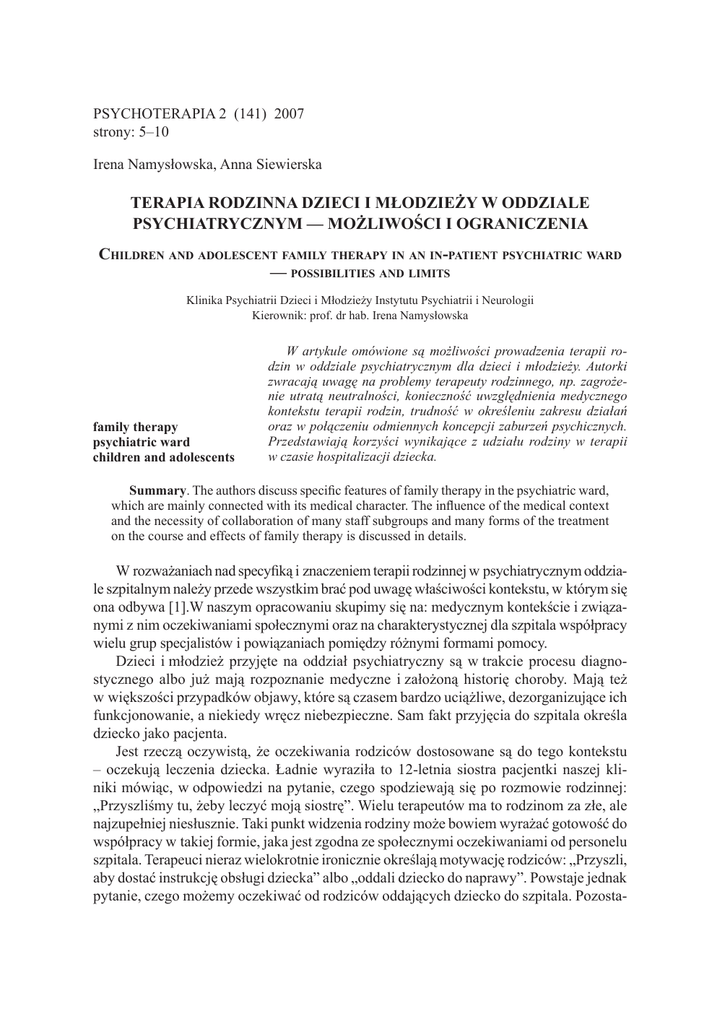 terapia rodzinna dzieci i młodzieży w oddziale psychiatrycznym