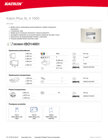 Katrin Plus XL 4 1000 481009 l l l l l l Bardzo mocny, przemysłowy ręcznik papierowy z włókien mieszanych, laminowany 4-warstwowy, biały Nadaje się do wycierania nierównych i ostrych powierzchni Szczególnie odpowiedni do wycierania lepkich substancji, jak oleje i smary Dopuszczony do bezpośredniego kontaktu z żywnością Posiada certyfikat Nordic Swan Eco Label Opakowanie jednostkowe x 360 mm y 265 mm Biały 6.61 kg 4 17 g/m2 Ø 360 mm 1 z 360 mm x 360 mm y 265 mm y 265 mm 1000 x 360 m Ø 71 mm 4004231481009 Opakowanie transportowe x 360 mm y 265 mm 1 6.61 kg 1 4004231481009 z 360 mm Paleta transportowa x 800 mm 48 y 2270 mm 343 kg 4004231704276 z 1200 mm Powiązane produkty 709141 Katrin Blue Line floor 27.10.2015 02:42 709158 Katrin Blue Line wall www.katrin.com 999805 Katrin Blue Line with bin Copyright © Metsä Tissue Corporation Katrin. At Hand.