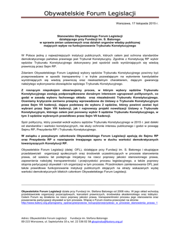 Obywatelskie Forum Legislacji Warszawa, 17 listopada 2015 r. Stanowisko Obywatelskiego Forum Legislacji działającego przy Fundacji im. S. Batorego w sprawie zmian ustawowych oraz działań organów władzy publicznej mających wpływ na funkcjonowanie Trybunału Konstytucyjnego W Polsce jedną z najważniejszych instytucji publicznych, których celem jest ochrona standardów demokratycznego państwa prawnego jest Trybunał Konstytucyjny. Zgodnie z Konstytucją RP wybór sędziów Trybunału Konstytucyjnego dokonywany jest spośród osób wyróżniających się wiedzą prawniczą przez Sejm RP. Zdaniem Obywatelskiego Forum Legislacji wybory sędziów Trybunału Konstytucyjnego powinny być przeprowadzane w sposób transparentny i w trybie pozwalającym na wyłonienie kandydatów wyróżniających się wiedzą prawniczą oraz nieskazitelnym charakterem, dającym gwarancję należytego wykonywania obowiązków sędziego Trybunału Konstytucyjnego. Z rosnącym niepokojem obserwujemy proces, w którym wybory sędziów Trybunału Konstytucyjnego zostają podporządkowane doraźnym interesom ugrupowań politycznych, co godzi w zasadę wyboru fachowego składu oraz niezależność Trybunału Konstytucyjnego. Oceniamy krytycznie zarówno przepisy wprowadzone do Ustawy o Trybunale Konstytucyjnym przez Sejm VII kadencji, dające podstawę do wyboru 2 sędziów, którzy powinni zostać być wybrani przez Sejm VIII kadencji, jak i najnowszy projekt nowelizacji Ustawy o Trybunale Konstytucyjnym, którego celem jest ponowny wybór 5 sędziów Trybunału Konstytucyjnego, w tym 3 sędziów wybranych prawidłowo przez Sejm VII kadencji. Spór polityczny, który powstał wokół wyboru sędziów Trybunału Konstytucyjnego w 2015 r. jest daleki od standardów i wartości konstytucyjnych, nie służy ochronie interesu publicznego i godzi w powagę Sejmu RP, Prezydenta RP i Trybunału Konstytucyjnego. W związku z powyższym członkowie Obywatelskiego Forum Legislacji apelują do Sejmu RP oraz Prezydenta RP o rozwiązanie trwającego sporu w duchu wartości demokratycznych towarzyszących Konstytucji RP. Obywatelskie Forum Legislacji (dalej: OFL), działające przy Fundacji im. S. Batorego i skupiające przedstawicieli organizacji społecznych oraz środowisk uczestniczących w procesie stanowienia prawa, od sześciu lat podejmuje inicjatywy na rzecz poprawy jakości stanowionego prawa, zapewnienia należytej transparentności i przejrzystości procesu legislacyjnego, a także poprawy stopnia partycypacji obywateli i ich organizacji w tym procesie. Przedmiotem zainteresowania OFL jest także prawidłowe funkcjonowanie instytucji publicznych stojących na straży wskazanych wyżej wartości demokratycznych bliskich członkom Obywatelskiego Forum Legislacji. ----------------------------------------------------------------------------------------------------------------------------------Obywatelskie Forum Legislacji działa przy Fundacji im. Stefana Batorego od 2008 roku. W jego skład wchodzą przedstawiciele organizacji pozarządowych, kancelarii prawniczych, środowiska akademickiego oraz lobbyści. Celem Forum są działania na rzecz poprawy jakości prawa, transparentności procesu jego stanowienia oraz poszerzenia partycypacji obywateli w tym procesie. Więcej o Forum można przeczytać na stronie: http://www.batory.org.pl/programy_operacyjne/przeciw_korupcji/przejrzystosc_w_procesie_stanowienia_prawa_1 Adres: Obywatelskie Forum Legislacji Fundacja im. Stefana Batorego 00-215 Warszawa, ul. Sapieżyńska 10 a, tel. 22 536 02 58 [email protected]