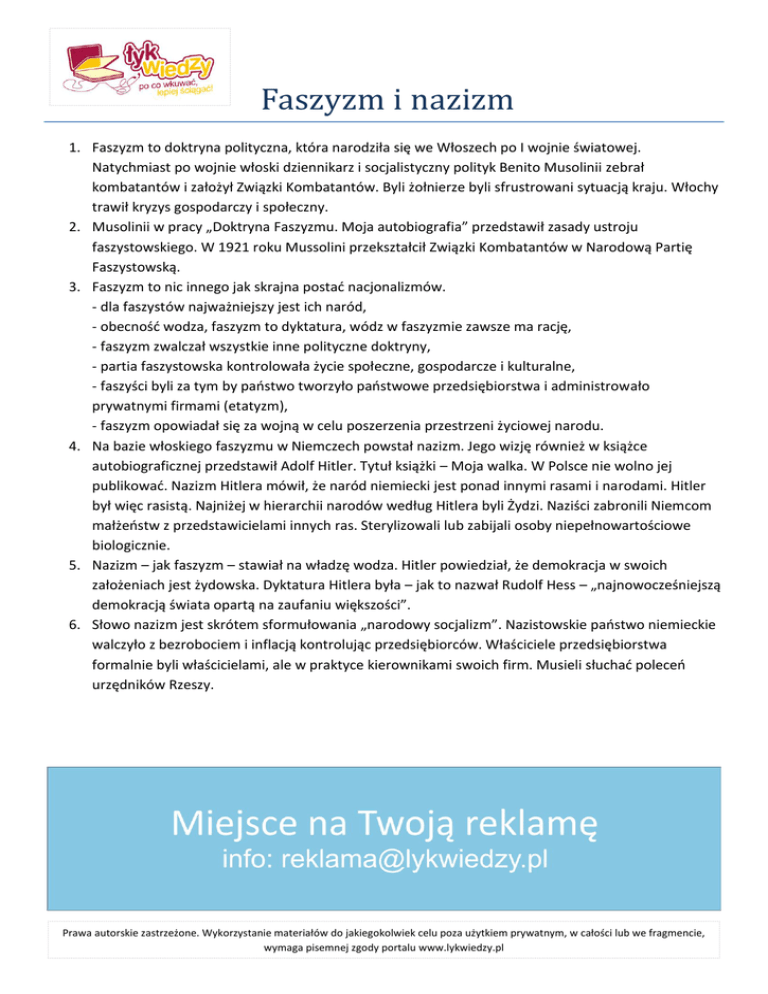 Faszyzm i nazizm 1. Faszyzm to doktryna polityczna, która narodziła się we Włoszech po I wojnie światowej. Natychmiast po wojnie włoski dziennikarz i socjalistyczny polityk Benito Musolinii zebrał kombatantów i założył Związki Kombatantów. Byli żołnierze byli sfrustrowani sytuacją kraju. Włochy trawił kryzys gospodarczy i społeczny. 2. Musolinii w pracy „Doktryna Faszyzmu. Moja autobiografia” przedstawił zasady ustroju faszystowskiego. W 1921 roku Mussolini przekształcił Związki Kombatantów w Narodową Partię Faszystowską. 3. Faszyzm to nic innego jak skrajna postad nacjonalizmów. - dla faszystów najważniejszy jest ich naród, - obecnośd wodza, faszyzm to dyktatura, wódz w faszyzmie zawsze ma rację, - faszyzm zwalczał wszystkie inne polityczne doktryny, - partia faszystowska kontrolowała życie społeczne, gospodarcze i kulturalne, - faszyści byli za tym by paostwo tworzyło paostwowe przedsiębiorstwa i administrowało prywatnymi firmami (etatyzm), - faszyzm opowiadał się za wojną w celu poszerzenia przestrzeni życiowej narodu. 4. Na bazie włoskiego faszyzmu w Niemczech powstał nazizm. Jego wizję również w książce autobiograficznej przedstawił Adolf Hitler. Tytuł książki – Moja walka. W Polsce nie wolno jej publikowad. Nazizm Hitlera mówił, że naród niemiecki jest ponad innymi rasami i narodami. Hitler był więc rasistą. Najniżej w hierarchii narodów według Hitlera byli Żydzi. Naziści zabronili Niemcom małżeostw z przedstawicielami innych ras. Sterylizowali lub zabijali osoby niepełnowartościowe biologicznie. 5. Nazizm – jak faszyzm – stawiał na władzę wodza. Hitler powiedział, że demokracja w swoich założeniach jest żydowska. Dyktatura Hitlera była – jak to nazwał Rudolf Hess – „najnowocześniejszą demokracją świata opartą na zaufaniu większości”. 6. Słowo nazizm jest skrótem sformułowania „narodowy socjalizm”. Nazistowskie paostwo niemieckie walczyło z bezrobociem i inflacją kontrolując przedsiębiorców. Właściciele przedsiębiorstwa formalnie byli właścicielami, ale w praktyce kierownikami swoich firm. Musieli słuchad poleceo urzędników Rzeszy. Prawa autorskie zastrzeżone. Wykorzystanie materiałów do jakiegokolwiek celu poza użytkiem prywatnym, w całości lub we fragmencie, wymaga pisemnej zgody portalu www.lykwiedzy.pl 7. Polska konstytucja w artykule 13 zabrania istnienia na terenie naszego kraju partii faszystowskich, nazistowskich i komunistycznych. Kodeks karny natomiast mówi, że kto propaguje którąś z ideologii totalitarnych może trafid do więzienia nawet na 2 lata. Prawa autorskie zastrzeżone. Wykorzystanie materiałów do jakiegokolwiek celu poza użytkiem prywatnym, w całości lub we fragmencie, wymaga pisemnej zgody portalu www.lykwiedzy.pl