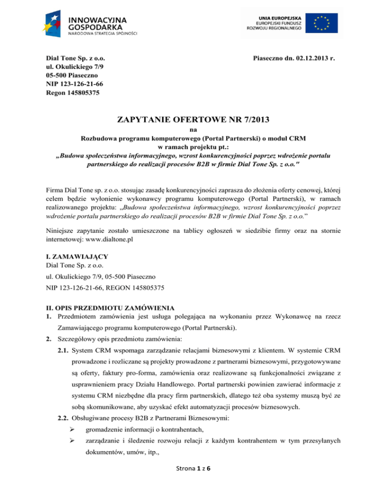 Dial Tone Sp. z o.o. ul. Okulickiego 7/9 05-500 Piaseczno NIP 123-126-21-66 Regon 145805375 Piaseczno dn. 02.12.2013 r. ZAPYTANIE OFERTOWE NR 7/2013 na Rozbudowa programu komputerowego (Portal Partnerski) o moduł CRM w ramach projektu pt.: „Budowa społeczeństwa informacyjnego, wzrost konkurencyjności poprzez wdrożenie portalu partnerskiego do realizacji procesów B2B w firmie Dial Tone Sp. z o.o." Firma Dial Tone sp. z o.o. stosując zasadę konkurencyjności zaprasza do złożenia oferty cenowej, której celem będzie wyłonienie wykonawcy programu komputerowego (Portal Partnerski), w ramach realizowanego projektu: „Budowa społeczeństwa informacyjnego, wzrost konkurencyjności poprzez wdrożenie portalu partnerskiego do realizacji procesów B2B w firmie Dial Tone Sp. z o.o.” Niniejsze zapytanie zostało umieszczone na tablicy ogłoszeń w siedzibie firmy oraz na stornie internetowej: www.dialtone.pl I. ZAMAWIAJĄCY Dial Tone Sp. z o.o. ul. Okulickiego 7/9, 05-500 Piaseczno NIP 123-126-21-66, REGON 145805375 II. OPIS PRZEDMIOTU ZAMÓWIENIA 1. Przedmiotem zamówienia jest usługa polegająca na wykonaniu przez Wykonawcę na rzecz Zamawiającego programu komputerowego (Portal Partnerski). 2. Szczegółowy opis przedmiotu zamówienia: 2.1. System CRM wspomaga zarządzanie relacjami biznesowymi z klientem. W systemie CRM prowadzone i rozliczane są projekty prowadzone z partnerami biznesowymi, przygotowywane są oferty, faktury pro-forma, zamówienia oraz realizowane są funkcjonalności związane z usprawnieniem pracy Działu Handlowego. Portal partnerski powinien zawierać informacje z systemu CRM niezbędne dla pracy firm partnerskich, dlatego też oba systemy muszą być ze sobą skomunikowane, aby uzyskać efekt automatyzacji procesów biznesowych. 2.2. Obsługiwane procesy B2B z Partnerami Biznesowymi: gromadzenie informacji o kontrahentach, zarządzanie i śledzenie rozwoju relacji z każdym kontrahentem w tym przesyłanych dokumentów, umów, itp., Strona 1 z 6 zarządzanie i śledzenie postępów procesu sprzedaży dla konkretnego kontrahenta wraz z ustaleniem etapów sprzedaży, prawdopodobieństwa zawarcia umowy, przeglądanie historii dotychczasowych prób sprzedaży wraz z analizą jakie czynniki przyczyniły się do końcowego sukcesu lub porażki procesu sprzedaży, klasyfikację i segmentację kontrahentów, planowanie akcji marketingowych wraz ze śledzeniem ich realizacji, zbudowanie katalogu usług i dostosowanie go do każdego kontrahenta wraz z indywidualnym cennikiem wypracowanym na bazie dotychczasowej współpracy, zarządzanie i śledzenie postępów realizacji każdego projektu z kontrahentem, zarządzanie wystawianiem faktur, korekt oraz prowizji po zakończeniu realizacji projektu. W tym celu system musi bezpośrednio zintegrować się z systemem dedykowanym do obsługi rozliczeń finansowych. 3. Jednocześnie szczegółowy opis dotychczas wykonanego Portalu Partnerskiego oraz modułów w nim zawartych zawarty jest w poniżej przedstawionych opracowaniach przygotowanych w celu prawidłowej realizacji Projektu: 3.1. Załącznik nr 2 - Szczegółowy opis systemu B2B - zawierający szczegółowy opis struktury, zawartości, przeznaczenia i funkcjonowania Portalu Partnerskiego oraz inne cechy Portalu Partnerskiego, istotne z punktu widzenia Zamawiającego (język programowania, programy będące podstawą wykonania Portalu Partnerskiego np. programy bazodanowe, środowisko informatyczne w którym Portal Partnerski ma docelowo funkcjonować, zakładane możliwości dalszej rozbudowy Portalu Partnerskiego i jego rozwoju); 3.2. Załącznik nr 3 – Analiza ergonomicznych interfejsów użytkownika; 3.3. Załącznik nr 4 – Najlepsze praktyki i strategie dotyczące integracji systemów B2B; 3.4. Załącznik nr 5 – Analiza Prawna – prawne aspekty funkcjonowania firmy świadczącej usługi windykacyjne i możliwości usprawnienia funkcjonowania firmy na rynku w obliczu obowiązujących przepisów prawa w związku z realizacją projektu B2B; 3.5. Załącznik nr 6 – Analiza wdrożenia systemu B2B – Świadczenie usług doradczych przy wdrożeniu systemu B2B w firmie Dial Tone sp. z o.o.. 4. Powyższe załączniki stanowią integralną część zapytania i są udostępniane w siedzibie zamawiającego na wniosek składającego ofertę i stanowią tajemnicę przedsiębiorstwa. 5. Zamawiający nie dopuszcza możliwości składania ofert częściowych. 6. Zamawiający nie dopuszcza możliwości powierzenia części lub całości podwykonawcy/om. III. TERMIN SKŁADANIA OFERT I WYKONANIA ZAMÓWIENIA Strona 2 z 6 zamówienia 1. Termin składania ofert upływa dnia 20.12.2013 roku o godzinie 16.00. 2. Termin wykonania zamówienia do 31.01.2014 roku. IV. OPIS SPOSOBU PRZYGOTOWANIA OFERTY 1. Oferent powinien złożyć ofertę na formularzu załączonym do niniejszego zapytania (zał. nr 1 – wzór formularza ofertowego). 2. Oferta powinna być: 2.1. Opatrzona pieczątką firmową. 2.2. Zawierać datę sporządzenia oferty. 2.3. Zawierać nazwę firmy, adres, numer telefonu, faksu, numer NIP, REGON, informację o wpisaniu do CEiDG lub nr KRS. 2.4. Podpisana w sposób czytelny przez oferenta. 2.5. Powinna zawierać termin ważności oferty min. 30 dni od dnia złożenia oferty. V. MIEJSCE ORAZ TERMIN SKŁADANIA OFERT 1. Oferta powinna być przesłana przesyłką pocztową, kurierską lub dostarczona osobiście na adres: Dial Tone Sp. z o.o., ul. Okulickiego 7/9, 05-500 Piaseczno do dnia 20.12.2013 roku do godziny 16.00. 2. Oferta składana w postaci tradycyjnej przesyłki pocztowej, przesyłki kurierskiej lub składana osobiście winna zostać złożona w zaklejonej kopercie z dopiskiem "Zapytanie ofertowe nr 7/2013". 3. O kwalifikowalności złożonej oferty w ramach Zapytania ofertowego nr 7/2013 decyduje data wpływu oferty do Zamawiającego. 4. Oferty złożone po terminie nie będą rozpatrywane. 5. Oferent przed upływem terminu składania ofert może swoją ofe