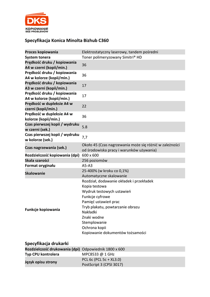 Specyfikacja Konica Minolta Bizhub C360 Proces kopiowania System tonera Prędkość druku / kopiowania A4 w czerni (kopii/min.) Prędkość druku / kopiowania A4 w kolorze (kopii/min.) Prędkość druku / kopiowania A3 w czerni (kopii/min.) Prędkość druku / kopiowania A4 w kolorze (kopii/min.) Prędkość w dupleksie A4 w czerni (kopii/min.) Prędkość w dupleksie A4 w kolorze (kopii/min.) Czas pierwszej kopii / wydruku w czerni (sek.) Czas pierwszej kopii / wydruku w kolorze (sek.) Elektrostatyczny laserowy, tandem pośredni Toner polimeryzowany Simitri® HD 36 36 17 17 22 36 5.8 7,7 Około 45 (Czas nagrzewania może się różnić w zależności od środowiska pracy i warunków używania) Rozdzielczość kopiowania (dpi) 600 x 600 Skala szarości 256 poziomów Format oryginału A5-A3 25-400% (w kroku co 0,1%) Skalowanie Automatyczne skalowanie Rozdział, dodawanie okładek i przekładek Kopia testowa Wydruk testowych ustawień Funkcje cyfrowe Pamięć ustawień prac Tryb plakatu, powtarzanie obrazu Funkcje kopiowania Nakładki Znaki wodne Stemplowanie Ochrona kopii Kopiowanie dokumentów tożsamości Czas nagrzewania (sek.) Specyfikacja drukarki Rozdzielczość drukowania (dpi) Odpowiednik 1800 x 600 Typ CPU kontrolera MPC8533 @ 1 GHz PCL 6c (PCL 5c + XL3.0) Język opisu strony PostScript 3 (CPSI 3017) Systemy operacyjne Czcionki drukarki Funkcje drukowania Windows 2000/XP/XP64 Windows VISTA 32/64 Obsługa Windows DPWS Windows Server 2000/2003/2003x64/2008/2008x64 Macintosh 9.x/10.x Unix/Linux/Citrix 80x PCL Latin; 137x PostScript 3 Emulation Latin Bezpośredni druk plików PCL, PS; TIFF, XPS, PDF oraz zaszyfrowanych plików PDF Mixmedia (drukowanie dokumentu na różnych mediach) Mixplex (drukowanie dokumentu w trybie jednostronnym i dwustronnym Programowanie prac Easy Set Nakładki Znaki wodne Ochrona kopii Specyfikacja skanera Prędkość skanowania w kolorze do 70 (300 dpi przez DF) (skan./min.) Prędkość skanowania w czerni do 70 (300 dpi przez DF) (skan./min.) Rozdzielczość skanowania (dpi) Maks.: 600 x 600 Sieciowy TWAIN Skan do eMail (scan-to-Me) Skan do FTP Skan do SMB (scan-to-Home) Tryby skanowania Skan do Box Skan do WebDAV Skan do DPWS Skan do USB JPEG, TIFF, PDF, kompaktowy PDF, szyfrowany PDF, Formaty plików konturowy PDF, XPS, kompaktowy XPS 2100 (pojedyncze + grupowe) Miejsca docelowe skanowania Obsługa LDAP Adnotacje do plików PDF (tekst/czas/data) Funkcje skanowania Do 400 programów prac Specyfikacja faksu Standard faksu Transmisja faksu Rozdzielczość faksu (dpi) Kompresja faksu Super G3 (opcja) Analogowy, i-Fax, kolorowy i-Fax (RFC3949-C), IP-Fax, SIPFax Maks.: 600 x 600 (ultra-fine) MH, MR, MMR, JBIG Prędkość modemu (kbps) Miejsca docelowe faksowania Funkcje faksowania Do 33,6 2100 (pojedyncze + grupowe) Polling Wysyłanie opóźnione PC-Fax Odbiór do skrzynki poufnej Odbiór do eMail/FTP/SMB Do 400 programów prac Specyfikacja skrzynek użytkownika Maks. ilość przechowywanych Do 3000 dokumentów lub 10000 stron dokumentów Publiczna Rodzaje skrzynek Personalne (z hasłem lub autoryzacją) Grupowe (z autoryzacją) Poufny wydruk Drukowanie szyfrowych plików PDF Rodzaje skrzynek systemowych Odbiór faksu Faks polling Funkcjonalność skrzynek Ponowny wydruk, łączenie, pobieranie, wysyłanie użytkownika (email/FTP/SMB i Faks), kopiowanie do innej skrzynki Specyfikacja systemu Standardowa pamięć systemu 2048 (MB) Standardowy dysk twardy (GB) 250 TCP/IP (IPv4 / IPv6), IPX/SPX, NetBEUI, AppleTalk Protokoły sieciowe (EtherTalk), SMB, LPD, IPP, SNMP, HTTP Rodzaje ramek Ethernet 802.2, Ethernet 802.3, Ethernet II, Ethernet SNAP Do 100 oryginałów Automatyczny podajnik A6-A3 dokumentów 35-210 g/m² A6-A3 full bleed Rozmiar papieru format użytkownika maks. format papieru 1200 x 297 mm Gramatura papieru (g/m²) 64 - 271 Standard: 1150 Pojemność papieru (arkusze) Maks: 3650 Taca 1: 500 arkuszy A5-A3 60-256 g/m² Standardowe podajniki papieru Taca 2: 500 arkuszy A5-A3+ 60-256 g/m² Opcjonalne podajniki papieru Automatyczny dupleks Tryby wykańczania (opcja) Pojemność wyjścia (z finiszerem) Pojemność wyjścia (bez finiszerem) Zszywanie Pojemność zszywania Broszura Pojemność broszury Rekomendowane obciążenie miesięczne kopii/wydruków Maksymalne obciążenie miesięczne kopii/wydruków Wydajność toneru Black Wydajność tonerów CMY Wydajność sekcji obrazowania Black Wydajność sekcji obrazowania CMY Pobór energii Wymiary systemu (Sz.xGł.xWys., mm) Waga systemu (kg) Podajnik ręczny: 150 arkuszy A6 - A3+, format użytkownika, baner 60 - 271 gsm Taca 3: 500 arkuszy A5 - A3 60 - 256 gsm Taca 3 + 4: 2 x 500 arkuszy A5 - A3 60 - 256 gsm Kaseta o dużej pojemności: 2500 arkuszy A4 60 - 256 gsm A5-A3+ 64-256 g/m² Ofset, grupowanie, sortowanie, zszywanie, dziurkowanie, składanie w pół, broszura Maks.: 3200 arkuszy Maks.: 250 arkuszy 50 arkuszy lub 48 arkuszy + 2 arkusze okładek (do 209 g/m²) Maks. 1,000 arkuszy 15 arkuszy lub 14 arkuszy + 1 okładka (do 209 g/m²) 75 arkuszy 40000 stron 60000 stron 29000 26000 120000 90000 Poniżej 1,5 KW 643 x 842 x 770 Około 98 Funkcje systemu Bezpieczeństwo ISO 15408 EAL3 (w certyfikacji) Filtrowanie adresów IP i blokowanie portów Obsługa protokołów komunikacyjnych SSL2, SSL3 i TSL1.0 Obsługa IPsec, IEEE 802.1x Konta użytkowników Aplikacje Autoryzacja użytkownika Zapis autoryzacji Wydruk poufny Nadpisywanie dysku twardego (8 możliwości) Szyfrowanie dysku twardego (AES 256) Automatyczne czyszczenie danych i pamięci Odbiór poufny faksów Szyfrowanie danych drukujących użytkowników System ochrony kopii, hasło Do 1000 kont użytkowników Obsługa Active Directory (login + hasło + e-mail + katalog smb) Definicja funkcji dostępu użytkownika Autoryzacja biometryczna (układ żył palca) - opcja Karty zbliżeniowe IC-Card (czytnik kart IC-Card reader) opcja PageScope Net Care Device Manger PageScope Data Administrator PageScope Box Operator PageScope Direct Print Print Status Noti