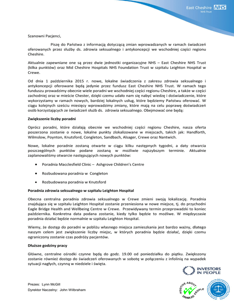 Szanowni Pacjenci, Piszę do Państwa z informacją dotyczącą zmian wprowadzanych w ramach świadczeń oferowanych przez służby ds. zdrowia seksualnego i antykoncepcji we wschodniej części regionu Cheshire. Aktualnie zapewniane one są przez dwie jednostki organizacyjne NHS – East Cheshire NHS Trust (kilka punktów) oraz Mid Cheshire Hospitals NHS Foundation Trust w szpitalu Leighton Hospital w Crewe. Od dnia 1 października 2015 r. nowe, lokalne świadczenia z zakresu zdrowia seksualnego i antykoncepcji oferowane będą jedynie przez fundusz East Cheshire NHS Trust. W ramach tego funduszu prowadzimy obecnie wiele poradni we wschodniej części regionu Cheshire, a także w części zachodniej oraz w mieście Chester, dzięki czemu udało nam się nabyć wiedzę i doświadczenie, które wykorzystamy w ramach nowych, bardziej lokalnych usług, które będziemy Państwu oferować. W ciągu kolejnych sześciu miesięcy wprowadzimy zmiany, które mają na celu poprawę doświadczeń osób korzystających ze świadczeń służb ds. zdrowia seksualnego. Obejmować one będą: Zwiększenie liczby poradni Oprócz poradni, które działają obecnie we wschodniej części regionu Cheshire, nasza oferta poszerzona zostanie o nowe, lokalne punkty zlokalizowane w miejscach, takich jak: Handforth, Wilmslow, Poynton, Knutsford, Congleton, Sandbach, Alsager, Crewe oraz Nantwich. Nowe, lokalne poradnie zostaną otwarte w ciągu kilku następnych tygodni, a daty otwarcia poszczególnych punktów podane zostaną w możliwie najszybszym terminie. Aktualnie zaplanowaliśmy otwarcie następujących nowych punktów: Poradnia Macclesfield Clinic – Ashgrove Children’s Centre Rozbudowana poradnia w Congleton Rozbudowana poradnia w Knutsford Poradnia zdrowia seksualnego w szpitalu Leighton Hospital Obecna centralna poradnia zdrowia seksualnego w Crewe zmieni swoją lokalizację. Poradnia znajdująca się w szpitalu Leighton Hospital zostanie przeniesiona w nowe miejsce, tj. do przychodni Eagle Bridge Health and Wellbeing Centre w Crewe. Przewidywany termin przeprowadzki to koniec października. Konkretna data podana zostanie, kiedy tylko będzie to możliwe. W międzyczasie poradnia działać będzie normalnie w szpitalu Leighton Hospital. Wiemy, że dostęp do poradni w pobliżu własnego miejsca zamieszkania jest bardzo ważny, dlatego naszym celem jest zwiększenie liczby miejsc, w których poradnia będzie działać, dzięki czemu ograniczony zostanie czas podróży pacjentów. Dłuższe godziny pracy Główne, centralne ośrodki czynne będą do godz. 19.00 od poniedziałku do piątku. Zwiększony zostanie również dostęp do świadczeń oferowanych w sobotę w połączeniu z infolinią na wypadek sytuacji nagłych, czynną w niedziele i święta. Prezes: Lynn McGill Dyrektor Naczelny: John Wilbraham Świadczenia dla nosicieli wirusa HIV W przypadku nosicieli wirusa HIV poradnia i leczenie dostępne będą nadal w szpitalu Leighton Hospital. Aby umówić się na wizytę w poradni HIV, dzwonić należy na ten sam numer: 01270 612255. Internetowe umawianie wizyt Wprowadzamy również system internetowego umawiania wizyt, co oznacza że wkrótce można się będzie umówić zarówno telefonicznie jak i przez Internet. Dane kontaktowe zostaną Państwu przekazane w niedługim czasie. Nowa strona internetowa Uruchomiony został nowy serwis internetowy naszych służb (www.gosexualhealth.co.uk). Za jego pomocą odszukać będzie można najbliższą poradnię. Znajdować się tam będą również bezpośrednie numery telefonów, z których korzystać można będzie w czasie, gdy poszczególne miejsca będą już otwarte. Numery telefonów Numery telefonów, za pomocą których skontaktować się można z naszymi służbami, pozostają na razie takie same (patrz poniżej), jednak czynny jest też nowy numer lokalny 0300 323 1300, który znaleźć można w nowym serwisie internetowym. Macclesfield Sexual Health Clinic Umawianie wizyt: 01625 663400/3399 Rezygnowanie z wizyty: 01625 663400/33997 Telefoniczne odbieranie wyników: 01625 661072 Leighton Sexual Health Clinic Wizyty: 01270 612255 Rezygnowanie z wizyty: 01270 612255 Telefoniczne odbieranie wyników: 01270 612255 Dalsze kroki W chwili obecnej we współpracy z funduszem Mid Cheshire NHS Foundation Trust pracujemy nad tym, by transfer usług przebiegł w sposób bezpieczny i bezproblemowy, zarówno jeśli chodzi o pacjentów, jak i personel. O wszelkich postępach w sprawie będziemy Państwa informować. W międzyczasie w celu umówienia się na wizytę proszę korzystać z dotychczasowych numerów kontaktowych dotyczących poniższych usług. Dziękujemy za zapoznanie się Zespół ds. Zdrowia Seksualnego East Cheshire NHS Trust Prezes: Lynn McGill Dyrektor Naczelny: John Wilbraham z niniejszymi informacjami i do zobaczenia wkrótce.