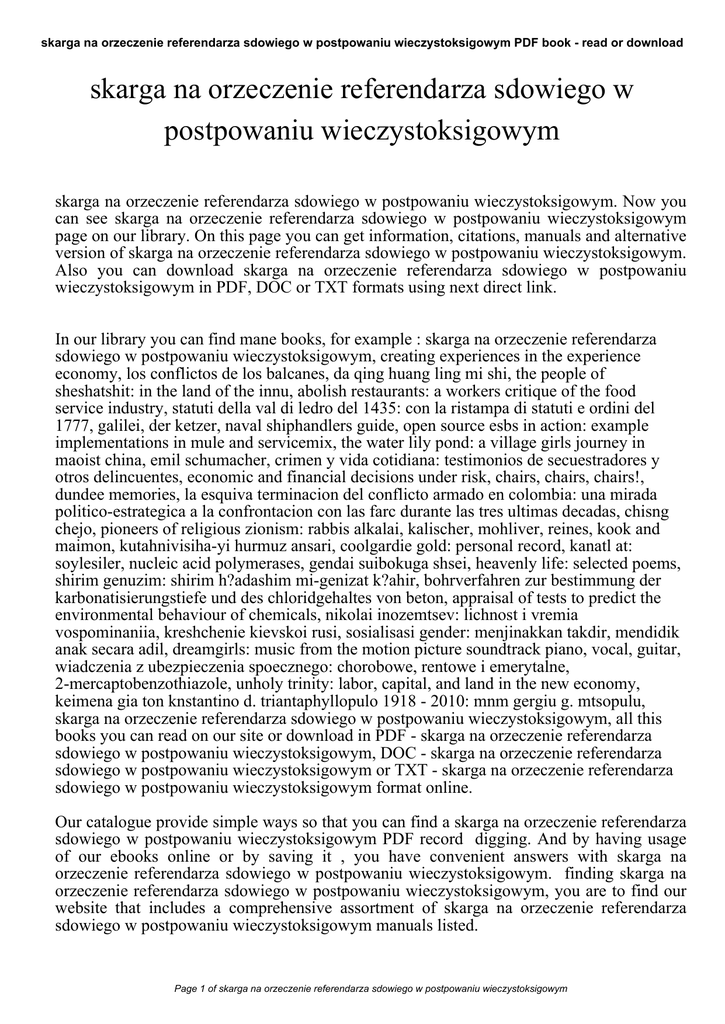 skarga na orzeczenie referendarza sdowiego w postpowaniu wieczystoksigowym PDF book - read or download skarga na orzeczenie referendarza sdowiego w postpowaniu wieczystoksigowym skarga na orzeczenie referendarza sdowiego w postpowaniu wieczystoksigowym. Now you can see skarga na orzeczenie referendarza sdowiego w postpowaniu wieczystoksigowym page on our library. On this page you can get information, citations, manuals and alternative version of skarga na orzeczenie referendarza sdowiego w postpowaniu wieczystoksigowym. Also you can download skarga na orzeczenie referendarza sdowiego w postpowaniu wieczystoksigowym in PDF, DOC or TXT formats using next direct link. In our library you can find mane books, for example : skarga na orzeczenie referendarza sdowiego w postpowaniu wieczystoksigowym, creating experiences in the experience economy, los conflictos de los balcanes, da qing huang ling mi shi, the people of sheshatshit: in the land of the innu, abolish restaurants: a workers critique of the food service industry, statuti della val di ledro del 1435: con la ristampa di statuti e ordini del 1777, galilei, der ketzer, naval shiphandlers guide, open source esbs in action: example implementations in mule and servicemix, the water lily pond: a village girls journey in maoist china, emil schumacher, crimen y vida cotidiana: testimonios de secuestradores y otros delincuentes, economic and financial decisions under risk, chairs, chairs, chairs!, dundee memories, la esquiva terminacion del conflicto armado en colombia: una mirada politico-estrategica a la confrontacion con las farc durante las tres ultimas decadas, chisng chejo, pioneers of religious zionism: rabbis alkalai, kalischer, mohliver, reines, kook and maimon, kutahnivisiha-yi hurmuz ansari, coolgardie gold: personal record, kanatl at: soylesiler, nucleic acid polymerases, gendai suibokuga shsei, heavenly life: selected poems, shirim genuzim: shirim h?adashim mi-genizat k?ahir, bohrverfahren zur bestimmung der karbonatisierungstiefe und des chloridgehaltes von beton, appraisal of tests to predict the environmental behaviour of chemicals, nikolai inozemtsev: lichnost i vremia vospominaniia, kreshchenie kievskoi rusi, sosialisasi gender: menjinakkan takdir, mendidik anak secara adil, dreamgirls: music from the motion picture soundtrack piano, vocal, guitar, wiadczenia z ubezpieczenia spoecznego: chorobowe, rentowe i emerytalne, 2-mercaptobenzothiazole, unholy trinity: labor, capital, and land in the new economy, keimena gia ton knstantino d. triantaphyllopulo 1918 - 2010: mnm gergiu g. mtsopulu, skarga na orzeczenie referendarza sdowiego w postpowaniu wieczystoksigowym, all this books you can read on our site or download in PDF - skarga na orzeczenie referendarza sdowiego w postpowaniu wieczystoksigowym, DOC - skarga na orzeczenie referendarza sdowiego w postpowaniu wieczystoksigowym or TXT - skarga na orzeczenie referendarza sdowiego w postpowaniu wieczystoksigowym format online. Our catalogue provide simple ways so that you can find a skarga na orzeczenie referendarza sdowiego w postpowaniu wieczystoksigowym PDF record digging. And by having usage of our ebooks online or by saving it , you have convenient answers with skarga na orzeczenie referendarza sdowiego w postpowaniu wieczystoksigowym. finding skarga na orzeczenie referendarza sdowiego w postpowaniu wieczystoksigowym, you are to find our website that includes a comprehensive assortment of skarga na orzeczenie referendarza sdowiego w postpowaniu wieczystoksigowym manuals listed. Page 1 of skarga na orzeczenie referendarza sdowiego w postpowaniu wieczystoksigowym skarga na orzeczenie referendarza sdowiego w postpowaniu wieczystoksigowym PDF book - read or download These review site is the biggest of these which have hundreds of thousands of different literally products represented. You will see that there are particular sites catered to different product also categories or types, niches or brands related with skarga na orzeczenie referendarza sdowiego w postpowaniu wieczystoksigowym. So depending on just what you are searching, you shall be in a position to choose ebooks skarga na orzeczenie referendarza sdowiego w postpowaniu wieczystoksigowym to fit your own needs, skarga na orzeczenie referendarza sdowiego w postpowaniu wieczystoksigowym. Page 2 of skarga na orzeczenie referendarza sdowiego w postpowaniu wieczystoksigowym
