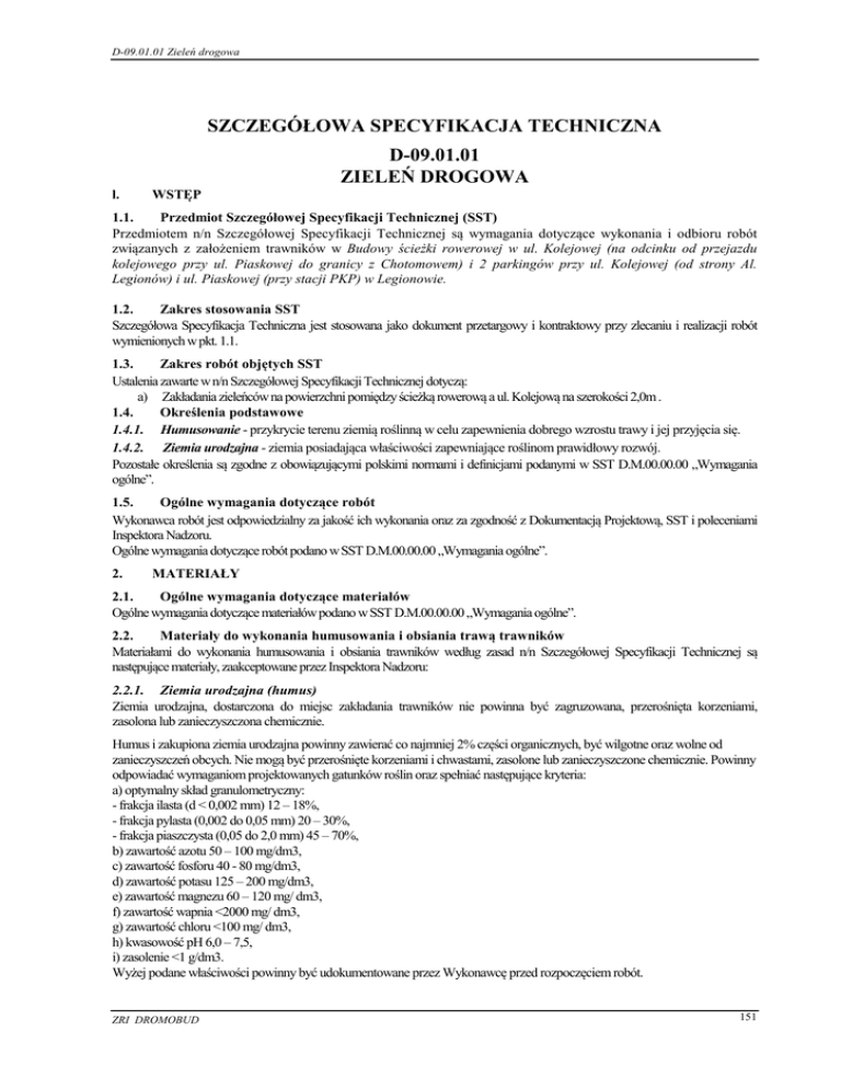 D-09.01.01 Zieleń drogowa SZCZEGÓŁOWA SPECYFIKACJA TECHNICZNA D-09.01.01 ZIELEŃ DROGOWA l. WSTĘP 1.1. Przedmiot Szczegółowej Specyfikacji Technicznej (SST) Przedmiotem n/n Szczegółowej Specyfikacji Technicznej są wymagania dotyczące wykonania i odbioru robót związanych z założeniem trawników w Budowy ścieżki rowerowej w ul. Kolejowej (na odcinku od przejazdu kolejowego przy ul. Piaskowej do granicy z Chotomowem) i 2 parkingów przy ul. Kolejowej (od strony Al. Legionów) i ul. Piaskowej (przy stacji PKP) w Legionowie. 1.2. Zakres stosowania SST Szczegółowa Specyfikacja Techniczna jest stosowana jako dokument przetargowy i kontraktowy przy zlecaniu i realizacji robót wymienionych w pkt. 1.1. 1.3. Zakres robót objętych SST Ustalenia zawarte w n/n Szczegółowej Specyfikacji Technicznej dotyczą: a) Zakładania zieleńców na powierzchni pomiędzy ścieżką rowerową a ul. Kolejową na szerokości 2,0m . 1.4. Określenia podstawowe 1.4.1. Humusowanie - przykrycie terenu ziemią roślinną w celu zapewnienia dobrego wzrostu trawy i jej przyjęcia się. 1.4.2. Ziemia urodzajna - ziemia posiadająca właściwości zapewniające roślinom prawidłowy rozwój. Pozostałe określenia są zgodne z obowiązującymi polskimi normami i definicjami podanymi w SST D.M.00.00.00 „Wymagania ogólne”. 1.5. Ogólne wymagania dotyczące robót Wykonawca robót jest odpowiedzialny za jakość ich wykonania oraz za zgodność z Dokumentacją Projektową, SST i poleceniami Inspektora Nadzoru. Ogólne wymagania dotyczące robót podano w SST D.M.00.00.00 „Wymagania ogólne”. 2. MATERIAŁY 2.1. Ogólne wymagania dotyczące materiałów Ogólne wymagania dotyczące materiałów podano w SST D.M.00.00.00 „Wymagania ogólne”. 2.2. Materiały do wykonania humusowania i obsiania trawą trawników Materiałami do wykonania humusowania i obsiania trawników według zasad n/n Szczegółowej Specyfikacji Technicznej są następujące materiały, zaakceptowane przez Inspektora Nadzoru: 2.2.1. Ziemia urodzajna (humus) Ziemia urodzajna, dostarczona do miejsc zakładania trawników nie powinna być zagruzowana, przerośnięta korzeniami, zasolona lub zanieczyszczona chemicznie. Humus i zakupiona ziemia urodzajna powinny zawierać co najmniej 2% części organicznych, być wilgotne oraz wolne od zanieczyszczeń obcych. Nie mogą być przerośnięte korzeniami i chwastami, zasolone lub zanieczyszczone chemicznie. Powinny odpowiadać wymaganiom projektowanych gatunków roślin oraz spełniać następujące kryteria: a) optymalny skład granulometryczny: - frakcja ilasta (d < 0,002 mm) 12 – 18%, - frakcja pylasta (0,002 do 0,05 mm) 20 – 30%, - frakcja piaszczysta (0,05 do 2,0 mm) 45 – 70%, b) zawartość azotu 50 – 100 mg/dm3, c) zawartość fosforu 40 - 80 mg/dm3, d) zawartość potasu 125 – 200 mg/dm3, e) zawartość magnezu 60 – 120 mg/ dm3, f) zawartość wapnia <2000 mg/ dm3, g) zawartość chloru <100 mg/ dm3, h) kwasowość pH 6,0 – 7,5, i) zasolenie <1 g/dm3. Wyżej podane właściwości powinny być udokumentowane przez Wykonawcę przed rozpoczęciem robót. ZRI DROMOBUD 151 D-09.01.01 Zieleń drogowa 2.2.2. Trawa Wybór gatunków traw należy dopasować do warunków miejscowych, a więc do rodzaju gleby i stopnia jej zawilgocenia. Najlepiej nadają się do tego specjalne mieszanki traw, mające gęste i drobne korzonki . Do obsiania trawników należy użyć nasion uniwersalnej mieszanki traw o gwarantowanej jakości. 3. SPRZĘT 3.1. Wymagania ogólne dotyczące sprzętu Wymagania ogólne dotyczące sprzętu podano w SST D.M.00.00.00 „Wymagania ogólne”. 3.2. Sprzęt do wykonania robót Do wykonania robót należy stosować następujący sprzęt zaakceptowany przez Inspektora Nadzoru: do uprawy gleby - glebogryzarka, sprzęt do zakładania trawników - wał kolczatka oraz wał gładki, do pozyskania ziemi urodzajnej - spycharka i ładowarka, do pielęgnacji trawników - kosiarki mechaniczne do koszenia, do transportu - samochody ciężarowe. Pozostałe roboty mogą być wykonane ręcznie. 4. TRANSPORT 4.1. Wymagania ogólne dotyczące transportu Wymagania ogólne dotyczące transportu podano w SST D.M.00.00.00 „Wymagania ogólne”. 4.2. Transport materiałów do zakładania trawników 4.2.1. Transport ziemi urodzajnej Transport ziemi urodzajnej może być wykonywany dowolnymi środkami transportu, wybranymi przez Wykonawcę. 4.2.2. Transport nasion trawy Środki transportowe powinny być czyste i zabezpieczające nasiona przed zamoknięciem oraz obniżeniem ich wartości siewnej. 5. WYKONANIE ROBÓT 5.1. Ogólne zasady wykonywania robót Ogólne zasady wykonywania robót podano w SST D.M.00.00.00 „Wymagania ogólne”. Wykonawca przedstawi Inspektorowi Nadzoru do akceptacji projekt organizacji i harmonogram robót, uwzględniające wszystkie warunki w jakich będą zakładane trawniki. 5.2. Zakładanie trawników Wymagania dotyczące wykonywania robót związanych z trawnikami są następujące: teren pod trawniki musi być oczyszczony z gruzu i zanieczyszczeń, teren (grunt rodzimy) powinien być wyrównany i splantowany, teren trawnika, zieleńca po zahumusowaniu powinien być obniżony w stosunku do krawężników i obrzeży o 2 cm, ziemia roślinna powinna być rozścielona równą warstwą gr. 10 cm i starannie wyrównana, przed siewem nasion trawy ziemię należy wałować wałem gładkim a potem wałem kolczatką lub zagrabić, siew powinien być dokonany w dni bezwietrzne, okres siania - najlepszy okres wiosenny, najpóźniej do połowy września, na terenie płaskim nasiona traw należy wysiewać w ilości 2 kg na 100 m2. nasiona traw należy przykryć przez wymieszanie z ziemią grabiami lub wałem kolczatką. Po wysiewie nasion ziemia powinna być wałowana lekkim wałem w celu ostatecznego wyrównania i stworzenia dobrych warunków dla podsiąkania wody, pierwsze koszenie powinno być przeprowadzone, gdy trawa osiągnie wysokość ok. 5÷10 cm, nast