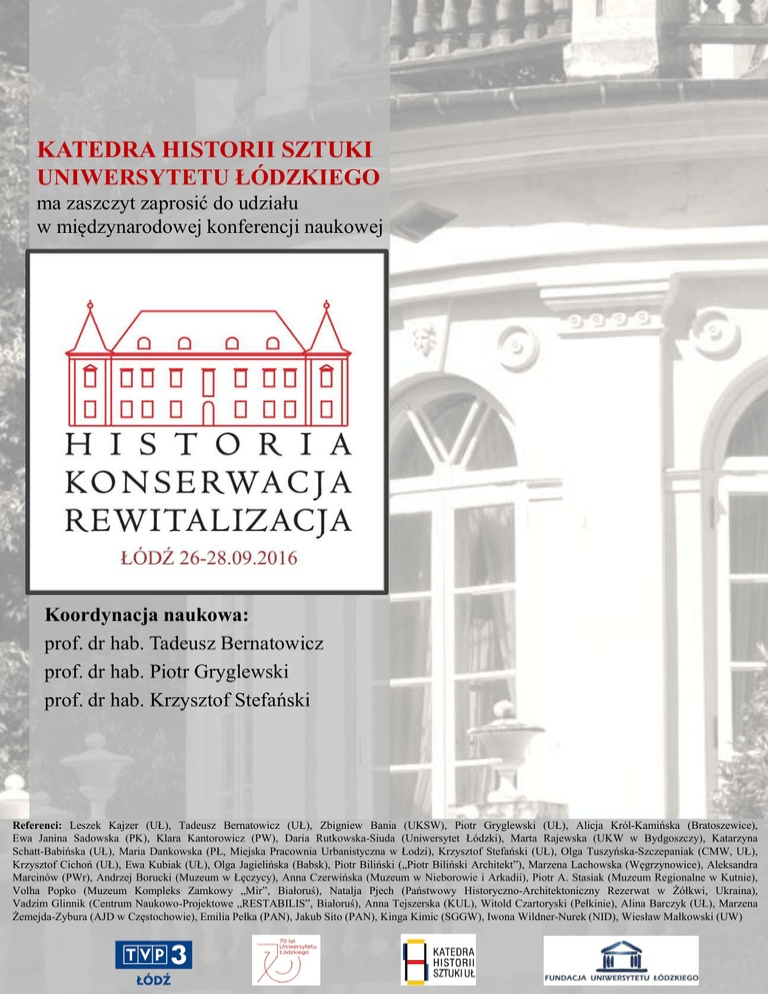 KATEDRA HISTORII SZTUKI UNIWERSYTETU ŁÓDZKIEGO ma zaszczyt zaprosić do udziału w międzynarodowej konferencji naukowej Koordynacja naukowa: prof. dr hab. Tadeusz Bernatowicz prof. dr hab. Piotr Gryglewski prof. dr hab. Krzysztof Stefański Referenci: Leszek Kajzer (UŁ), Tadeusz Bernatowicz (UŁ), Zbigniew Bania (UKSW), Piotr Gryglewski (UŁ), Alicja Król-Kamińska (Bratoszewice), Ewa Janina Sadowska (PK), Klara Kantorowicz (PW), Daria Rutkowska-Siuda (Uniwersytet Łódzki), Marta Rajewska (UKW w Bydgoszczy), Katarzyna Schatt-Babińska (UŁ), Maria Dankowska (PŁ, Miejska Pracownia Urbanistyczna w Łodzi), Krzysztof Stefański (UŁ), Olga Tuszyńska-Szczepaniak (CMW, UŁ), Krzysztof Cichoń (UŁ), Ewa Kubiak (UŁ), Olga Jagielińska (Babsk), Piotr Biliński („Piotr Biliński Architekt”), Marzena Lachowska (Węgrzynowice), Aleksandra Marcinów (PWr), Andrzej Borucki (Muzeum w Łęczycy), Anna Czerwińska (Muzeum w Nieborowie i Arkadii), Piotr A. Stasiak (Muzeum Regionalne w Kutnie), Volha Popko (Muzeum Kompleks Zamkowy „Mir”, Białoruś), Natalja Pjech (Państwowy Historyczno-Architektoniczny Rezerwat w Żółkwi, Ukraina), Vadzim Glinnik (Centrum Naukowo-Projektowe „RESTABILIS”, Białoruś), Anna Tejszerska (KUL), Witold Czartoryski (Pełkinie), Alina Barczyk (UŁ), Marzena Żemejda-Zybura (AJD w Częstochowie), Emilia Pełka (PAN), Jakub Sito (PAN), Kinga Kimic (SGGW), Iwona Wildner-Nurek (NID), Wiesław Małkowski (UW)