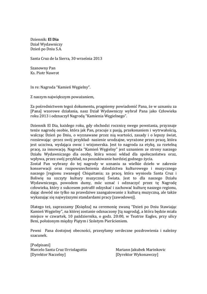 Dziennik: El Dia Dział Wydawniczy Dzień po Dniu S.A. Santa Cruz de la Sierra, 30 września 2013 Szanowny Pan Ks. Piotr Nawrot In re: Nagroda “Kamień Węgielny”. Z naszym największym poważaniem, Za pośrednictwem tegoż dokumentu, pragniemy powiadomić Pana, że w uznaniu za [Pana] wzorowe działania, nasz Dział Wydawniczy wybrał Pana jako Człowieka roku 2013 i odznaczył Nagrodą “Kamienia Węgielnego”. Dziennik El Dia, każdego roku, gdy obchodzi rocznicę swego powstania, przyznaje tenże nagrodę osobie, która jak Pan, pracuje z pasją, przekonaniem i wytrwałością, walcząc Dzień po Dniu, o wyznawane przez nią wartości, zasady i o lepszy świat, rozsiewając -przez swój przykład- nasienie urodzajne, wyrażone przez pracę, która jest uczciwa, wydająca owoc i wizjonerska. Jest to nagroda za etykę, za rzetelną pracę, za innowację. Nagroda “Kamień Węgielny” jest uznaniem ze strony naszego Działu Wydawniczego dla osoby, która wnosi wkład dla społeczeństwa oraz, wpływa, przez swój przykład, na poszukiwanie bardziej godnego życia. Został Pan wybrany do tej nagrody w uznaniu za wielkie dzieło w zakresie konserwacji oraz rozpowszechnienia dziedzictwa kulturowego i muzycznego naszego [regionu zwanego] Chiquitania; za pracę, która wyniosła Santa Cruz i Boliwię na szczyty kultury muzycznej Świata. Jest to dla naszego Działu Wydawniczego, powodem dumy, móc uznać i odznaczyć przez tę Nagrodę człowieka, który z sukcesem potrafił odzyskać i zachować kulturę naszego regionu, dając dowód nie tylko na prawdziwe zaangażowanie z kulturą muzyczną, ale także wykazując się najwyższymi standardami pracy [zawodowej]. Dlatego też, zapraszamy [Księdza] na ceremonię zwaną “Dzień po Dniu Stawiając Kamień Węgielny”, na której zostanie odznaczony [tą nagrodą], a która będzie miała miejsce w czwartek, 10 października, o godz. 20:00, w Teatrze Eagles, przy ulicy Beni, położonym między Piątym i Szóstym Pierścieniem. Pewni Pana dostojnej obecności, przesyłamy serdeczne pozdrowienia i należny szacunek. [Podpisani] Marcelo Santa Cruz Urriolagoitia [Dyrektor Naczelny] Mariann Jakubek Marinkovic [Dyrektor Wykonawczy]