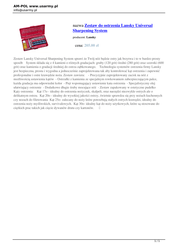 AM-POL www.usarmy.pl [email protected] nazwa Zestaw do ostrzenia Lansky Universal Sharpening System producent: Lansky cena: 205.00 zł Zestaw Lansky Universal Sharpening System sprawi że Twój nóż będzie ostry jak brzytwa i to w bardzo prosty sposób System składa się z 4 kamieni o różnych gradacjach: gruby (120 grit) średni (280 grit) oraz szorstki (600 grit) oraz kamienia o gradacji średniej do ostrza ząbkowanego. Technologia systemów ostrzenia firmy Lansky jest bezpieczna, prosta i wygodna a jednocześnie zaprojektowana tak aby kontrolować kąt ostrzenia i zapewnić profesjonalne i ostre krawędzie noża. Zestaw zawiera: - Precyzyjnie zaprojektowany zacisk na nóż z możliwością ustawienia kątów - Ostrzałki z kamienia ze specjalnym rowkowaniem zabezpieczającym palce, każda gradacja ma odpowiedni kolor - Pręt wspomagający ustawienie kata ostrzenia - Specjalistyczny olej ułatwiający ostrzenie - Dodatkowe długie śruby mocujące nóż - Zestaw zapakowany w estetyczne pudełko Kąty ostrzenia: Kąt 17o - idealny do ostrzenia nożyczek, skalpeli, oraz narzędzi niezwykle ostrych ale o delikatnym ostrzu. Kąt 20o - idealny do wysokiej jakości ostrzy, świetnie sprawdza się przy nożach kuchennych czy nozach do filetowania Kąt 25o- zalecany do noży które potrzebują stałych ostrych krawędzi, idealny do ostrzenia noży myśliwskich, survivalowych. Kąt 30o- idealny kąt do noży użytkowych, które są stosowane do ciężkich prac takich jak cięcie dywanów drutu czy kartonów. 1/1