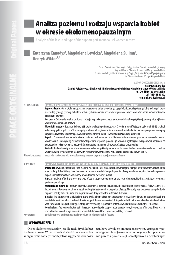 Analiza poziomu i rodzaju wsparcia kobiet w okresie okołomenopauzalnym Analysis of the level and type of the support peri-menopausal women receive Katarzyna Kanadys¹, Magdalena Lewicka¹, Magdalena Sulima¹, Henryk Wiktor¹,² 1 Zakład Położnictwa, Ginekologii i Pielęgniarstwa Położniczo-Ginekologicznego, Wydział Nauk o Zdrowiu, Uniwersytet Medyczny w Lublinie 2 Oddział Ginekologii i Położnictwa z Izbą Przyjęć, Wojewódzki Szpital Specjalistyczny im. Stefana Kardynała Wyszyńskiego w Lublinie AUTOR DO KORESPONDENCJI: Katarzyna Kanadys Zakład Położnictwa, Ginekologii i Pielęgniarstwa Położniczo-Ginekologicznego UM w Lublinie ul. Chodźki 6, 20-093 Lublin tel. (81) 448 69 30, e-mail: [email protected] STRESZCZENIE Słowa kluczowe: ABSTRACT Key words: ANALIZA POZIOMU I RODZAJU WSPARCIA KOBIET W OKRESIE OKOŁOMENOPAUZALNYM Wprowadzenie. Okres okołomenopauzalny to czas wielu zmian biologicznych, psychologicznych i społecznych. Dla niektórych kobiet jest trudną sytuacją życiową. Kobieta w obliczu tych zmian może oczekiwać wsparcia od innych osób, które może być warunkowane przez różne czynniki. Cel pracy. Dokonanie analizy poziomu i rodzaju wsparcia społecznego zależnie od charakterystyki socjodemograficznej kobiet w okresie okołomenopauzalnym Materiał i metody. Badaniami objęto 268 kobiet w okresie perimenopauzy. Kryteriami kwalifikującymi były: wiek 45-55 lat, brak zaburzeń psychicznych i chorób wymagających hospitalizacji w okresie przeprowadzania badania. Badania przeprowadzono przy użyciu Skali Wsparcia Społecznego (SWS) autorstwa Kmiecik-Baran i kwestionariusza ankiety autorskiej. Wyniki. Przeprowadzone badania własne poziomu i rodzaju wsparcia kobiet w okresie okołomenopauzalnym wykazały, że wiek, wykształcenie i stan cywilny nie warunkowały poziomu wsparcia społecznego, w ocenie ogólnej jak i szczegółowej z podziałem na poszczególne rodzaje wsparcia badanych (informacyjne, instrumentalne, wartościujące, emocjonalne. Wnioski. Badane kobiety w okresie okołomenopauzalnym uzyskiwały wsparcie społeczne na średnim poziomie niezależnie od rodzaju wsparcia. Wiek, wykształcenie, stan cywilny nie warunkowały poziomu wsparcia społecznego badanych kobiet. wsparcie społeczne, okres okołomenopauzany, czynniki soscjodemograficzne ANALYSIS OF THE LEVEL AND TYPE OF SUPPORT PERIMENOPAUSAL WOMEN RECEIVE Introduction. Perimenopausal period is a time when numerous biological and psychological changes occur to women. This might be a particularly difficult time, since there are also numerous social changes happening. Every female undergoing these changes could expect support from others, which may be conditioned by various factors. Aim. An analysis of both the level and type of social support, depending on the socio-demographic characteristics of women at perimenopausal age. Material and methods. The study covered 268 women at perimenopausal age. The qualification criteria were as follows: age 45-55, lack of mental disorders, no diseases requiring hospitalization during the period of study. The study was conducted using the Social Support Scale by Kmiecik-Baran and a questionnaire designed by the authors of this work. Results. The authors’ own study looking at the level and type of support that women receive showed that age, education level, and marital status did not affect the level of social support the women received. This pertains both to the overall and detailed evaluation, with the division into particular types of support received by respondents (informative, instrumental, evaluative, emotional. Conclusions. The women looked at in the study received social support at an average level, irrespective of its type. There was no correlation between the age, education or marital status and the type of support they received. social support, perimenopausal period, socio-demographic factors WPROWADZENIE Okres okołomenopauzalny jest dla niektórych kobiet trudnym czasem. W tym okresie dochodzi do wielu zmian w organizmie kobiety w następstwie wygasania czynności 18 jajników. Wynikiem zmniejszonej syntezy estrogenów jest występowanie objawów: wazomotorycznych (np. uderzenia gorąca i pocenie się), somatycznych i psychicznych Pielęgniarstwo XXI wieku Katarzyna Kanadys, Magdalena Lewicka, Magdalena Sulima, Henryk Wiktor [1]. Ponadto w tym okresie zwykle do problemów zdrowotnych kobiety dołącza się wiele negatywnych wydarzeń i zmian psychospołecznych, takich jak: usamodzielnienie się dzieci, choroba i śmierć rodziców, przejście na emeryturę, pogorszenie się zdrowia partnera, jego odejście lub śmierć [2]. Kobieta w obliczu tych zmian może oczekiwać wsparcia od innych osób. Pojęcie wsparcia społecznego mimo wielu publikacji pozostaje nadal pojęciem wieloznacznym. Do chwili obecnej nie wyłoniono jednej wspólnej definicji dla tego obszaru badań [3-6]. Jedna z wielu definicji wsparcia zaproponowana przez Sarason’a [cyt. za 6] określa wsparcie jako: „pomoc dostępną dla jednostki w sytuacjach trudnych”. Natomiast Sęk [5] określa wsparcie społeczne jako „rodzaj interakcji społecznej podjętej przez jedną lub dwie strony w sytuacji problemowej, w której dochodzi do wymiany informacyjnej, emocjonalnej lub instrumentalnej.” Pojęcie wsparcia wiąże się z istnieniem sieci społecznej, czyli funkcjonowaniem człowieka wśród innych ludzi (np.: posiadanie małżonka, dzieci, przyjaciół, sąsiadów). Z kolei pojęcie sieci społecznej wiąże się z pojęciem źródeł wsparcia, które Sęk i Cieślak [6] dzielą na rodzinne (mąż, dzieci, rodzice, rodzeństwo i dalsi krewni), przyjacielskie i towarzyskie, sąsiedzkie, profesjonalne (terapeuci, lekarze, pielęgniarki) oraz uzyskiwane w grupach samopomocy, grupach wyznaniowych, towarzystwach i instytucjach. W zależności od treści interakcji wspierającej w piśmiennictwie spotyka się różne rodzaje wsparcia społecznego. Najczęściej jednak wy