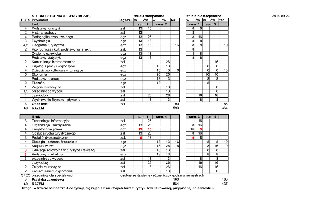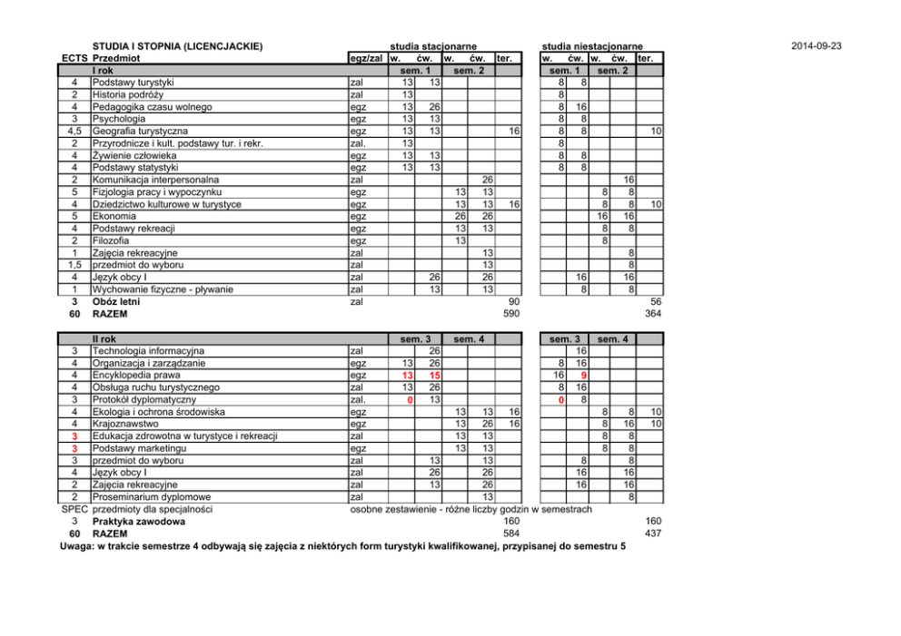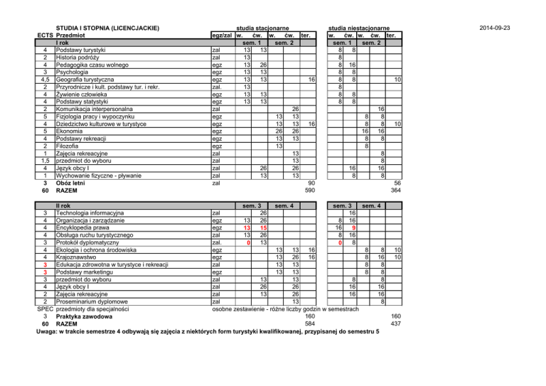 STUDIA I STOPNIA (LICENCJACKIE) ECTS Przedmiot I rok 4 Podstawy turystyki 2 Historia podróży 4 Pedagogika czasu wolnego 3 Psychologia 4,5 Geografia turystyczna 2 Przyrodnicze i kult. podstawy tur. i rekr. 4 Żywienie człowieka 4 Podstawy statystyki 2 Komunikacja interpersonalna 5 Fizjologia pracy i wypoczynku 4 Dziedzictwo kulturowe w turystyce 5 Ekonomia 4 Podstawy rekreacji 2 Filozofia 1 Zajęcia rekreacyjne 1,5 przedmiot do wyboru 4 Język obcy I 1 Wychowanie fizyczne - pływanie 3 Obóz letni 60 RAZEM studia stacjonarne egz/zal w. ćw. w. ćw. ter. sem. 1 sem. 2 zal 13 13 zal 13 egz 13 26 egz 13 13 egz 13 13 16 zal. 13 egz 13 13 egz 13 13 zal 26 egz 13 13 egz 13 13 16 egz 26 26 egz 13 13 egz 13 zal 13 zal 13 zal 26 26 zal 13 13 zal 90 590 studia niestacjonarne w. ćw. w. ćw. ter. sem. 1 sem. 2 8 8 8 8 16 8 8 8 8 10 8 8 8 8 8 16 8 8 8 8 10 16 16 8 8 8 8 8 16 16 8 8 56 364 II rok sem. 3 sem. 4 sem. 3 sem. 4 3 Technologia informacyjna zal 26 16 4 Organizacja i zarządzanie egz 13 26 8 16 4 Encyklopedia prawa egz 16 13 15 9 4 Obsługa ruchu turystycznego zal 13 26 8 16 3 Protokół dyplomatyczny zal. 13 8 0 0 4 Ekologia i ochrona środowiska egz 13 13 16 8 8 4 Krajoznawstwo egz 13 26 16 8 16 Edukacja zdrowotna w turystyce i rekreacji zal 13 13 8 8 3 Podstawy marketingu egz 13 13 8 8 3 3 przedmiot do wyboru zal 13 13 8 8 4 Język obcy I zal 26 26 16 16 2 Zajęcia rekreacyjne zal 13 26 16 16 2 Proseminarium dyplomowe zal 13 8 SPEC przedmioty dla specjalności osobne zestawienie - różne liczby godzin w semestrach 3 160 Praktyka zawodowa 584 60 RAZEM Uwaga: w trakcie semestrze 4 odbywają się zajęcia z niektórych form turystyki kwalifikowanej, przypisanej do semestru 5 10 10 160 437 2014-09-23 STUDIA I STOPNIA (LICENCJACKIE) studia stacjonarne studia niestacjonarne ECTS Przedmiot egz/zal w. ćw. w. ćw. ter. w. ćw. w. ćw. ter. III rok sem. 5 sem. 6 sem. 5 sem. 6 2 Kształtowanie środowiska i zagospodarowanie turystyczne egz 13 13 8 8 3 Ekonomika turystyki i rekreacji egz 13 26 8 16 2 Pilotaż i przewodnictwo egz 13 26 8 16 Turystyka kwalifikowana/alternatywna kulturowa/uprawnienzal 39 24 3 1,5 przedmiot do wyboru zal 13 8 5,5 Hotelarstwo zal 13 13 8 8 5 Socjologia egz 13 13 8 8 Język obcy I egz 26 26 16 16 4 4 Zajęcia rekreacyjne zal 26 26 16 16 Proseminarium dyplomowe zal 26 13 16 8 9 SPEC przedmioty dla specjalności osobne zestawienie - różne liczby godzin w semestrach 351 216 60 RAZEM przedmioty ogólne przedmioty dla specjalności 180 SUMA ze wszystkich semestrów 1525 312 1837 1017 192 1209 2014-09-23