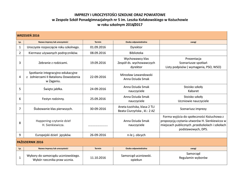 IMPREZY I UROCZYSTOŚCI SZKOLNE ORAZ POWIATOWE w Zespole Szkół Ponadgimnazjalnych nr 5 im. Leszka Kołakowskiego w Kożuchowie w roku szkolnym 2016/2017 WRZESIEO 2016 Lp. Nazwa imprezy lub uroczystości Termin Osoba odpowiedzialna uwagi 1 Uroczyste rozpoczęcie roku szkolnego. 01.09.2016 Dyrektor 2 Kiermasz używanych podręczników. 08.09.2016 Biblioteka 3 Zebranie z rodzicami. 19.09.2016 Wychowawcy klas Zespół ds. wychowawczych dyrektor 4 Spotkanie integracyjno-edukacyjne z żołnierzami II Batalionu Dowodzenia w Żaganiu. 22-09-2016 Mirosław Lewandowski Anna Dziuda Smak 5 Święto jabłka. 24-09-2016 Anna Dziuda Smak nauczyciele Stoisko szkoły Kabaret 6 Festyn rodzinny. 25.09.2016 Anna Dziuda Smak nauczyciele Stoisko szkoły Uczniowie nauczyciele 7 Ślubowanie klas pierwszych. 30-09-2016 Aneta Łozioska, klasa 2 TLI Beata Ciurzyoska , kl.: 2 AZ Scenariusz imprezy 8 Happening-czytanie dzieł H. Sienkiewicza. ……………………. Anna Dziuda Smak nauczyciele Forma wyjścia do społeczności Kożuchowa z propozycją czytania utworów H. Sienkiewicza w miejscach publicznych ,przedszkolach i szkołach podstawowych, DPS. 9 Europejski dzieo języków. 26-09-2016 n-le j. obcych Termin Osoba odpowiedzialna 11.10.2016 Samorząd uczniowski. opiekun Prezentacja Scenariusze spotkao Listy podpisów ( wymagania, PSO, WSO) PAŹDZIERNIK 2016 Lp. Nazwa imprezy lub uroczystości 1 Wybory do samorządu uczniowskiego. Wybór rzecznika praw ucznia. uwagi Samorząd Regulamin wyborów 2 Święto Edukacji Narodowej. 13.10.2016 Samorząd, biblioteka, 3 Góra Grosza 2016. październik Samorząd, biblioteka, klub wolontariusza Zajęcia w terenie dla klasy mundurowej. Wychowawca klasy : II Tli N-le wych – fizy..Mirosław Lewandowski, Marcin Wojciechowski Scenariusz, plan działania. 5 Ślubowanie klasy mundurowej. Dzieo Patrona Szkoły. 25-10-2016 Wychowawca klasy : II Tli N-le wych – fizy. Mirosław Lewandowski, Marcin Wojciechowski Anna Dziuda Smak Opracowanie scenariusza. Zaproszeo. 6 „ Bajki nie na dobranoc” .Szkolny konkurs pięknego czytania. 26-10-2016 Biblioteka n-l j. pol. 28-10-2016 Samorząd szkolny. Dorota Szefler. Wolontariat-Renata Raczykowska 4 7 Akcja „ Ocalid od zapomnienia”. Bajki Leszka Kołakowskiego. Regulamin Współpraca z gimnazjum w Kożuchowie. LISTOPAD 2016 Lp. Nazwa imprezy lub uroczystości 1 Dzieo Niepodległości. Termin Osoba odpowiedzialna uwagi 11.11.2016 Anna Dzida Smak Scenariusz, Współpraca KOKiS „ Zamek” Tydzieo kariery Małgorzata Antosik Joanna Dudek Jadwiga Slefarska Spotkanie z zawodem” Lekcje otwarte dla gimnazjalistów. 2 Konkurs informatyczny dla Gimnazjalistów. do uzgodnienia z Gimnazjum Małgorzata Antosik Joanna Dudek Renata Raczykowska – doradca zawodowy „Planowanie kariery, czyli jaki zawód wybrad”. 3 Kampania antynikotynowa. Marcin Wojciechowski Zespół nauczycieli (3 lub 4 i reszta nauczycieli do realizacji) 20 listopad 2016 Anna Kalioska Pielęgniarka szkolna Samorząd uczniowski Pakiet lekcji otwartych z zakresu preorientacji zawodowej o różnorodnej tematyce (z dziedziny logistyki i spedycji). Celem lekcji otwartych będzie przedstawienie atrakcyjnej ścieżki kształcenia zawodowego, którą jest nauka w technikum. Konkurs z grafiki komputerowej bądź z programowania (platforma Scratch Forma zajęd: zajęcia informacyjne Adresat: uczniowie gimnazjum zainteresowani proponowanym tematem scenariusz Grudzieo 2016 Lp. Nazwa imprezy lub uroczystości Termin Realizacja 1 Szkolny konkurs wiedzy o HIV/AIDS 01.12.2016 Zespól ds. profilaktyki 2 Dzieo Wolontariusza” I wolontariusz może zostad Świętym Mikołajem” 06.12.2016 Samorząd uczniowski. Dorota Szefler. 3 Międzynarodowy dzieo praw człowieka. 10-12-2016 Mateusz Czerwioski Pedagog szkolny Sposób realizacji Wyjście do uczniów SP nr 2. 13.12.2016 Mateusz Czerwioski Kl. ITL grudzieo Samorząd uczniowski. Klub wolontariusz Renata Raczykowska Dorota Szefler. 6 Literacki prezent pod choinkę „Czytanie książek” 22.012.2017 Monika Zabrocka Kl. 4 TS organizacja Uczniowie czytają książki dzieciom w szkole Podstawowej nr 1 i 2 klasy 1-3. Chętni uczniowie oraz Samorząd Uczniowski. 7 Wigilie i Jasełka Z kolędą u pensjonariuszy DPS w Kożuchowie. 21.12.2016 Joanna Lesków Samorząd szkolny, wolontariusze, scenariusz Anna Kalioska Marcin Wojciechowski Klasa: I TL Kampania dotyczy wciąż powszechnego problemu spalania śmieci w domowych piecach. Celem tego programu edukacyjnego jest prowadzenie lokalnych działao promujących właściwe zagospodarowanie i segregację odpadów. 4 Dzieo pamięci ofiar stanu wojennego. 5 Ogólnopolska akcja charytatywna „Szlachetna paczka” 8 Kampania informacyjna/ekologiczna; „Palisz śmieci –trujesz”. 9 Konkurs. …………………… Biblioteka STYCZEO 2017 Lp. Nazwa imprezy lub uroczystości Termin Osoba odpowiedzialna uwagi 1 Konkurs: „Szkolny mistrz ortografii”. 24-01-017 Biblioteka nauczyciele Etap klasowy. 2 Wielka Orkiestra Świątecznej Pomocy. ……………. Dorota Szefler KOK i S „Zamek” w Kożuchowie. 3 Studniówka. ……………….. Monika Zabrocka, 4 TS Rodzice Wychowawca 4 Gra / konkurs dla gimnazjów z powiatu o tematyce ogólno-przedmiotowej. 30.01,2016 Aneta Łozioska Marcin Wojciechowski Gra zespołowa/teleturniej z przedmiotów ogólnych: informatyka, matematyka, przedmioty przyrodnicze, humanistyczne LUTY 2017 Lp. Nazwa imprezy lub uroczystości Termin Osoba odpowiedzialna uwagi 1 Konkurs: „Szkolny mistrz ortografii.” 13-02-2017 biblioteka Etap szkolny. 2 Walentynki- konkurs szkolny. 14/15.02.2016 Samorząd Realizator: 3 Projekt „ Mój wymarzony zawód”. 21-02-2016 Doradca zawodowy Adam Stelmaszyk Scenariusz imprezy MARZEC 2017 Lp. Nazwa imprezy lub uroczystości Termin Osoba odpowiedzialna uwagi 1 Powiatowy Konkurs Przedsiębiorczości. 17-03-2017 Małgorzata Antosik Realizator: Notatka ,zdjęcia 3 Debata oxfordzka w języku angielskim. 27-03-2017 Aneta Łozioska Realizator: No