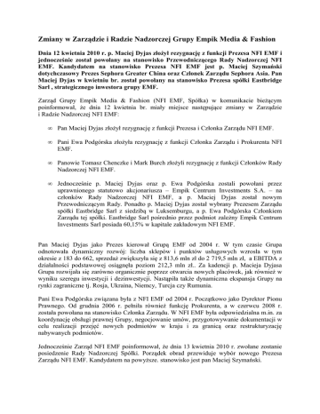 Zmiany w Zarządzie i Radzie Nadzorczej Grupy Empik Media & Fashion Dnia 12 kwietnia 2010 r. p. Maciej Dyjas złożył rezygnację z funkcji Prezesa NFI EMF i jednocześnie został powołany na stanowisko Przewodniczącego Rady Nadzorczej NFI EMF. Kandydatem na stanowisko Prezesa NFI EMF jest p. Maciej Szymański dotychczasowy Prezes Sephora Greater China oraz Członek Zarządu Sephora Asia. Pan Maciej Dyjas w kwietniu br. został powołany na stanowisko Prezesa spółki Eastbridge Sarl , strategicznego inwestora grupy EMF. Zarząd Grupy Empik Media & Fashion (NFI EMF, Spółka) w komunikacie bieżącym poinformował, że dnia 12 kwietnia br. miały miejsce następujące zmiany w Zarządzie i Radzie Nadzorczej NFI EMF: • Pan Maciej Dyjas złożył rezygnację z funkcji Prezesa i Członka Zarządu NFI EMF. • Pani Ewa Podgórska złożyła rezygnację z funkcji Członka Zarządu i Prokurenta NFI EMF. • Panowie Tomasz Chenczke i Mark Burch złożyli rezygnację z funkcji Członków Rady Nadzorczej NFI EMF. • Jednocześnie p. Maciej Dyjas oraz p. Ewa Podgórska zostali powołani przez uprawnionego statutowo akcjonariusza – Empik Centrum Investments S.A. – na członków Rady Nadzorczej NFI EMF, a p. Maciej Dyjas został nowym Przewodniczącym Rady. Ponadto p. Maciej Dyjas został wybrany Prezesem Zarządu spółki Eastbridge Sarl z siedzibą w Luksemburgu, a p. Ewa Podgórska Członkiem Zarządu tej spółki. Eastbridge Sarl pośrednio przez podmiot zależny Empik Centrum Investments Sarl posiada 60,15% w kapitale zakładowym NFI EMF. Pan Maciej Dyjas jako Prezes kierował Grupą EMF od 2004 r. W tym czasie Grupa odnotowała dynamiczny rozwój: liczba sklepów i punktów usługowych wzrosła w tym okresie z 183 do 662, sprzedaż zwiększyła się z 813,6 mln zł do 2 719,5 mln zł, a EBITDA z działalności podstawowej osiągnęła poziom 212,3 mln zł.. Za kadencji p. Macieja Dyjasa Grupa rozwijała się zarówno organicznie poprzez otwarcia nowych placówek, jak również w wyniku szeregu inwestycji i dezinwestycji. Nastąpiła także dynamiczna ekspansja Grupy na rynki zagraniczne tj. Rosja, Ukraina, Niemcy, Turcja czy Rumunia. Pani Ewa Podgórska związana była z NFI EMF od 2004 r. Początkowo jako Dyrektor Pionu Prawnego. Od grudnia 2006 r. pełniła również funkcję Prokurenta, a w czerwcu 2008 r. została powołana na stanowisko Członka Zarządu. W NFI EMF była odpowiedzialna m.in. za koordynację obsługi prawnej Grupy, negocjowanie umów, przygotowywanie dokumentacji w celu realizacji przejęć nowych podmiotów w kraju i za granicą oraz restrukturyzację nabywanych podmiotów. Jednocześnie Zarząd NFI EMF poinformował, że dnia 13 kwietnia 2010 r. zwołane zostanie posiedzenie Rady Nadzorczej Spółki. Porządek obrad przewiduje wybór nowego Prezesa Zarządu NFI EMF. Kandydatem na powyższe. stanowisko jest pan Maciej Szymański. Pan Maciej Szymański to doświadczony manager i strateg, który doskonale zna branżę handlową z wielu rynków i modeli biznesowych. Od 1999 r. był związany z Grupą LVMH, początkowo jako Dyrektor Generalny Sephora Polska, odpowiedzialny za otwarcie i rozwój polskiej dywizji tej spółki, następnie jako Dyrektor Generalny regionu Europy Wschodniej gdzie zajmował się rozwojem operacji w Polsce, Czechach, Słowacji i Rosji. W 2006 r. p. Maciej Szymański awansował na stanowisko Dyrektora Generalnego Sephora Francja. Od połowy 2008 r. do początku 2010 r. pełnił funkcję Prezesa Sephora Greater China oraz Członka Zarządu Sephora Asia odpowiedzialnego za Region Azji Północnej. Do informacji prasowej załączone zostały pełne wersje życiorysów zawodowych p. Macieja Dyjasa, p. Ewy Podgórskiej oraz p. Macieja Szymańskiego.