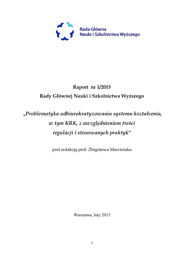 Raport nr 1/2015 Rady Głównej Nauki i Szkolnictwa Wyższego „Problematyka odbiurokratyzowania systemu kształcenia, w tym KRK, z uwzględnieniem treści regulacji i stosowanych praktyk” pod redakcją prof. Zbigniewa Marciniaka Warszawa, luty 2015 1 Spis treści Słowo wstępne Przewodniczącego Rady Głównej Nauki i Szkolnictwa Wyższego ........ 3 Wstęp .............................................................................................................................. 4 1. Funkcjonowanie uczelnianych systemów zapewniania jakości ............................... 5 2. Zasady i praktyka działania Polskiej Komisji Akredytacyjnej ................................. 10 3. Problemy wdrażania Krajowych Ram Kwalifikacji .................................................... 20 4. Złożonośd prawa o szkolnictwie wyższym jako czynnik generujący niepewnośd i ryzyko, wiodące do biurokracji ................................................................................... 24 5. Wnioski koocowe ...................................................................................................... 25 2 Słowo wstępne Przewodniczącego Rady Głównej Nauki i Szkolnictwa Wyższego Ze sprawozdania Przewodniczącego Rady Głównej Nauki i Szkolnictwa Wyższego z działalności Rady Głównej Nauki i Szkolnictwa Wyższego w roku 2014, 31 grudnia 2014 r. (…) Kadencja 2014-2017 otwiera nowy, pionierski okres w działalności Rady jako organu, prowadzonej nieprzerwanie od 1982 roku. Po zmianach z 2011 r. w ustawie Prawo o szkolnictwie wyższym, z początkiem roku sprawozdawczego Rada zyskała swą nową tożsamość. Nastąpiło to w następstwie zmiany sposobu wyboru członków Rady. Wybór poszczególnych grup jej członków w określonej liczbie, po raz pierwszy na tę kadencję ustawodawca powierzył podmiotom reprezentatywnym, działającym na podstawie umocowania rangi ustawowej na szczeblu centralnym w systemie nauki i szkolnictwa wyższego oraz podobnie umocowanym organizacjom pracodawców. Jednocześnie nastąpiła redukcja ustawowej liczby jej członków do 32 osób. Jej zadania ustawowe uległy pewnym zmianom w wyniku kolejnych nowelizacji ustawy z 2011 r. i 2014 r. – przy zachowaniu jednak charakteru Rady jako organu o zadaniach opiniodawczych, a także opiniotwórczych ze względu na jej niezależność i upoważnienie do podejmowania działań z własnej inicjatywy.(…) Elementami organizacji prac Rady są działania jej organów wewnętrznych, a więc komisji stałych realizujących swe zadania opiniodawcze oraz – tu pojawia się nowy element – zespołów roboczych, działających z udziałem zaproszonych ekspertów zewnętrznych, powoływanych m.in. do opracowywania i przedkładania Radzie raportów tematycznych o charakterze specjalistycznym. Raporty te, opracowywane z własnej inicjatywy Rady, po ich przyjęciu, będą publikowane w wersji elektronicznej i przedstawiane zainteresowanym ministrom, oraz innym organom, organizacjom i instytucjom (…) Z uchwały Rady Głównej Nauki i Szkolnictwa Wyższego z dnia 12 lutego 2015 r. w sprawie rocznego planu prac programowych Rady na 2015 r. oraz zakresu działania zespołów roboczych (…) Rada z własnej inicjatywy opracuje i przedstawi swoje propozycje i opinie w raporcie zawierającym wyniki prac powołanego w 2014 r. przez Radę zespołu działającego pod przewodnictwem prof. Z. Marciniaka, wiceprzewodniczącego Rady, w zakresie problematyki odbiurokratyzowania systemu kształcenia, w tym KRK z uwzględnieniem treści regulacji i stosowanych praktyk (…) Przedkładamy ten raport Ministrowi Nauki i Szkolnictwa Wyższego oraz innym organom, z którymi Rada Główna współdziała, a także do wykorzystania w pracach konferencji rektorów, pozostałych instytucji partnerskich Rady, Polskiej Komisji Akredytacyjnej i organów szkół wyższych oraz do wiadomości społeczności akademickiej. Prof. Jerzy Woźnicki 3 Wstęp Jednym z zadań Rady Głównej Nauki i Szkolnictwa Wyższego, jako wybieralnego organu przedstawicielskiego, jest reagowanie na płynące ze środowiska akademickiego sygnały dotyczące funkcjonowania systemu nauki i szkolnictwa wyższego. W ciągu pierwszego roku bieżącej kadencji Rada otrzymała wiele sygnałów sugerujących narastanie biurokracji w polskich uczelniach. Napływały one do członków Rady przede wszystkim z ich własnych środowisk. Pojawiło się także kilka publikacji, zarówno w prasie środowiskowej, jak i w prasie codziennej, których autorzy podnosili kwestię rosnących biurokratycznych obciążeń pracowników akademickich. Głosy te dotyczyły biurokracji zarówno w procesie uprawiania nauki, jak i w procesie kształcenia. Sygnały dotyczące zjawiska biurokracji w procesie kształcenia charakteryzowały się dużą zbieżnością obserwacji, co skłoniło Radę do powołania specjalnego Zespołu Roboczego, do ich przeanalizowania. W skład Zespołu powołano następujących członków Rady: prof. Zbigniew Marciniak - przewodniczący, Zuzanna Hazubska, prof. Edward Jezierski, dr Andrzej Kiebała, Dawid Kolenda, prof. Marcin Krawczyński, prof. Paweł Lampe, Piotr Pokorny, dr Anna Potocka, prof. Małgorzata Sekułowicz, prof. Jan Szambelańczyk, prof. Barbara Tuchańska, prof. Janusz Żmija. Ponadto, do Zespołu zaproszono dr Agnieszkę Chłoń-Domińczak, prof. Ewę Chmielecką, dr. Przemysława Korytkowskiego i prof. Pawła Stępnia jako społecznych doradców Rady. Rada odbyła w dniu 10 kwietnia 2014 r. debatę na temat zjawiska biurokracji w procesie kształcenia. Poprzedzona ona została prezentacją prof. Pawła Stępnia pt. Przeciwdziałanie biurokratyzacji na przykładzie wewnętrznego systemu zapewniania jakości kształcenia na Uniwersytecie Warszawskim. Następnie Zespół odbywał regularne spotkania w rytmie posiedzeń Rady. Na listopadowym posiedzeniu gościem Zespołu była Wiceprzewodnicząca Polskiej Komisji Akredytacyjnej, pani profesor Danuta St