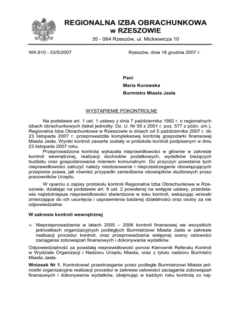 REGIONALNA IZBA OBRACHUNKOWA w RZESZOWIE 35 - 064 Rzeszów, ul. Mickiewicza 10 WK.610 - 53/5/2007 Rzeszów, dnia 18 grudnia 2007 r. Pani Maria Kurowska Burmistrz Miasta Jasła WYSTĄPIENIE POKONTROLNE Na podstawie art. 1 ust. 1 ustawy z dnia 7 października 1992 r. o regionalnych izbach obrachunkowych (tekst jednolity: Dz. U. Nr 55 z 2001 r. poz. 577 z późn. zm.), Regionalna Izba Obrachunkowa w Rzeszowie w dniach od 5 października 2007 r. do 23 listopada 2007 r. przeprowadziła kompleksową kontrolę gospodarki finansowej Miasta Jasła. Wyniki kontroli zawarte zostały w protokole kontroli podpisanym w dniu 23 listopada 2007 roku. Przeprowadzona kontrola wykazała nieprawidłowości w głównie w zakresie kontroli wewnętrznej, realizacji dochodów podatkowych, wydatków bieżących budżetu oraz gospodarowania mieniem komunalnym. Do przyczyn powstania tych nieprawidłowości zaliczyć należy niestosowanie i nieprzestrzeganie obowiązujących przepisów prawa, jak również przypadki zaniedbania obowiązków służbowych przez pracowników Urzędu. W oparciu o zapisy protokołu kontroli Regionalna Izba Obrachunkowa w Rzeszowie, działając na podstawie art. 9 ust. 2 powołanej na wstępie ustawy, przedstawia najistotniejsze nieprawidłowości stwierdzone w toku kontroli, wskazując wnioski zmierzające do ich usunięcia i usprawnienia badanej działalności oraz osoby za nie odpowiedzialne. W zakresie kontroli wewnętrznej • Nieprzeprowadzenie w latach 2005 – 2006 kontroli finansowej we wszystkich jednostkach organizacyjnych podległych Burmistrzowi Miasta Jasła w zakresie realizacji procedur kontroli, oraz przeprowadzania wstępnej oceny celowości zaciągania zobowiązań finansowych i dokonywania wydatków. Odpowiedzialność za powstałą nieprawidłowość ponosi Kierownik Referatu Kontroli w Wydziale Organizacji i Nadzoru Urzędu Miasta, oraz z tytułu nadzoru Burmistrz Miasta Jasła. Wniosek Nr 1. Kontrolować przestrzeganie przez podległe Burmistrzowi Miasta jednostki organizacyjne realizacji procedur w zakresie celowości zaciągania zobowiązań finansowych i dokonywania wydatków, obejmując w każdym roku kontrolą co naj- 2 mniej 5% wydatków tych jednostek, zgodnie z art. 187 ustawy z dnia 30 czerwca 2005 r. o finansach publicznych (Dz. U. Nr 249, poz. 2104 z późn. zm.). W zakresie podatkowych i niepodatkowych dochodów budżetu miasta • Niedokonywanie czynności sprawdzających przedkładanych do organu podatkowego deklaracji oraz informacji podatkowych, w podatku od nieruchomości od osób prawnych, w zakresie ustalenia terminowości ich złożenia, formalnej poprawności i stanu faktycznego deklarowanych powierzchni. Odpowiedzialność za powstałą nieprawidłowość ponoszą: Inspektor Referatu Podatków i Opłat Lokalnych, oraz z tytułu nadzoru Kierownik tego Referatu. Wniosek Nr 2. Dokonywać czynności sprawdzających otrzymanych deklaracji oraz informacji podatkowych w celu stwierdzenia terminowości ich składania, formalnej poprawności i ustalania stanu faktycznego w zakresie niezbędnych do stwierdzenia zgodności z przedstawionymi dokumentami zgodnie z art. 272 ustawy z dnia 29 sierpnia 1997 r. Ordynacja podatkowa (tekst jednolity: Dz. U. z 2005 r. Nr 8, poz. 60 z późn. zm.). • Niezgodne z zasadami egzekucji administracyjnej podejmowanie czynności zmierzających do zastosowania środków egzekucyjnych w stosunku do grupy podatników podatku rolnego, od nieruchomości, i podatku od środków transportowych pozostających w zwłoce z zapłatą należnych gminie podatków. Odpowiedzialność za powstałe nieprawidłowości ponoszą Inspektorzy Referatu Podatków i Opłat Lokalnych, oraz z tytułu nadzoru Kierownik tego Referatu. Wniosek Nr 3. W stosunku do podatników pozostających w zwłoce z zapłatą należnych miastu podatków podejmować czynności zmierzające do wszczęcia postępowania egzekucyjnego wynikającego z przepisów art. 3a i art. 15 §1 ustawy z dnia 17 czerwca 1966 r. o postępowaniu egzekucyjnym w administracji (t. j.: Dz. U. z 2005 r. Nr 229, poz. 1954 z późn. zm.), oraz § 3 i § 5 ust. 1 rozporządzenia Ministra Finansów z dnia 22 listopada 2001 r. o wykonaniu niektórych przepisów ustawy o postępowaniu egzekucyjnym w administracji (Dz. U. Nr 137, poz. 1541 z późn. zm.). • Nieegzekwowanie od inkasentów opłaty targowej, terminowych wpłat do budżetu miasta pobranej opłaty targowej. Odpowiedzialność za nieprawidłowość ponosi Inspektor prowadzący sprawy rozliczania targowisk. Wniosek Nr 4. Egzekwować od inkasentów opłaty targowej obowiązek wpłaty do budżetu miasta zainkasowanych kwot opłaty targowej, zgodnie z terminami określonymi w umowie o inkaso. • Nieujęcie w ewidencji księgowej 2006 roku dochodów z tytułu opłaty targowej uzyskanych za grudzień 2006 roku. Odpowiedzialność za nieprawidłowość ponosi Inspektor prowadzący ewidencję dochodów w Urzędzie Miasta Jasła. Wniosek Nr 5. W księgach rachunkowych ujmować wszystkie osiągnięte przychody i koszty związane z tymi przychodami, zgodnie z art. 6 ust. 1 ustawy z dnia 29 wrze- 3 śnia 1994 r. o rachunkowości (tekst jednolity: Dz. U. z 2002 r. Nr 76, poz.694 z późn. zm.). W zakresie wydatków bieżących budżetu • • Nieprawidłowe ujęcie kwoty korekty naliczonego odpisu na zakładowy fundusz świadczeń socjalnych za 2005 r. w podstawie naliczenia odpisu na 2006 rok. Nieprzekazanie na rachunek bankowy zakładowego funduszu świadczeń socjalnych w terminie do dnia 31 maja 2006 roku kwoty stanowiącej co najmniej 75% równowartości odpisu naliczonego na ten rok. Odpowiedzialność za powstałe nieprawidłowości ponosi Inspektor ds. kadr i kontroli UM Jasła, oraz z tytułu nadzoru Skarbnik Miasta. Wniosek Nr 6. Korekty odpisów na zakładowy fundusz świadczeń socjalnych uwzględniać w roku którego dotyczą, stosownie do § 1 rozporządzenia ministra pracy i polityki socjalnej z dnia 14 marca 1994 r. w sprawie sp