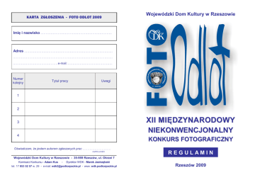 KARTA ZGŁOSZENIA - FOTO ODLOT 2009 Wojewódzki Dom Kultury w Rzeszowie Imię i nazwisko . . . . . . . . . . . . . . . . . . . . . . . . . . . . . . . . . . . . . . . . . . . . . . . . . . . . . . . . . . . . . . . . . . . . . . Adres . . . . . . . . . . . . . . . . . . . . . . . . . . . . . . . . . . . . . . . . . . . . . . . . . . . . . . . . . . . . . . . . . . . . . . . . . . . . . . . . . . . . . . . .................................................................................................. ............................................ Numer kolejny e-mail: . . . . . . . . . . . . . . . . . . . . . . . . . . . . . . . . . . . . . . . . . . . . Tytuł pracy Uwagi 1 2 XII MIĘDZYNARODOWY NIEKONWENCJONALNY 3 4 Oświadczam, Ŝe jestem autorem zgłaszanych prac KONKURS FOTOGRAFICZNY ............................ czytelny podpis Wojewódzki Dom Kultury w Rzeszowie - 35-959 Rzeszów, ul. Okrzei 7 Komisarz Konkursu - Adam Kus - Dyrektor WDK - Marek Jastrzębski tel. 17 853 52 57 w. 29 - e-mail: [email protected] - www. wdk.podkarpackie.pl REGULAMIN Rzeszów 2009 Zapraszamy do udziału w XII Międzynarodowym Niekonwencjonalnym Konkursie Fotograficznym „Foto Odlot” organizowanym pod patronatem Międzynarodowej Federacji Sztuki Fotograficznej FIAP - Nr 2009/084, Marszałka Województwa Podkarpackiego, Fotoklubu RP i Fundacji „Fotografia dla Przyszłości” patronat medialny - FOTOGRAFIA CYFROWA - www.foto.com.pl - SZAFA - www.szafa.prezentacje.pl - Rzeszowski portal informacyjny - www.resinet.pl TEMAT „Odlot” - to funkcjonujące w młodzieŜowym slangu określenie stanu polegającego na oderwaniu się od rzeczywistości, ogólnie przyjętych schematów, norm i utartych wzorców. Tematem konkursu jest jego fotograficzna interpretacja. NAGRODY Laureaci Konkursu otrzymają medale i wyróŜnienia FIAP, pamiątkowe plakiety, dyplomy, nagrody i wyróŜnienia pienięŜne oraz nagrody specjalne. PRAWA I OBOWIĄZKI ORGANIZATORÓW 1. Wyboru prac na wystawę pokonkursową oraz podziału nagród dokona Jury powołane przez organizatorów. 2. Organizatorzy zastrzegają sobie prawo do bezpłatnej reprodukcji i publikacji zdjęć w katalogu oraz w środkach masowego przekazu w celu informacji o wystawie pokonkursowej. 3. Organizatorzy mają prawo do wyłączenia spod obrad Jury prac nie spełniających warunków regulaminu. TERMINARZ WARUNKI UCZESTNICTWA 1. Nadsyłanie prac - do 10 sierpnia 2009 r. 1. Konkurs dostępny jest dla wszystkich fotografujących. 2. Rozstrzygnięcie konkursu i powiadomienie uczestników o jego wynikach - do 15 września 2009 r. 2. KaŜdy autor moŜe zgłosić na konkurs do 4 najbardziej „odlotowych” prac czarno-białych lub barwnych, wykonanych w dowolnej technice. W zgłoszonych pracach mogą znajdować się dwa zestawy (do 3 zdjęć w kaŜdym) wyraźnie oznaczone, które będą traktowane jako prace pojedyncze. 3. Format prac - od 20 x 30 cm do 50 x 70 cm. OBOWIĄZKI AUTORÓW 1. KaŜdą pracę naleŜy czytelnie opisać na odwrocie podając: - imię i nazwisko oraz dokładny adres autora, - tytuł pracy i numer kolejny zgłaszanej pracy. 2. Do prac powinna być dołączona wypełniona czytelnie karta zgłoszenia wraz z oświadczeniem dotyczącym autorstwa prac. 3. Jeśli to moŜliwe prosimy równieŜ o załączenie wersji cyfrowych zgłaszanych do konkursu zdjęć. 4. Prace naleŜy przesłać w sztywnym opakowaniu na adres: Wojewódzki Dom Kultury, ul. S. Okrzei 7, 35-959 Rzeszów z dopiskiem: „FOTO ODLOT”. 3. WernisaŜ wystawy pokonkursowej oraz rozdanie nagród odbędzie się 3 października 2009 r. w Galerii WDK Rzeszów. UWAGI 1. Udział w Konkursie jest płatny. Opłata dla uczestników z Polski wynosi 25 zł - (m.in. koszty związane z korespondencją i zwrotem przesyłek) Konto: WDK Rzeszów - Kredyt Bank S.A., Filia nr 3 w Rzeszowie, Nr: 42 1500 1100 1216 5000 961 30000 2. Wszystkie nadesłane prace zostaną zwrócone ich autorom najpóźniej do 10 lutego 2010 r. - przewidujemy dodatkowe ekspozycje wystawy. 3. KaŜdy uczestnik wystawy pokonkursowej otrzyma pamiątkowy katalog. 4. Organizatorzy nie biorą odpowiedzialności za ewentualne uszkodzenia prac w transporcie pocztowym. 5. Interpretację tematu pozostawiamy pomysłowości autorów. 6. Nadesłanie prac jest równoznaczne z akceptacją warunków regulaminu.