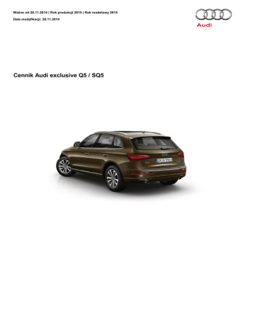 Ważne od 28.11.2014 | Rok produkcji 2015 | Rok modelowy 2015 Data modyfikacji: 28.11.2014 Cennik Audi exclusive Q5 / SQ5 Ważne od 28.11.2014 | Rok produkcji 2015 | Rok modelowy 2015 Data modyfikacji: 28.11.2014 Audi exclusive Q5 / SQ5 Spis treści Audi Exclusive Q5. Lakiery i tapicerki Tapicerki S line Lakiery metaliczne i perłowe dla pakietu S line Tapicerki Audi exclusive line Lakiery specjalne Audi Exclusive Q5. Pakiety stylistyczne Pakiet sportowy S line Pakiet stylistyczny S line Exterieur Pakiet stylistyczny Audi exclusive line Audi Exclusive Q5/SQ5. Pakiety stylistyczne wnętrza Audi Exclusive Q5/SQ5. Opcje wyposażenia Aplikacje dekoracyjne Kierownice / Gałki dźwigni skrzyni biegów Wnętrze Stylistyka zewnętrzna. Pakiet Offroad Audi Exclusive Q5/SQ5. Obręcze 2 Ważne od 28.11.2014 | Rok produkcji 2015 | Rok modelowy 2015 Data modyfikacji: 28.11.2014 Audi exclusive Q5 / SQ5 tkanino-skóra Sprint N7V Alcantara N7K skóra Feinnappa N2R Lakiery i tapicerki QE - siedzenia, deska rozdzielcza, wykładzina i podsufitka w kolorze czarnym - - + QF - siedzenia w kolorze czarnym ze srebrnym szwem deska rozdzielcza, wykładzina i podsufitka w kolorze czarnym + + - Cena z VAT w PLN Kod i opis lakieru i tapicerki Tapicerki S line (WQS) Lakiery metaliczne i perłowe dla pakietu sportowego S line (WQS) 6Y6Y - Szary Daytona perłowy Cena w połączeniu z pakietem sportowym S line (WQS) dla wersji do 2 litrów pojemności: 3 890 Cena w połączeniu z pakietem sportowym S line (WQS) dla wersji powyżej 2 litrów pojemności: 4 470 W pozostałych przypadkach obowiązuje cena lakieru specjalnego Tapicerki Audi exclusive line (WQK) QX - siedzenia w kolorze czarny/brązowy Cognac deska rozdzielcza, wykładzina i podsufitka w kolorze czarnym UH - siedzenia w kolorze czarny/szary Cloudy deska rozdzielcza, wykładzina i podsufitka w kolorze czarnym UA - siedzenia w kolorze czarny/biały Alabaster deska rozdzielcza, wykładzina i podsufitka w kolorze czarnym Lakiery specjalne Oferta lakierów specjalnych Audi exclusive pozwala wybrać lakier odpowiadający stylowi i upodobaniom użytkownika. Wyboru można dokonać spośród: - lakierów oferowanych przez Quattro GmbH - lakierów aktualnie używanych w innych modelach Audi - lakierów używanych w modelach Audi w przeszłości - lakierów używanych w innych markach samochodów pod warunkiem dostarczenia opisu wraz z kodem fabrycznym wybranego lakieru Q0Q0 Kod lakieru specjalnego Cena lakieru specjalnego dla wersji do 2 litrów pojemności: 11 660 Cena lakieru specjalnego dla wersji powyżej 2 litrów pojemności: 13 410 3 Ważne od 28.11.2014 | Rok produkcji 2015 | Rok modelowy 2015 Data modyfikacji: 28.11.2014 Audi exclusive Q5 / SQ5 Opis wyposażenia Kod Cena z VAT w PLN 2.0 TFSI quattro 3.0 TFSI quattro 2.0 TDI quattro 3.0 TDI quattro SQ5 Pakiety stylistyczne Pakiet sportowy S line Niedostępny dla modelu SQ5 ! WQS 12 140 • - • - - 12 910 - • - • - 4 330 • - • - - 4 980 - • - • - 6 800 • - • - - 7 820 - • - • - 10 930 • - • - - 12 580 - • - • - – 5-ramienne obręcze ze stopu metali lekkich 8J x 19 opony 235/55 R19 (PQR) – zawieszenie sportowe S line (1BV) – logo S line na przednich błotnikach – logo S line na listwach progowych drzwi z powłoką ochronną górnej krawędzi zderzaka ze stali szlachetnej (PGL) – wnętrze, deska rozdzielcza i podsufitka tkaninowa w kolorze czarnym – siedzenia sportowe z przodu z tłoczeniem S line w oparciach i elektryczną regulacją podparcia odcinka lędźwiowego kręgosłupa (PS1/7P1) – aplikacje dekoracyjne z matowego aluminium (5TG) – 3-ramienna sportowa (2PV) Feinnappa (N2R) tylko w połączeniu z podparciami obszytymi skórą (7HB)! Do pakietu S line należy wybrać odpowiednią tapicerkę siedzeń: ► tkanino-skóra Sprint ze srebrnym szwem (QF) ► Alcantara perforowana ze srebrnym szwem (QF) ► skóra Feinnappa z czarnym szwem (QE) N7V N7K N2R Pakiet sportowy S line można łączyć z wybranymi tapicerkami Audi exclusive (pakiety stylistyczne PY*). Tłoczenie S line w oparciach siedzeń zostaje zachowane! Przy kombinacji WQS + wybrana tapicerka S line + pakiet stylistyczny PY* tapicerka S line bez dopłaty ! Do pakietu S line należy wybrać odpowiednią kierownicę: ► wielofunkcyjna sportowa ► wielofunkcyjna sportowa dla skrzyni automatycznej 1XW 1XX 870 • - • - - 1 000 - • - • - 1 630 • - • - - 1 870 - • - • - 1 390 • - • - - 1 590 - • - • - 2 140 • - • - - 2 460 - • - • - 1 990 • - • - - 2 290 - • - • - 5 480 • - • - - 6 310 - • - • - 4 500 • - • - - 5 170 - • - • - 5 030 • - • - - 5 790 - • - • - 0 • - • - - 0 - • - • - 1 690 • - • - - 1 940 - • - • - 3 060 • - • - - 3 520 - • - • - Pakiet S line można zamiennie wyposażyć w następujące elementy: ► wielofunkcyjna sportowa ze spłaszczonym wieńcem 2PF ► wielofunkcyjna sportowa ze spłaszczonym wieńcem dla skrzyni automatycznej 2PK ► aplikacje dekoracyjne Piano (czerń fortepianowa) 5TL ► aplikacje aluminium/czarne drewno Beaufort Audi exclusive 5TB ► aplikacje dekoracyjne z drewna Audi exclusive ► Audi drive select z regulacją tłumienia amortyzatorów (w miejsce zawieszenia sportowego S line) ► 10-ramienne obręcze ze stopu metali lekkich 8J x 19, polerowane na połysk, opony 235/55 R 19 ► 10-ramienne obręcze ze stopu metali lekkich 8J x 19, w tonacji tytanu, opony 235/55 R 19 ► 10-ramienne obręcze ze stopu metali lekkich 8,5J x 20, opony 255/45 R 20 YTA 2H1/1BL PQN PQ5 PQ1 4 Ważne od 28.11.2014 | Rok produkcji 2015 | Rok modelowy 2015 Data modyfikacji: 28.11.2014 Audi exclusive Q5 / SQ5 Opis wyposażenia Kod Cena z VAT w PLN 2.0 TFSI quattro 3.0 TFSI quattro 2.0 TDI quattro 3.0 TDI quattro SQ5 Pakiety stylistyczne ► 5-ramienne obręcze ze stopu metali lekkich 8,5J x 20, opony 255/45 R20 PQ6 3 060 • - • - - 3 520 - • - • - 3 600 • - • - - 4 140 - • - • - 0 • - •