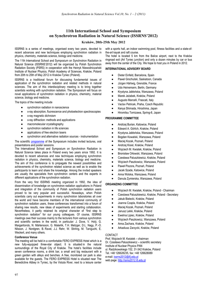Synchrotron Radiation in Natural Science Vol.10, No. 1 – 2 (2011) 11th International School and Symposium on Synchrotron Radiation in Natural Science (ISSRNS’2012) Kraków, 20th-25th May 2012 ISSRNS is a series of meetings, organised every two years, devoted to recent advances and new techniques employing synchrotron radiation in physics, chemistry, materials science, biology and medicine. The 11th International School and Symposium on Synchrotron Radiation in Natural Science (ISSRNS’2012) will be organized by Polish Synchrotron Radiation Society (PSRS) in cooperation with the Henryk Niewodniczański Institute of Nuclear Physics, Polish Academy of Sciences, Kraków, Poland from 20th to 25th of May 2012 in Kraków-Tyniec (Poland). ISSRNS is a traditional forum for discussing fundamental issues of application of the synchrotron radiation and related methods in natural sciences. The aim of this interdisciplinary meeting is to bring together scientists working with synchrotron radiation. The Symposium will focus on novel applications of synchrotron radiation in physics, chemistry, material science, biology and medicine. The topics of the meeting include synchrotron radiation in nanoscience x-ray absorption, fluorescence and photoelectron spectroscopies x-ray magnetic dichroism x-ray diffraction: methods and applications macromolecular crystallography synchrotron radiation in life sciences applications of free electron lasers synchrotron and alternative radiation sources - instrumentation The scientific programme of the Symposium includes invited lectures, oral presentations and poster sessions. The International School and Symposium on Synchrotron Radiation in Natural Science takes place in Poland every two years since 1992. It is devoted to recent advances and new techniques employing synchrotron radiation in physics, chemistry, materials science, biology and medicine. The aim of this conference is to propagate the newest possibilities and achievements of the synchrotron related science as well as to enable the participants to learn and share the knowledge. Among the invited speakers are usually the specialists from synchrotron centers and the experts in different applications of the synchrotron radiation. From the very first ISSRNS meeting organized in 1992, the idea of dissemination of knowledge on synchrotron radiation applications in Poland and integration of the community of Polish synchrotron radiation users proved to be very popular and successful. Nowadays, when Polish scientists carry out experiments in many synchrotron laboratories all over the world and have become members of the international community of synchrotron radiation users, these conferences transformed into a forum of sharing new results, new ideas of experiments and starting collaboration. Nevertheless, it partly retained its original character of “first step to synchrotron radiation” for our young colleagues. Of course, ISSRNS meetings owe their success mainly to the lecturers from various synchrotron and scientific centers in the world, in particular: J. Dove, V. Holý, G. Margaritondo, N. Mårtensson, G. Materlik, T.H. Metzger, D.L. Nagy, P.-O. Nilsson, J. Nordgren, B. Ravel, J.J. Rehr, W. Stirling, M. Taniguchi, E. Weckert, and many others. Conference Venue The meeting will be held in a comfortable FERO EXPRESS Hotel which is a new fully-equipped three-star object. It is situated in the natural surroundings of the Royal City of Kraków. The hotel’s facilities include seven conference rooms, a drink bar, a small and big restaurant with a green garden with alleys and benches. A free, monitored car park is also available for the guests. The FERO EXPRESS Hotel is situated near The Benedictine Abbey in Tyniec, by the Vistula River, next to a leisure center 97 with a sports hall, an indoor swimming pool, fitness facilities and a state-ofthe-art kayak and raft course. The hotel is located 5 km from the Balice airport, next to the Kraków ringroad exit (A4 Tyniec junction) and only a dozen minutes by car or bus away from the center of the City. We hope to host you in Poland in 2012. INTERNATIONAL ADVISORY BOARD Dieter Einfeld, Barcelona, Spain Pawel Grochulski, Saskatoon, Canada Jürgen Härtwig, Grenoble, France Udo Heinemann, Berlin, Germany Krystyna Jabłońska, Warszawa, Poland Marek Jeżabek, Kraków, Poland Augusto Marcelli, Frascati, Italy Vaclav Petricek, Praha, Czech Republic Kenya Shimada, Hiroshima, Japan Hiromitsu Tomizawa, Spring-8, Japan PROGRAMME COMMITTEE Andrzej Burian, Katowice, Poland Edward A. Görlich, Kraków, Poland Krystyna Jabłońska, Warszawa, Poland Bogdan Kowalski, Warszawa, Poland Maciej Kozak, Poznań, Poland Andrzej Kisiel, Kraków, Poland Wojciech M. Kwiatek, Kraków, Poland Bronisław Orłowski, Warszawa, Poland Czesława Paluszkiewicz, Kraków, Poland Wojciech Paszkowicz, Warszawa, Poland Paweł Piszora, Poznań, Poland Jacek Szade, Katowice, Poland Anna Wolska, Warszawa, Poland Danuta Zymierska, Warszawa, Poland ORGANIZING COMMITTEE Wojciech M. Kwiatek, Kraków, Poland - Chairman Czeslawa Paluszkiewicz, Kraków, Poland - Secretary Jakub Bielecki, Kraków, Poland Joanna Czapla, Kraków, Poland Maciej Kozak, Poznań, Poland Janusz Lekki, Kraków, Poland Ewelina Lipiec, Kraków, Poland Wojciech Paszkowicz, Warszawa, Poland Anna Zachara, Kraków, Poland Arkadiusz Zarzycki, Kraków, Poland CONTACT Prof. Wojciech M. Kwiatek – chairman Dr. Czesława Paluszkiewicz – scientific secretary Institute of Nuclear Physics PAN ul. Radzikowskiego 152, 31-342 Kraków, Poland Tel. +48 126628235, fax: +48 126628089 e-mail: [email protected] web page: http://isrns2012.ifj.edu.pl