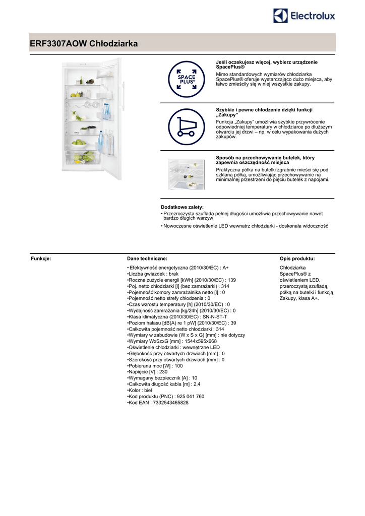 ERF3307AOW Chłodziarka Jeśli oczekujesz więcej, wybierz urządzenie SpacePlus® Mimo standardowych wymiarów chłodziarka SpacePlus® oferuje wystarczająco dużo miejsca, aby łatwo zmieściły się w niej wszystkie zakupy. Szybkie i pewne chłodzenie dzięki funkcji „Zakupy” Funkcja „Zakupy” umożliwia szybkie przywrócenie odpowiedniej temperatury w chłodziarce po dłuższym otwarciu jej drzwi – np. w celu wypakowania dużych zakupów. Sposób na przechowywanie butelek, który zapewnia oszczędność miejsca Praktyczna półka na butelki zgrabnie mieści się pod szklaną półką, umożliwiając przechowywanie na minimalnej przestrzeni do pięciu butelek z napojami. Dodatkowe zalety: • Przezroczysta szuflada pełnej długości umożliwia przechowywanie nawet bardzo długich warzyw • Nowoczesne oświetlenie LED wewnatrz chłodziarki - doskonała widoczność Funkcje: Dane techniczne: Opis produktu: • Efektywność energetyczna (2010/30/EC) : A+ •Liczba gwiazdek : brak •Roczne zużycie energii [kWh] (2010/30/EC) : 139 •Poj. netto chłodziarki [l] (bez zamrażarki) : 314 •Pojemność komory zamrażalnika netto [l] : 0 •Pojemność netto strefy chłodzenia : 0 •Czas wzrostu temperatury [h] (2010/30/EC) : 0 •Wydajność zamrażania [kg/24h] (2010/30/EC) : 0 •Klasa klimatyczna (2010/30/EC) : SN-N-ST-T •Poziom hałasu [dB(A) re 1 pW] (2010/30/EC) : 39 •Całkowita pojemność netto chłodziarki : 314 •Wymiary w zabudowie (W x S x G) [mm] : nie dotyczy •Wymiary WxSzxG [mm] : 1544x595x668 •Oświetlenie chłodziarki : wewnętrzne LED •Głębokość przy otwartych drzwiach [mm] : 0 •Szerokość przy otwartych drzwiach [mm] : 0 •Pobierana moc [W] : 100 •Napięcie [V] : 230 •Wymagany bezpiecznik [A] : 10 •Całkowita długość kabla [m] : 2,4 •Kolor : biel •Kod produktu (PNC) : 925 041 760 •Kod EAN : 7332543465828 Chłodziarka SpacePlus® z oświetleniem LED, przeroczystą szufladą, półką na butelki i funkcją Zakupy, klasa A+.