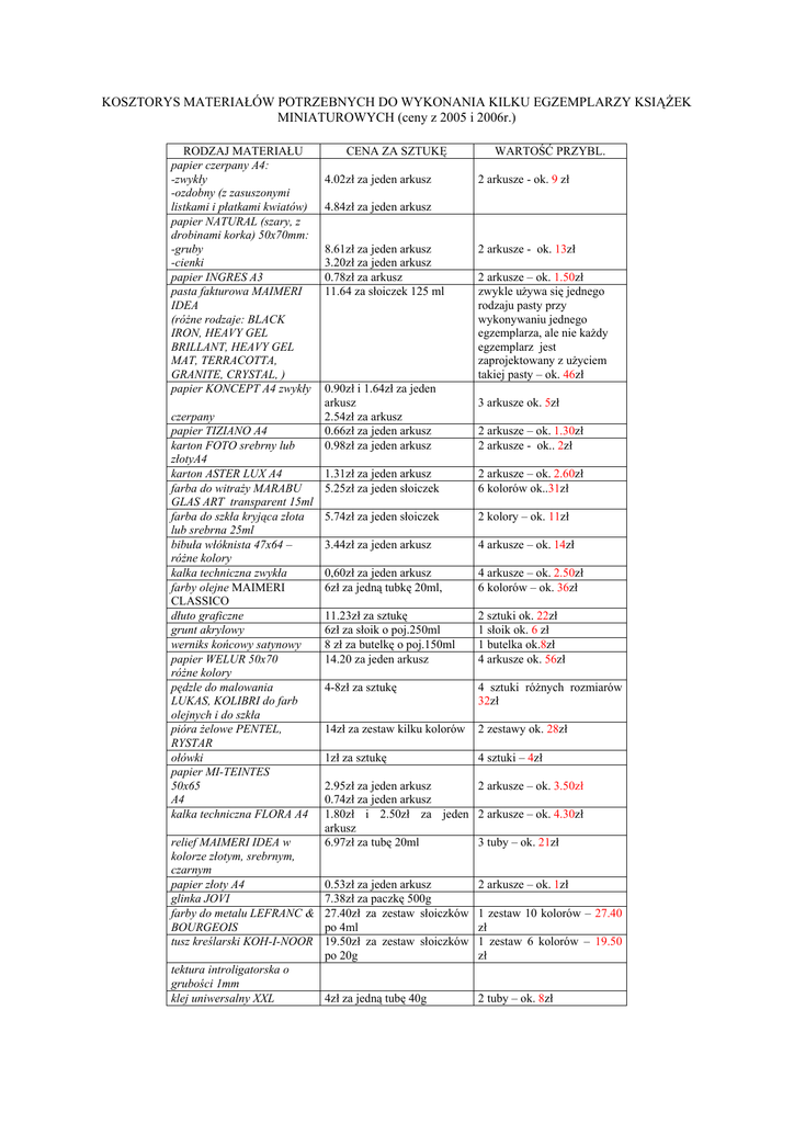 KOSZTORYS MATERIAŁÓW POTRZEBNYCH DO WYKONANIA KILKU EGZEMPLARZY KSIĄŻEK MINIATUROWYCH (ceny z 2005 i 2006r.) RODZAJ MATERIAŁU papier czerpany A4: -zwykły -ozdobny (z zasuszonymi listkami i płatkami kwiatów) papier NATURAL (szary, z drobinami korka) 50x70mm: -gruby -cienki papier INGRES A3 pasta fakturowa MAIMERI IDEA (różne rodzaje: BLACK IRON, HEAVY GEL BRILLANT, HEAVY GEL MAT, TERRACOTTA, GRANITE, CRYSTAL, ) papier KONCEPT A4 zwykły czerpany papier TIZIANO A4 karton FOTO srebrny lub złotyA4 karton ASTER LUX A4 farba do witraży MARABU GLAS ART transparent 15ml farba do szkła kryjąca złota lub srebrna 25ml bibuła włóknista 47x64 – różne kolory kalka techniczna zwykła farby olejne MAIMERI CLASSICO dłuto graficzne grunt akrylowy werniks końcowy satynowy papier WELUR 50x70 różne kolory pędzle do malowania LUKAS, KOLIBRI do farb olejnych i do szkła pióra żelowe PENTEL, RYSTAR ołówki papier MI-TEINTES 50x65 A4 kalka techniczna FLORA A4 relief MAIMERI IDEA w kolorze złotym, srebrnym, czarnym papier złoty A4 glinka JOVI farby do metalu LEFRANC & BOURGEOIS tusz kreślarski KOH-I-NOOR tektura introligatorska o grubości 1mm klej uniwersalny XXL CENA ZA SZTUKĘ 4.02zł za jeden arkusz WARTOŚĆ PRZYBL. 2 arkusze - ok. 9 zł 4.84zł za jeden arkusz 8.61zł za jeden arkusz 3.20zł za jeden arkusz 0.78zł za arkusz 11.64 za słoiczek 125 ml 0.90zł i 1.64zł za jeden arkusz 2.54zł za arkusz 0.66zł za jeden arkusz 0.98zł za jeden arkusz 2 arkusze - ok. 13zł 2 arkusze – ok. 1.50zł zwykle używa się jednego rodzaju pasty przy wykonywaniu jednego egzemplarza, ale nie każdy egzemplarz jest zaprojektowany z użyciem takiej pasty – ok. 46zł 3 arkusze ok. 5zł 2 arkusze – ok. 1.30zł 2 arkusze - ok.. 2zł 1.31zł za jeden arkusz 5.25zł za jeden słoiczek 2 arkusze – ok. 2.60zł 6 kolorów ok..31zł 5.74zł za jeden słoiczek 2 kolory – ok. 11zł 3.44zł za jeden arkusz 4 arkusze – ok. 14zł 0,60zł za jeden arkusz 6zł za jedną tubkę 20ml, 4 arkusze – ok. 2.50zł 6 kolorów – ok. 36zł 11.23zł za sztukę 6zł za słoik o poj.250ml 8 zł za butelkę o poj.150ml 14.20 za jeden arkusz 2 sztuki ok. 22zł 1 słoik ok. 6 zł 1 butelka ok.8zł 4 arkusze ok. 56zł 4-8zł za sztukę 4 sztuki różnych rozmiarów 32zł 14zł za zestaw kilku kolorów 2 zestawy ok. 28zł 1zł za sztukę 4 sztuki – 4zł 2.95zł za jeden arkusz 2 arkusze – ok. 3.50zł 0.74zł za jeden arkusz 1.80zł i 2.50zł za jeden 2 arkusze – ok. 4.30zł arkusz 6.97zł za tubę 20ml 3 tuby – ok. 21zł 0.53zł za jeden arkusz 7.38zł za paczkę 500g 27.40zł za zestaw słoiczków po 4ml 19.50zł za zestaw słoiczków po 20g 2 arkusze – ok. 1zł 1 zestaw 10 kolorów – 27.40 zł 1 zestaw 6 kolorów – 19.50 zł 4zł za jedną tubę 40g 2 tuby – ok. 8zł