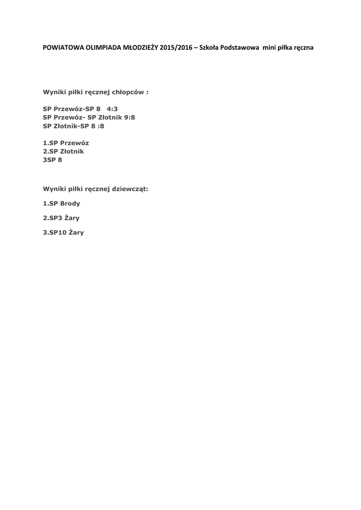 POWIATOWA OLIMPIADA MŁODZIEŻY 2015/2016 – Szkoła Podstawowa mini piłka ręczna Wyniki piłki ręcznej chłopców : SP Przewóz-SP 8 4:3 SP Przewóz- SP Złotnik 9:8 SP Złotnik-SP 8 :8 1.SP Przewóz 2.SP Złotnik 3SP 8 Wyniki piłki ręcznej dziewcząt: 1.SP Brody 2.SP3 Żary 3.SP10 Żary