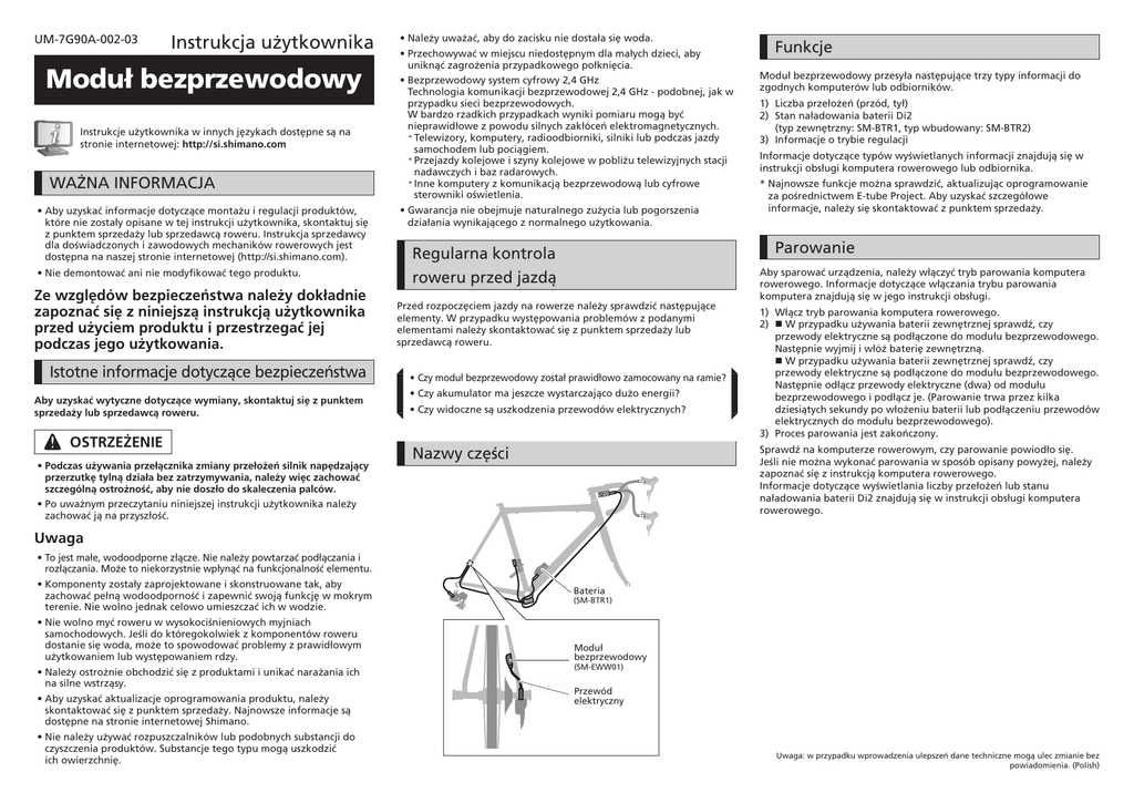 UM-7G90A-002-03 Instrukcja użytkownika Moduł bezprzewodowy Instrukcje użytkownika w innych językach dostępne są na stronie internetowej: http://si.shimano.com WAŻNA INFORMACJA • Aby uzyskać informacje dotyczące montażu i regulacji produktów, które nie zostały opisane w tej instrukcji użytkownika, skontaktuj się z punktem sprzedaży lub sprzedawcą roweru. Instrukcja sprzedawcy dla doświadczonych i zawodowych mechaników rowerowych jest dostępna na naszej stronie internetowej (http://si.shimano.com). • Nie demontować ani nie modyfikować tego produktu. Ze względów bezpieczeństwa należy dokładnie zapoznać się z niniejszą instrukcją użytkownika przed użyciem produktu i przestrzegać jej podczas jego użytkowania. Istotne informacje dotyczące bezpieczeństwa Aby uzyskać wytyczne dotyczące wymiany, skontaktuj się z punktem sprzedaży lub sprzedawcą roweru. OSTRZEŻENIE • Podczas używania przełącznika zmiany przełożeń silnik napędzający przerzutkę tylną działa bez zatrzymywania, należy więc zachować szczególną ostrożność, aby nie doszło do skaleczenia palców. • Należy uważać, aby do zacisku nie dostała się woda. • Przechowywać w miejscu niedostępnym dla małych dzieci, aby uniknąć zagrożenia przypadkowego połknięcia. • Bezprzewodowy system cyfrowy 2,4 GHz Technologia komunikacji bezprzewodowej 2,4 GHz - podobnej, jak w przypadku sieci bezprzewodowych. W bardzo rzadkich przypadkach wyniki pomiaru mogą być nieprawidłowe z powodu silnych zakłóceń elektromagnetycznych. * Telewizory, komputery, radioodbiorniki, silniki lub podczas jazdy samochodem lub pociągiem. * Przejazdy kolejowe i szyny kolejowe w pobliżu telewizyjnych stacji nadawczych i baz radarowych. * Inne komputery z komunikacją bezprzewodową lub cyfrowe sterowniki oświetlenia. • Gwarancja nie obejmuje naturalnego zużycia lub pogorszenia działania wynikającego z normalnego użytkowania. Funkcje Moduł bezprzewodowy przesyła następujące trzy typy informacji do zgodnych komputerów lub odbiorników. 1) Liczba przełożeń (przód, tył) 2) Stan naładowania baterii Di2 (typ zewnętrzny: SM-BTR1, typ wbudowany: SM-BTR2) 3) Informacje o trybie regulacji Informacje dotyczące typów wyświetlanych informacji znajdują się w instrukcji obsługi komputera rowerowego lub odbiornika. * Najnowsze funkcje można sprawdzić, aktualizując oprogramowanie za pośrednictwem E-tube Project. Aby uzyskać szczegółowe informacje, należy się skontaktować z punktem sprzedaży. Parowanie Regularna kontrola roweru przed jazdą Przed rozpoczęciem jazdy na rowerze należy sprawdzić następujące elementy. W przypadku występowania problemów z podanymi elementami należy skontaktować się z punktem sprzedaży lub sprzedawcą roweru. • Czy moduł bezprzewodowy został prawidłowo zamocowany na ramie? • Czy akumulator ma jeszcze wystarczająco dużo energii? • Czy widoczne są uszkodzenia przewodów elektrycznych? Aby sparować urządzenia, należy włączyć tryb parowania komputera rowerowego. Informacje dotyczące włączania trybu parowania komputera znajdują się w jego instrukcji obsługi. 1) Włącz tryb parowania komputera rowerowego. 2) W przypadku używania baterii zewnętrznej sprawdź, czy przewody elektryczne są podłączone do modułu bezprzewodowego. Następnie wyjmij i włóż baterię zewnętrzną. W przypadku używania baterii zewnętrznej sprawdź, czy przewody elektryczne są podłączone do modułu bezprzewodowego. Następnie odłącz przewody elektryczne (dwa) od modułu bezprzewodowego i podłącz je. (Parowanie trwa przez kilka dziesiątych sekundy po włożeniu baterii lub podłączeniu przewodów elektrycznych do modułu bezprzewodowego). 3) Proces parowania jest zakończony. Sprawdź na komputerze rowerowym, czy parowanie powiodło się. Jeśli nie można wykonać parowania w sposób opisany powyżej, należy zapoznać się z instrukcją komputera rowerowego. Informacje dotyczące wyświetlania liczby przełożeń lub stanu naładowania baterii Di2 znajdują się w instrukcji obsługi komputera rowerowego. Nazwy części • Po uważnym przeczytaniu niniejszej instrukcji użytkownika należy zachować ją na przyszłość. Uwaga • To jest małe, wodoodporne złącze. Nie należy powtarzać podłączania i rozłączania. Może to niekorzystnie wpłynąć na funkcjonalność elementu. • Komponenty zostały zaprojektowane i skonstruowane tak, aby zachować pełną wodoodporność i zapewnić swoją funkcję w mokrym terenie. Nie wolno jednak celowo umieszczać ich w wodzie. • Nie wolno myć roweru w wysokociśnieniowych myjniach samochodowych. Jeśli do któregokolwiek z komponentów roweru dostanie się woda, może to spowodować problemy z prawidłowym użytkowaniem lub występowaniem rdzy. • Należy ostrożnie obchodzić się z produktami i unikać narażania ich na silne wstrząsy. • Aby uzyskać aktualizacje oprogramowania produktu, należy skontaktować się z punktem sprzedaży. Najnowsze informacje są dostępne na stronie internetowej Shimano. • Nie należy używać rozpuszczalników lub podobnych substancji do czyszczenia produktów. Substancje tego typu mogą uszkodzić ich owierzchnię. Bateria (SM-BTR1) Moduł bezprzewodowy (SM-EWW01) Przewód elektryczny Uwaga: w przypadku wprowadzenia ulepszeń dane techniczne mogą ulec zmianie bez powiadomienia. (Polish)