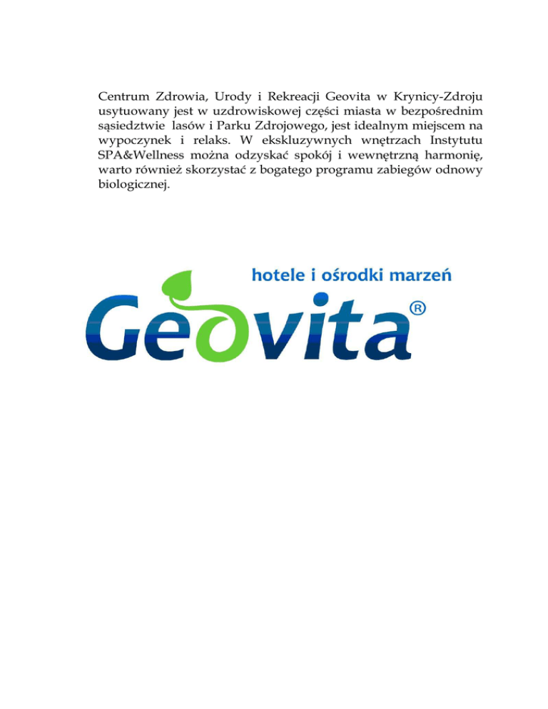Centrum Zdrowia, Urody i Rekreacji Geovita w Krynicy-Zdroju usytuowany jest w uzdrowiskowej części miasta w bezpośrednim sąsiedztwie lasów i Parku Zdrojowego, jest idealnym miejscem na wypoczynek i relaks. W ekskluzywnych wnętrzach Instytutu SPA&Wellness można odzyskać spokój i wewnętrzną harmonię, warto również skorzystać z bogatego programu zabiegów odnowy biologicznej.